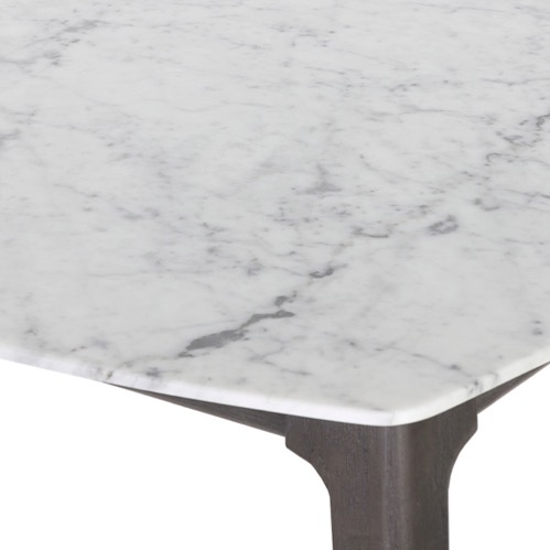 Mesa de comedor rectangular con sobre de mármol en color gris y patas de madera en color gris oscuro.