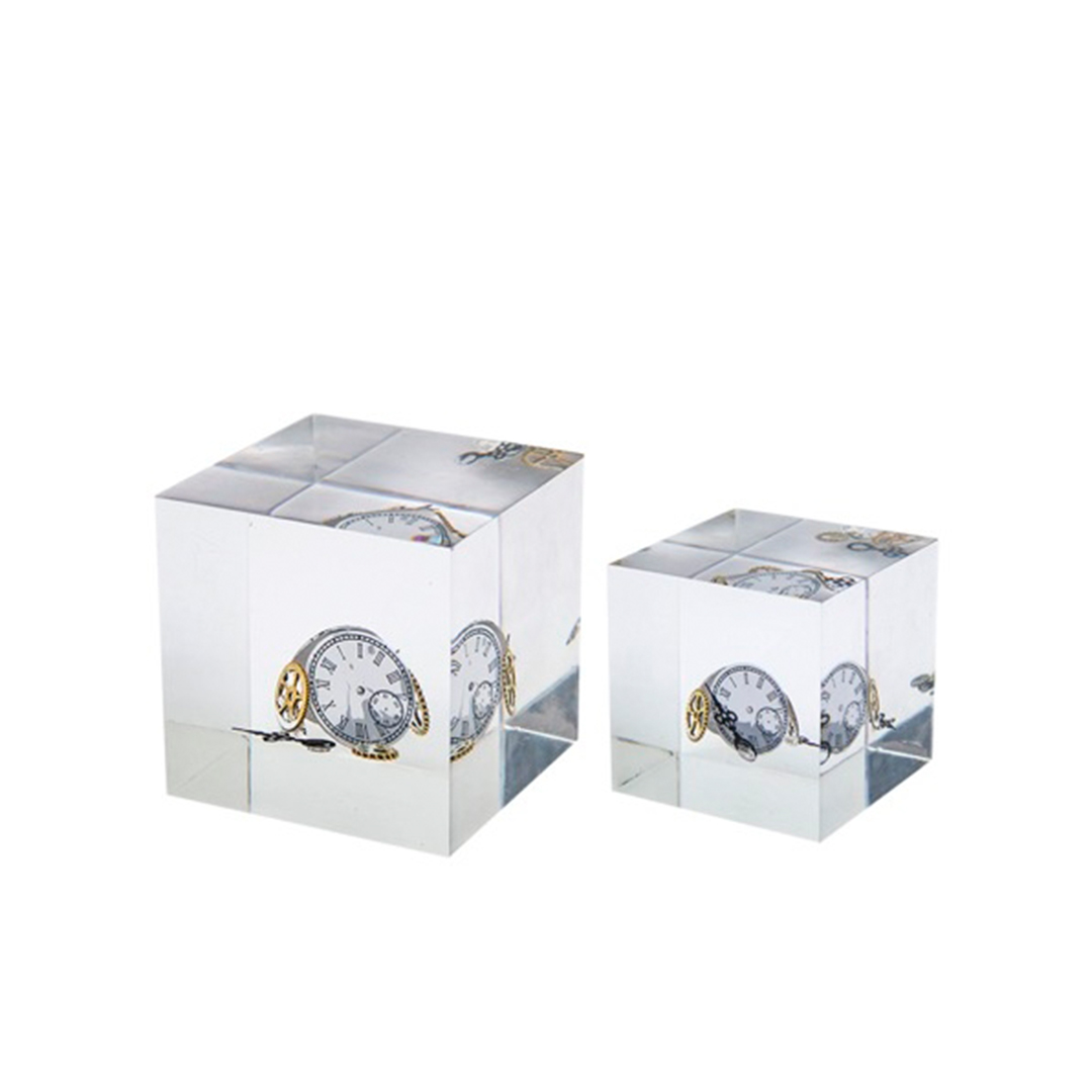 Adorno de mesa hecho de resina transparente con detalle de reloj de bolsillo en el interior.