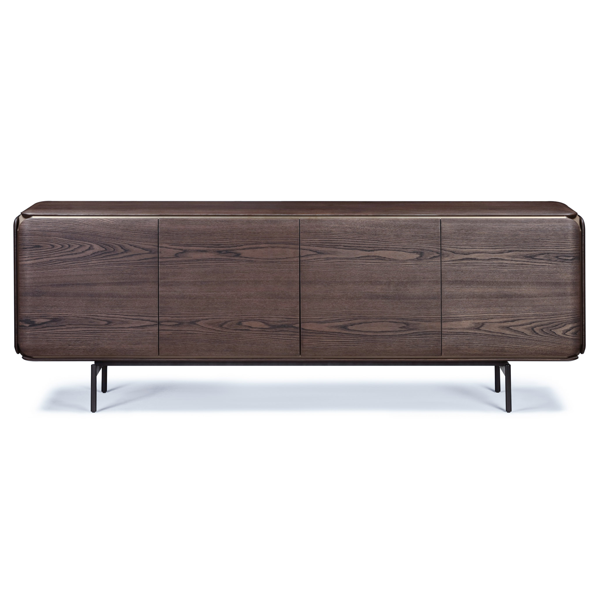 Una pieza con carácter y sofisticación. Su estructura en madera veneer oscuro con detalles en laca metálica aporta un brillo sutil y refinado. La base de metal negro mate equilibra el diseño con un toque moderno e industrial. Perfecta para realzar comedores y salas con un estilo elegante.