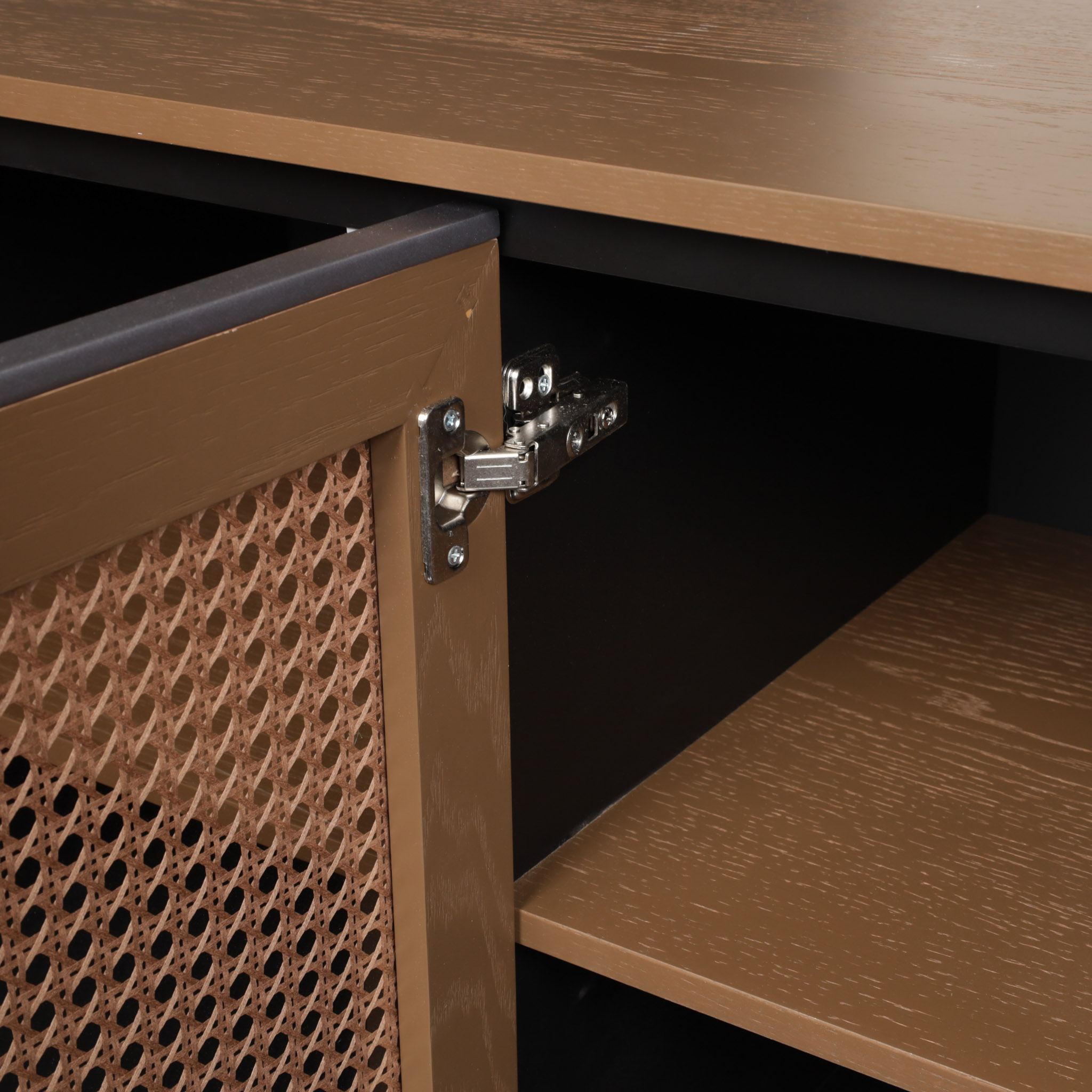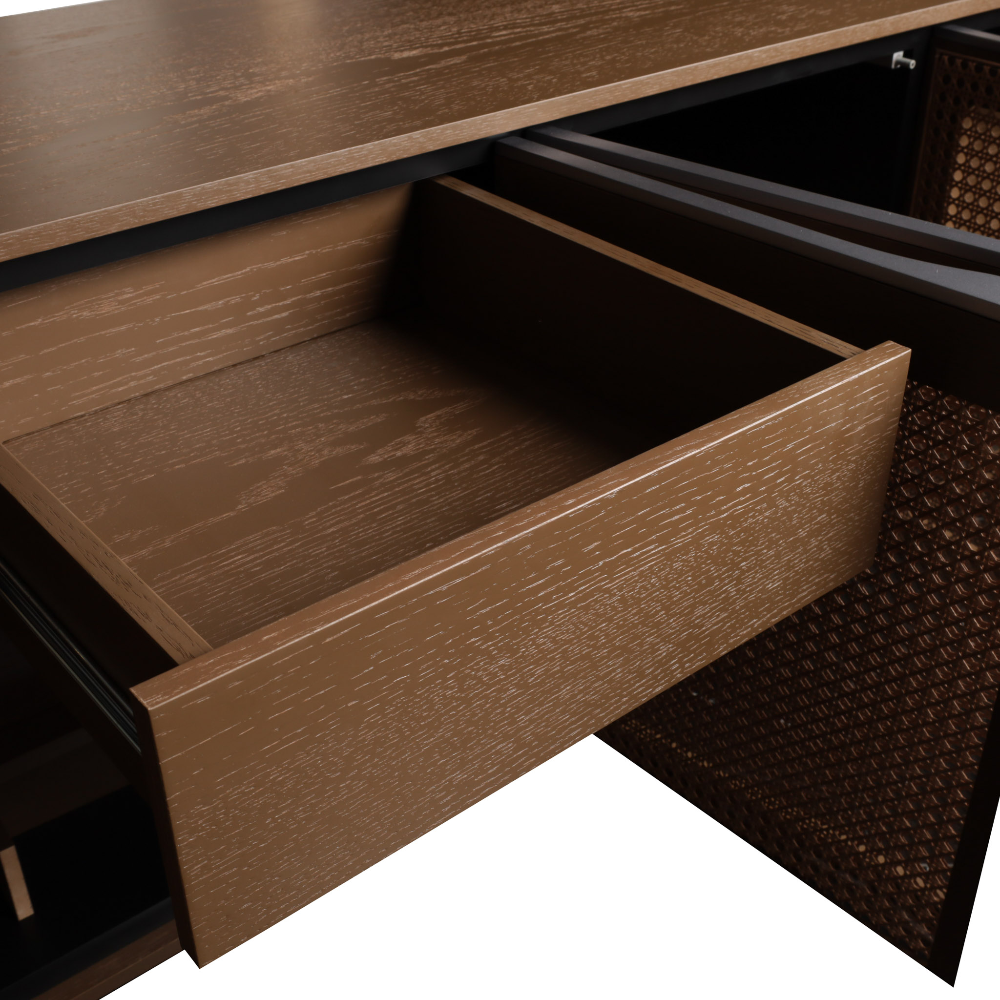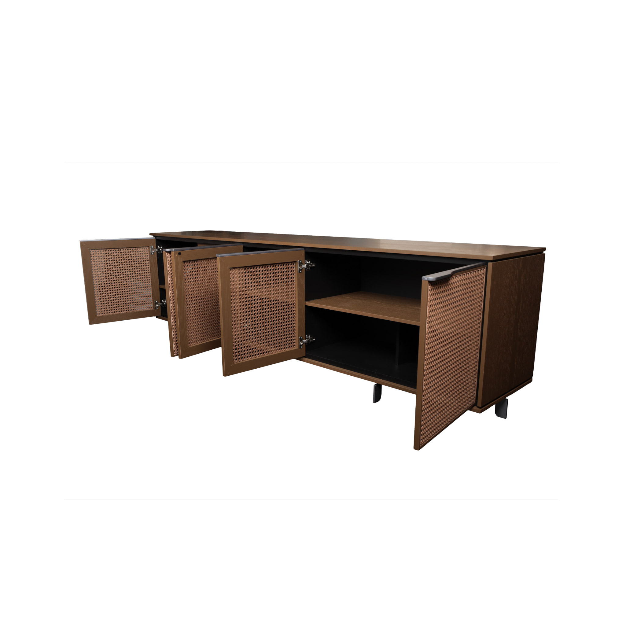 Un diseño que mezcla lo natural y lo moderno. Esta bufetera combina el cuerpo de roble chocolate con cinco puertas en rattán acabado nogal, ideal para interiores con carácter cálido y textura.