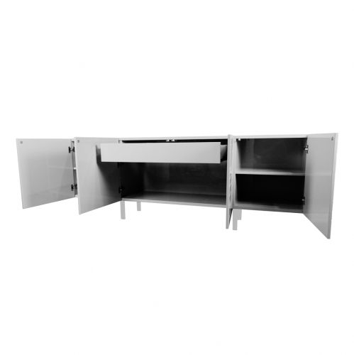 Bufetera de madera en color blanco con cuatro puertas y patas de metal.