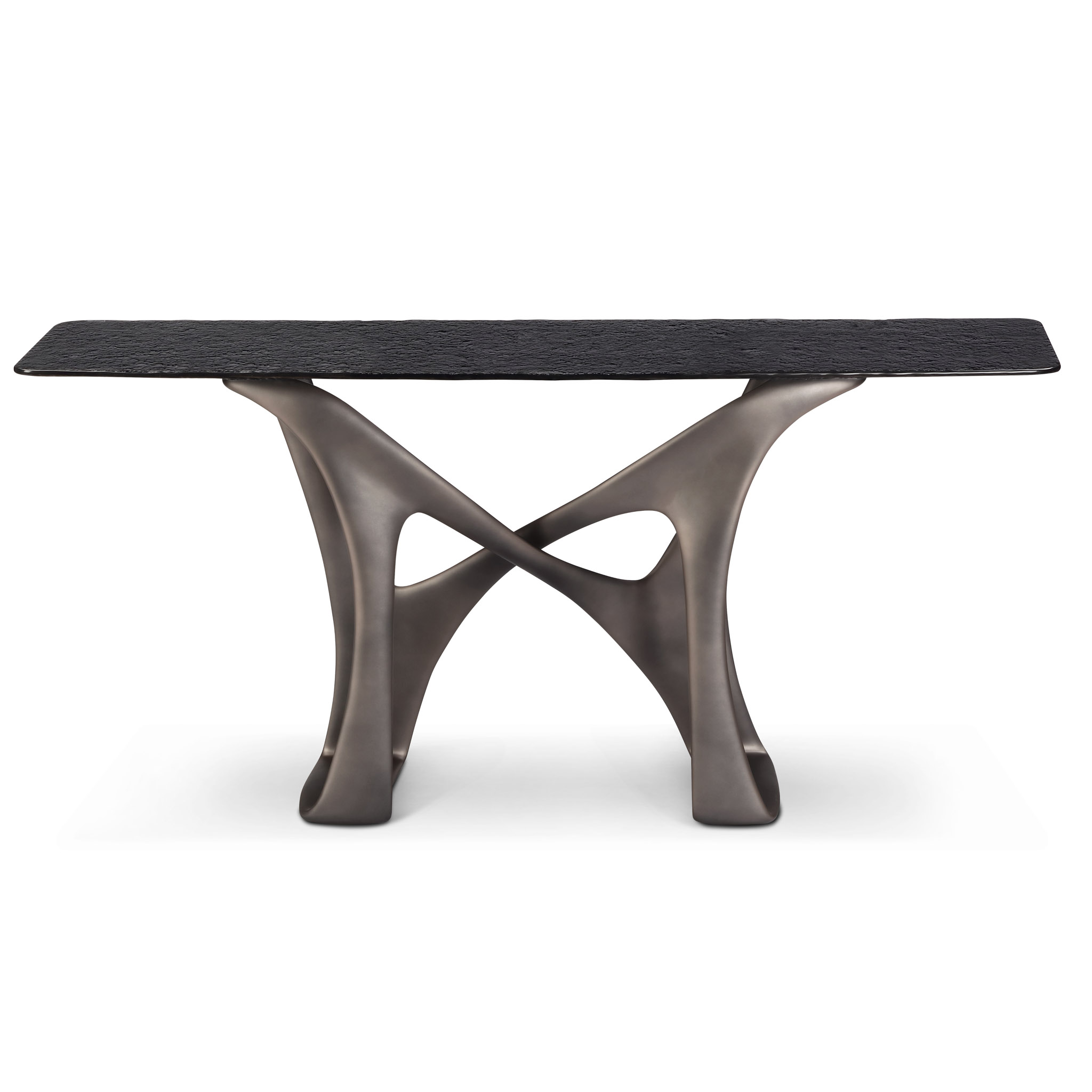 Minimalismo con un aire futurista. Su superficie de vidrio gris oscuro refleja luz y profundidad, mientras que la base de fibra de vidrio en tono titanio oscuro aporta un acabado moderno y vanguardista. Una pieza ideal para espacios con una estética sofisticada y de alto impacto.