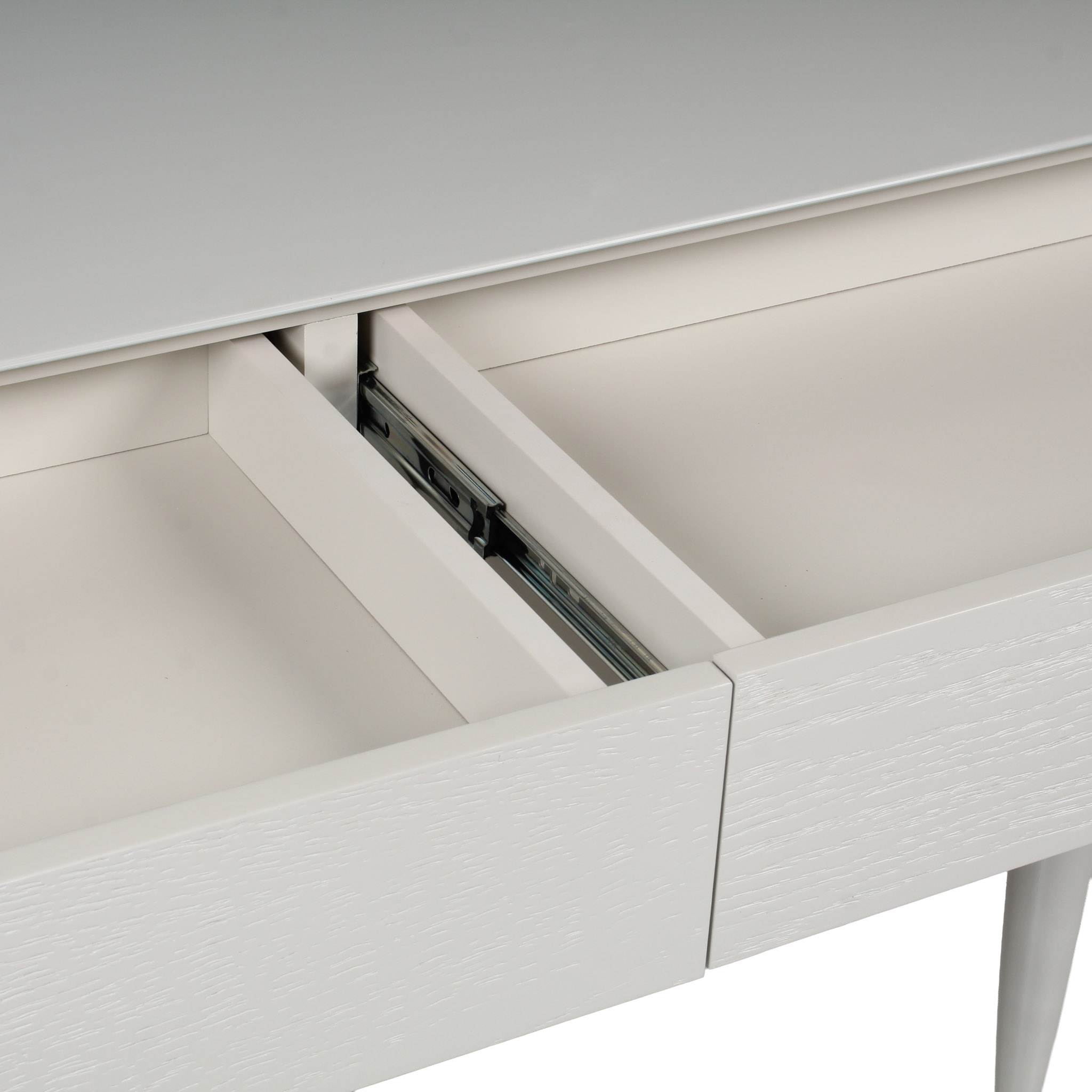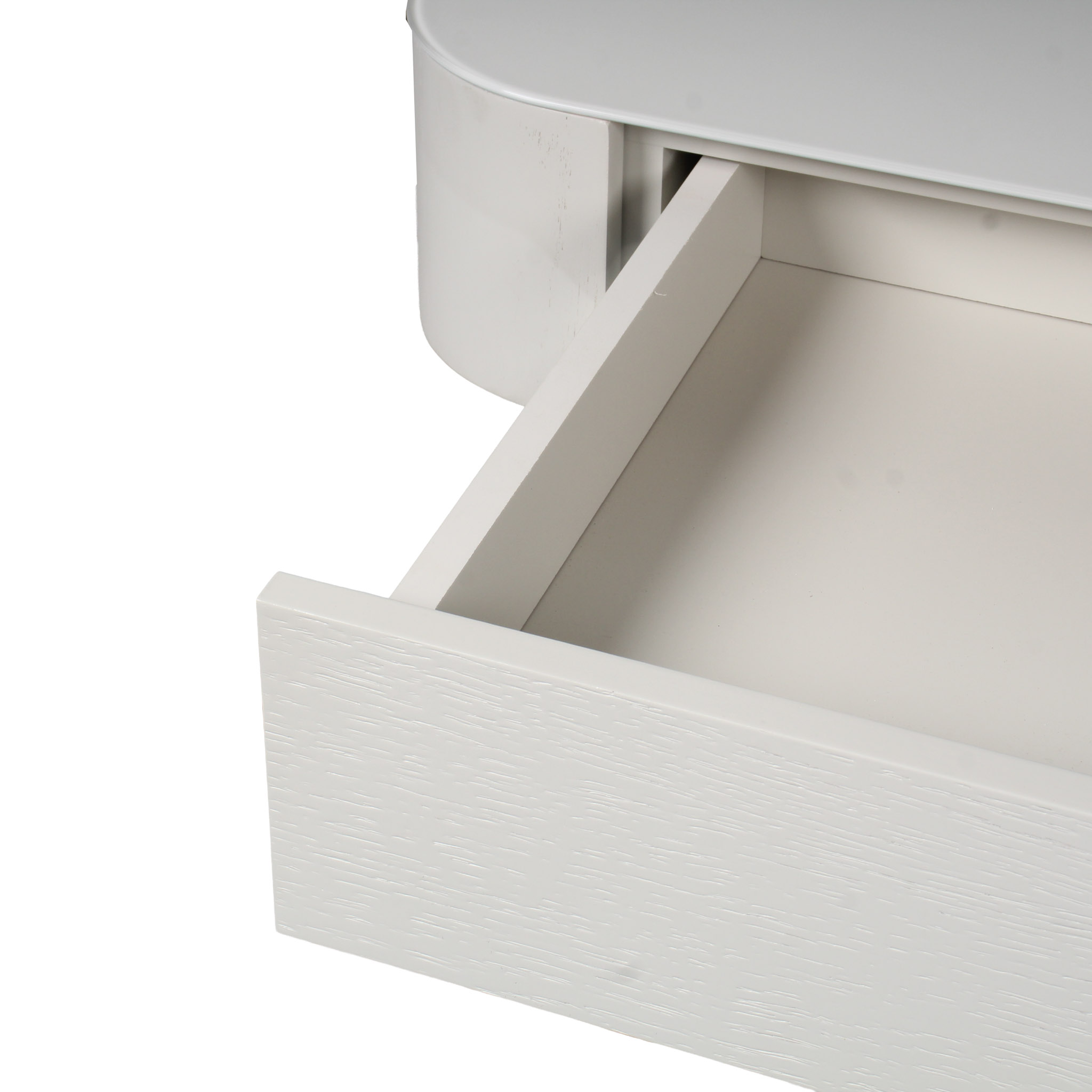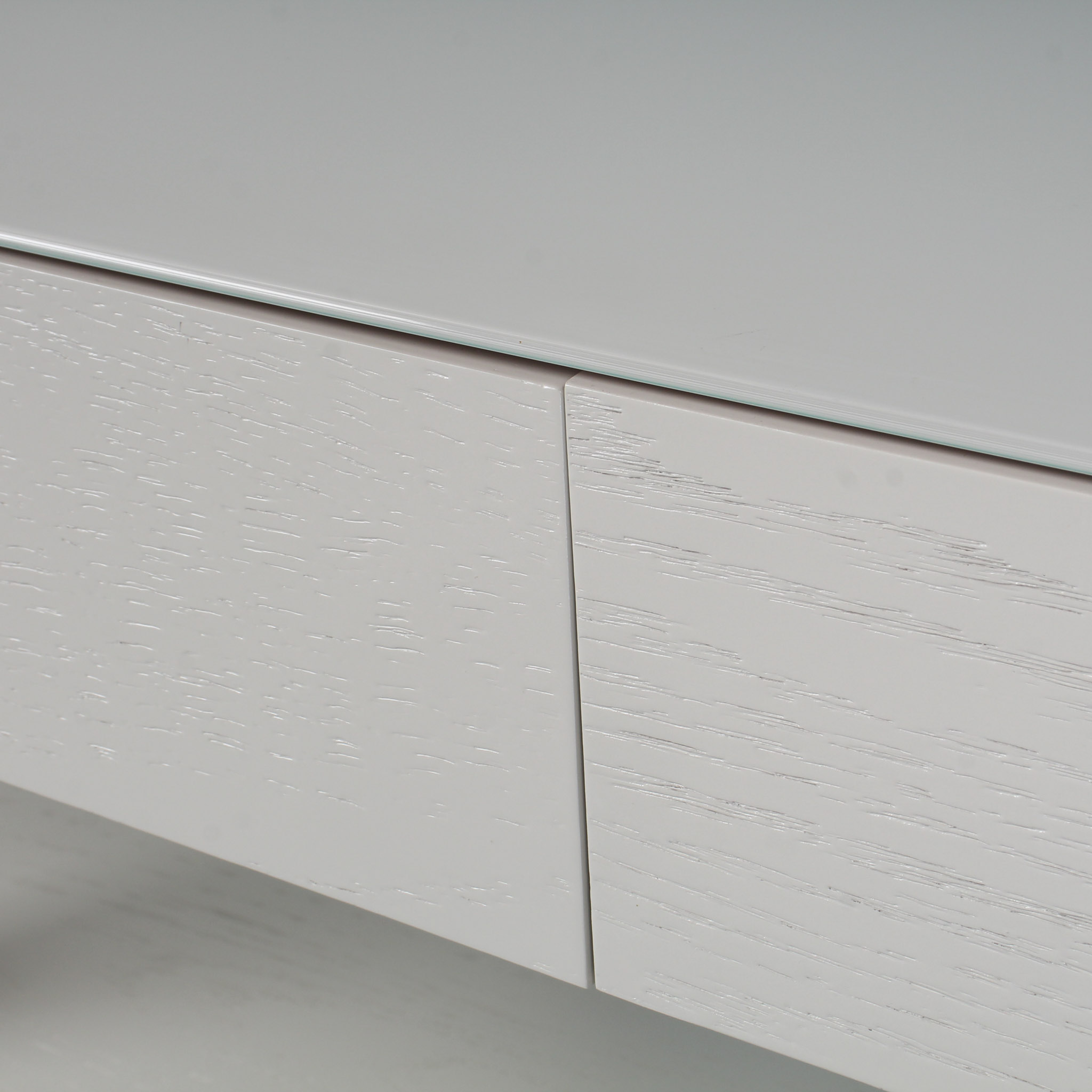 Con un diseño minimalista y refinado, esta consola en acabado off white aporta luminosidad y frescura a cualquier espacio. Su sobre de vidrio mate en el mismo tono crea una superficie suave y elegante, ideal para complementar la decoración con un toque contemporáneo. Perfecta para recibidores, salas o pasillos, combina practicidad con un estilo limpio y sofisticado.