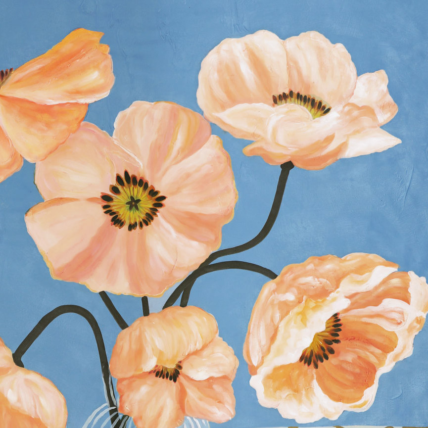 Este cuadro al óleo presenta un delicado arreglo de flores en tono peach, sobre un fondo celeste que aporta frescura y luminosidad. Las hojas en tonos chocolate añaden contraste y profundidad, creando una composición armónica y atractiva. El marco en madera natural complementa la obra con calidez y un toque orgánico, ideal para dar un aire elegante y acogedor a salas, comedores o dormitorios.