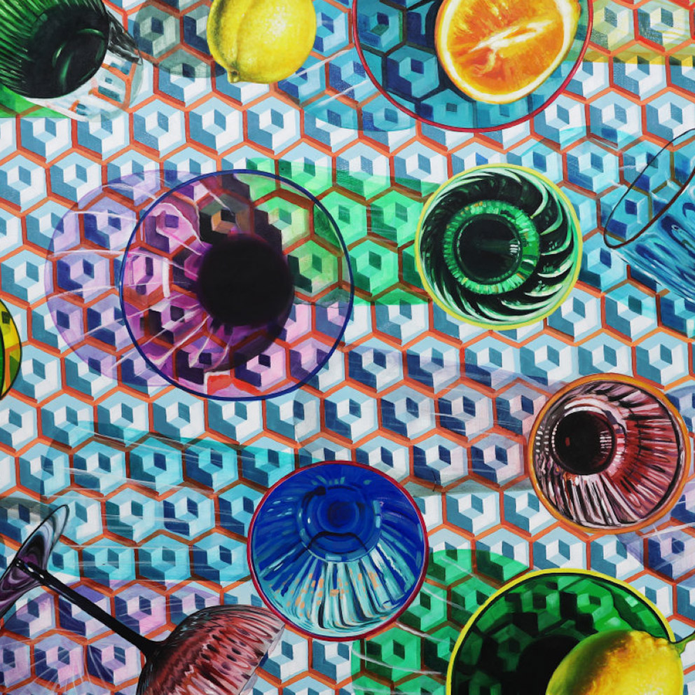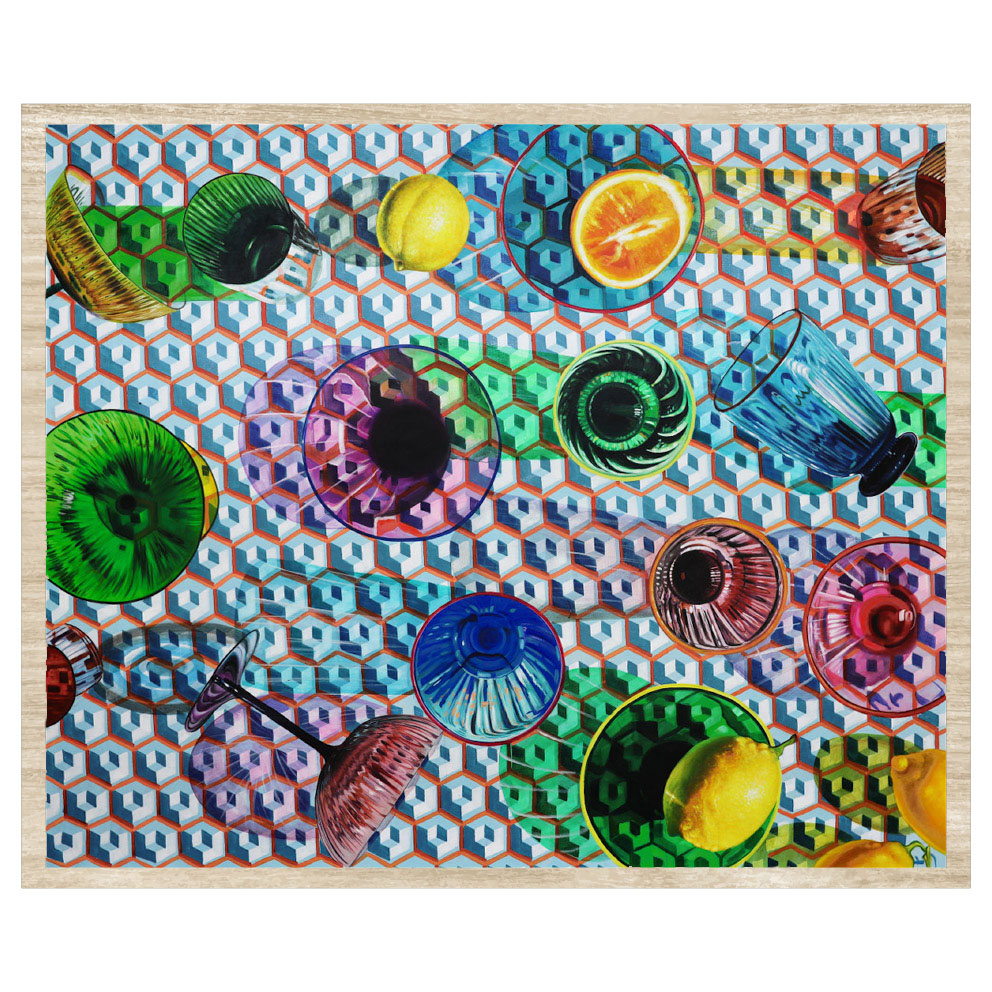 Este cuadro al óleo presenta una composición fresca y vibrante con copas en distintos colores acompañadas de limones, creando un contraste lleno de vida. El marco en tono madera aporta calidez y enmarca la obra con un toque natural, realzando los detalles y matices de la pintura.