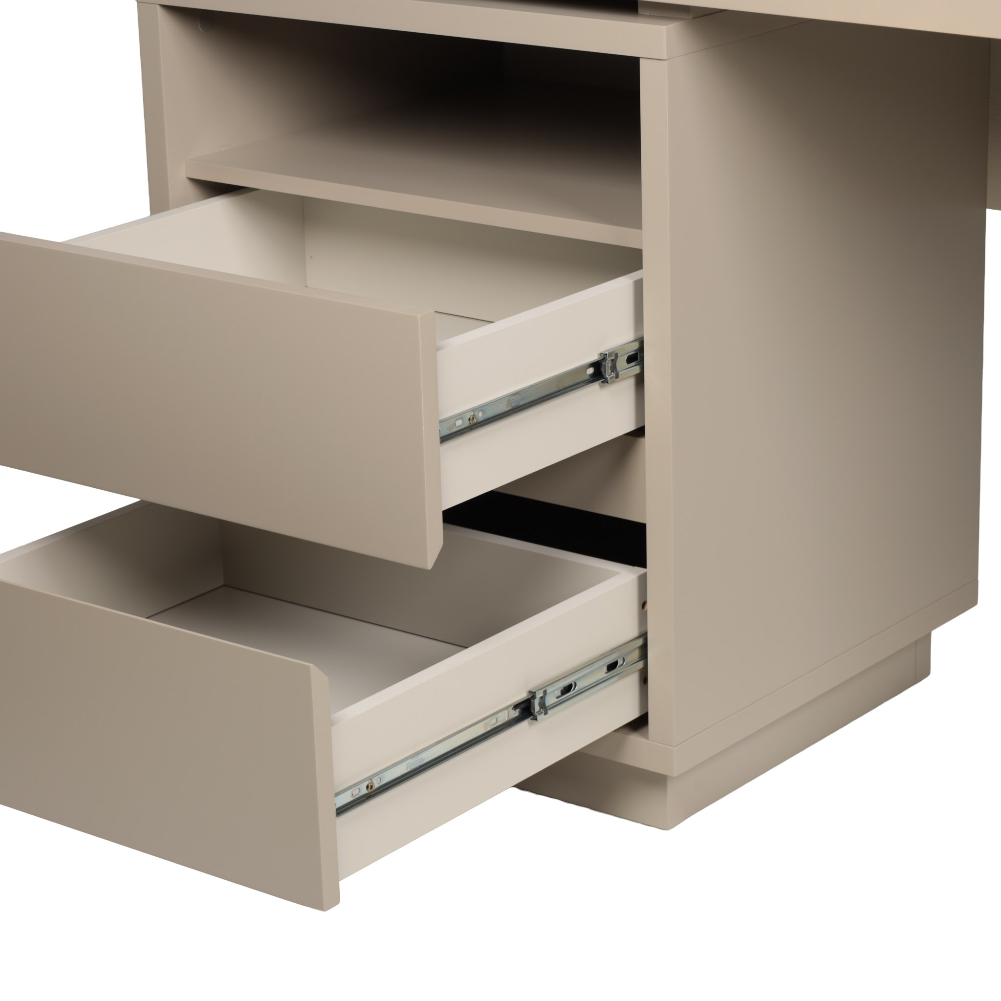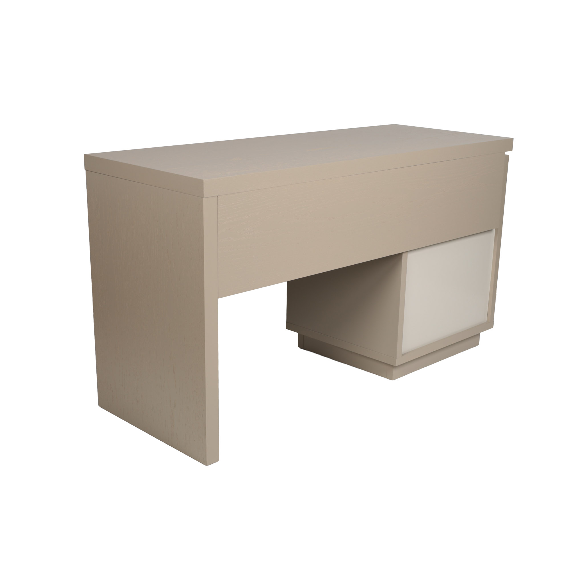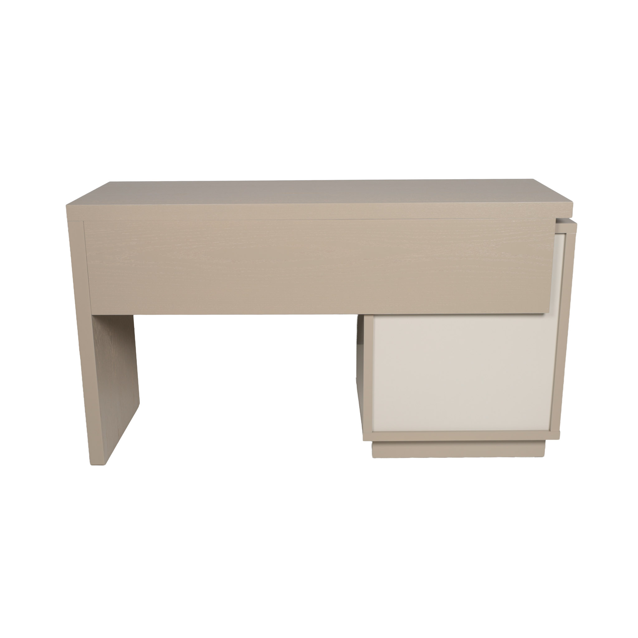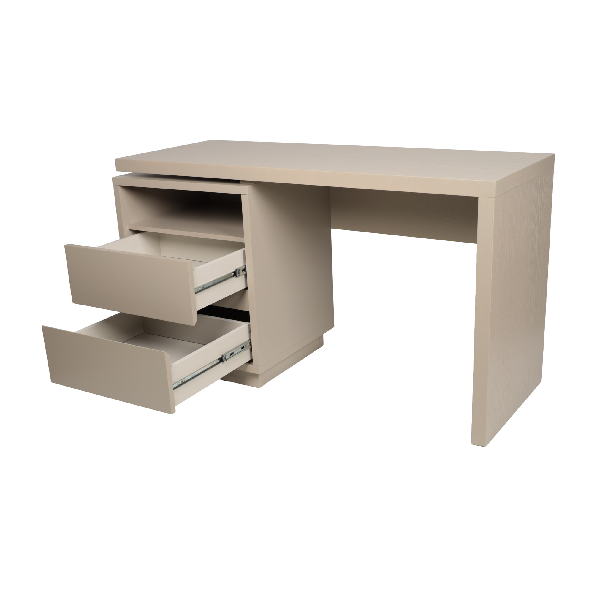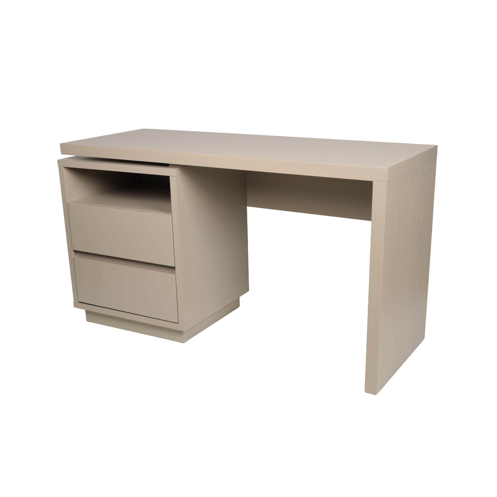 Escritorio de madera roble en tono corda laqueado satinado con dos gavetas y un cajón.