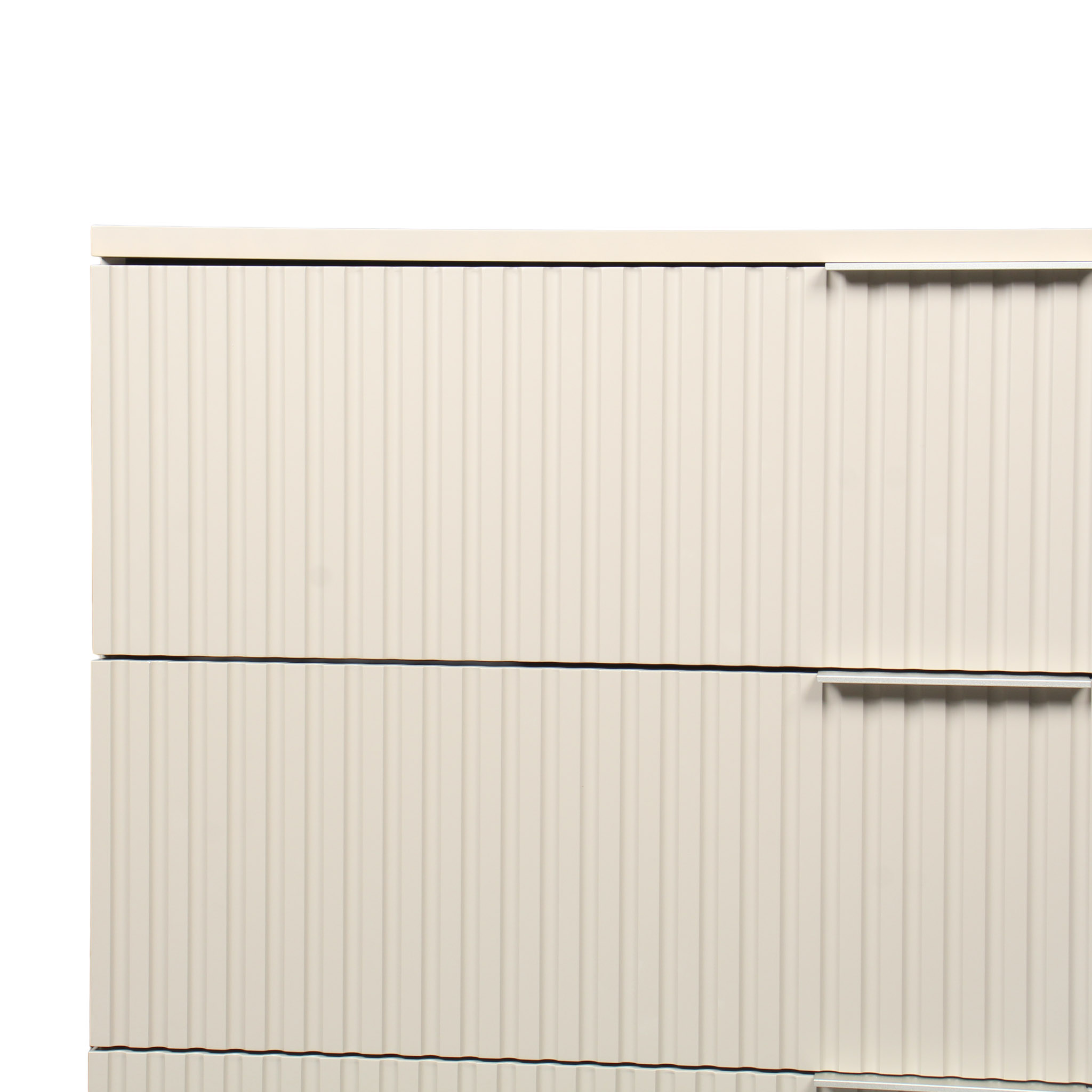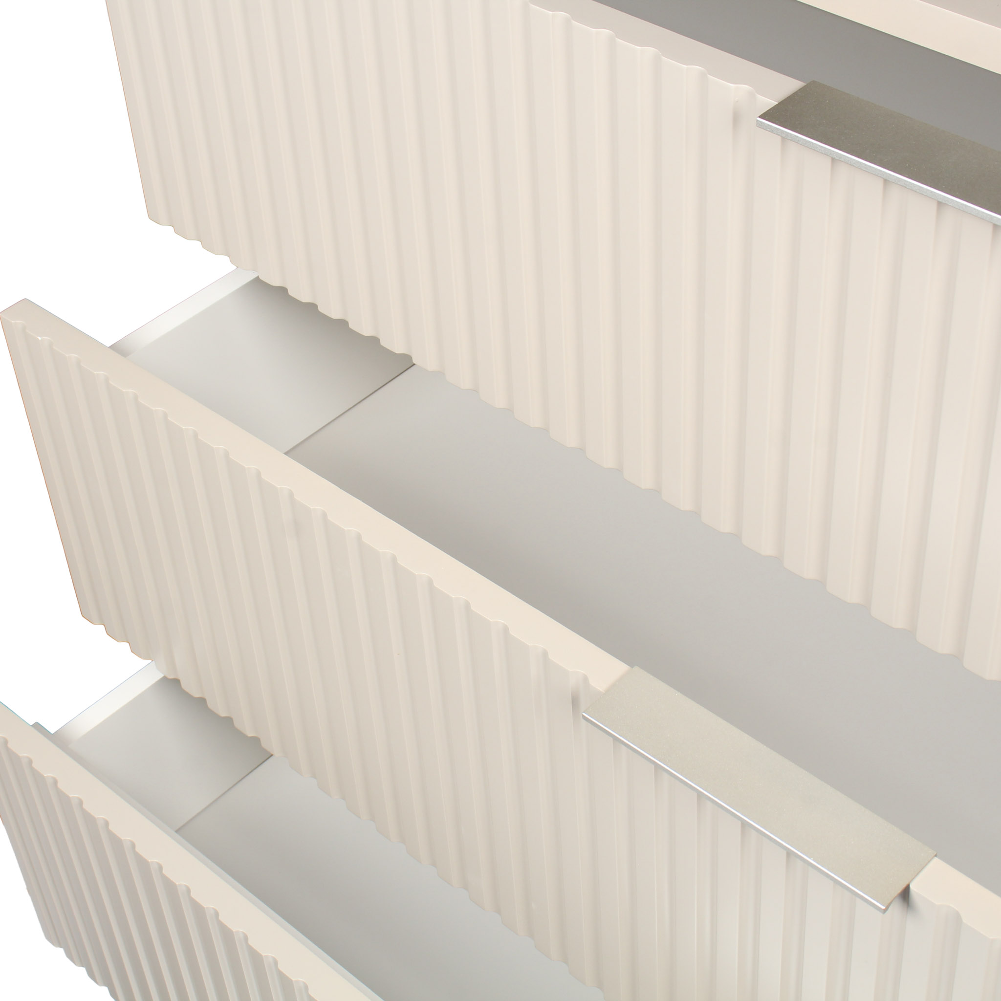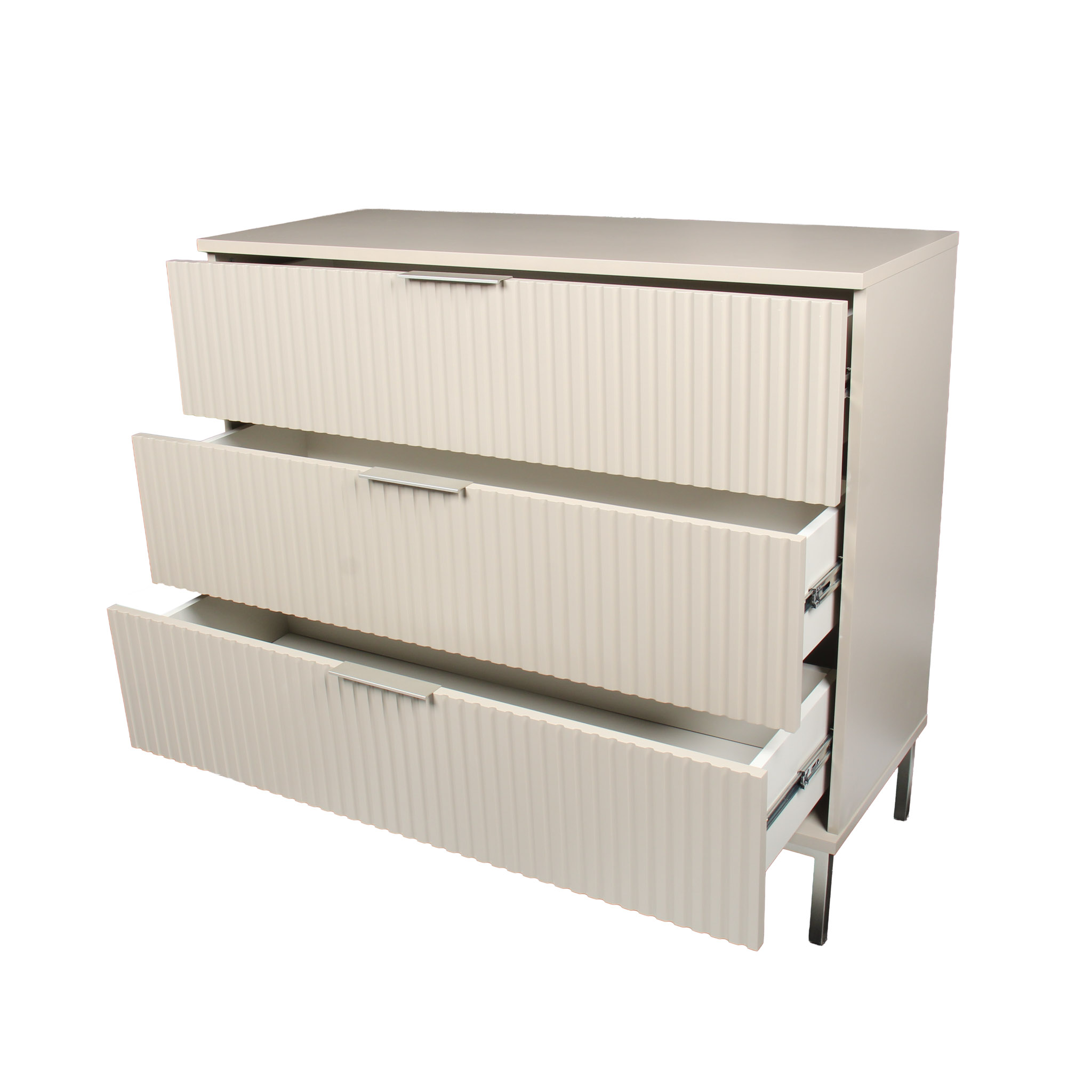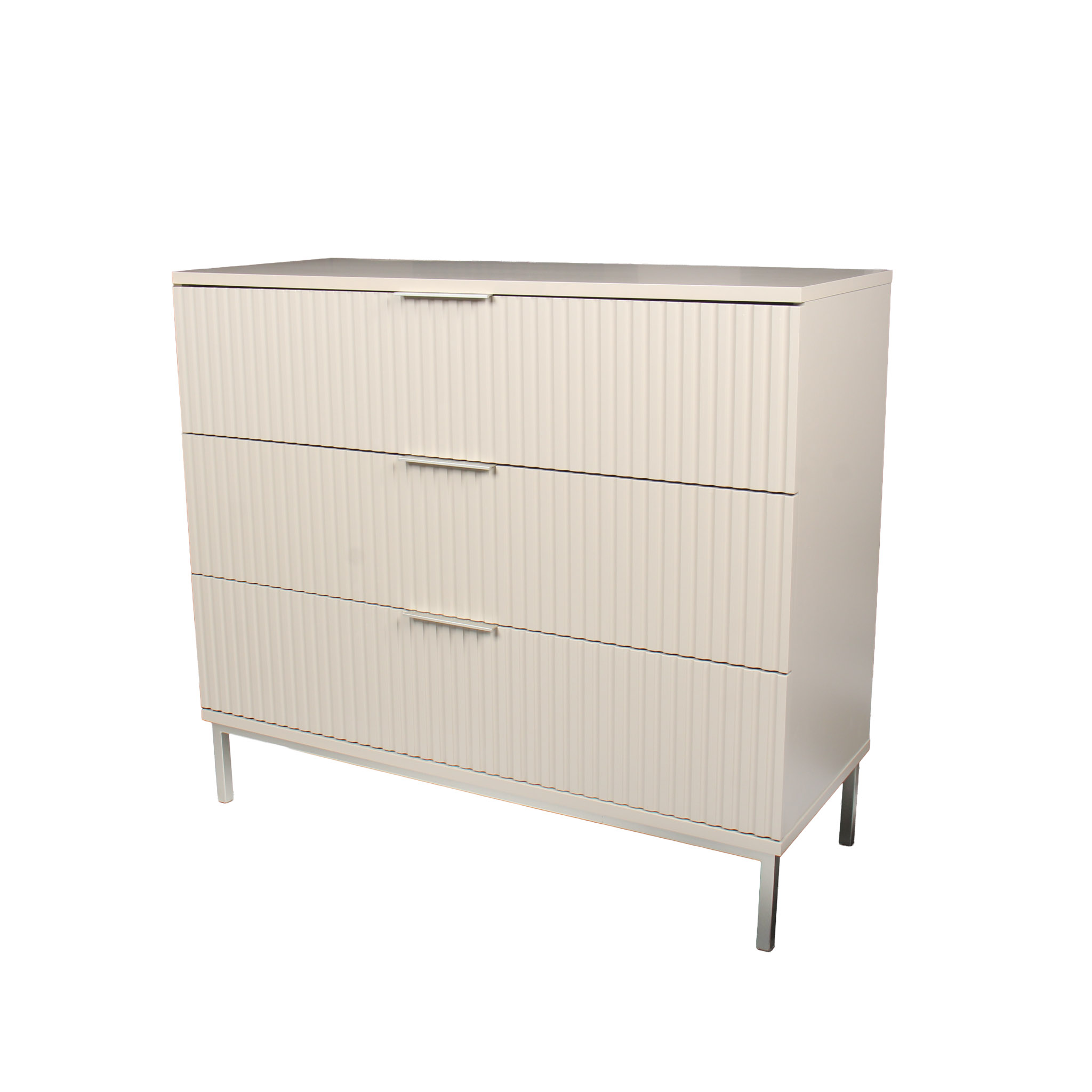 Gavetero de madera en color corda con tres gavetas y patas de acero en color champaña.