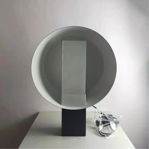 Lámpara de mesa con base y mampara de metal en tono gris oscuro.