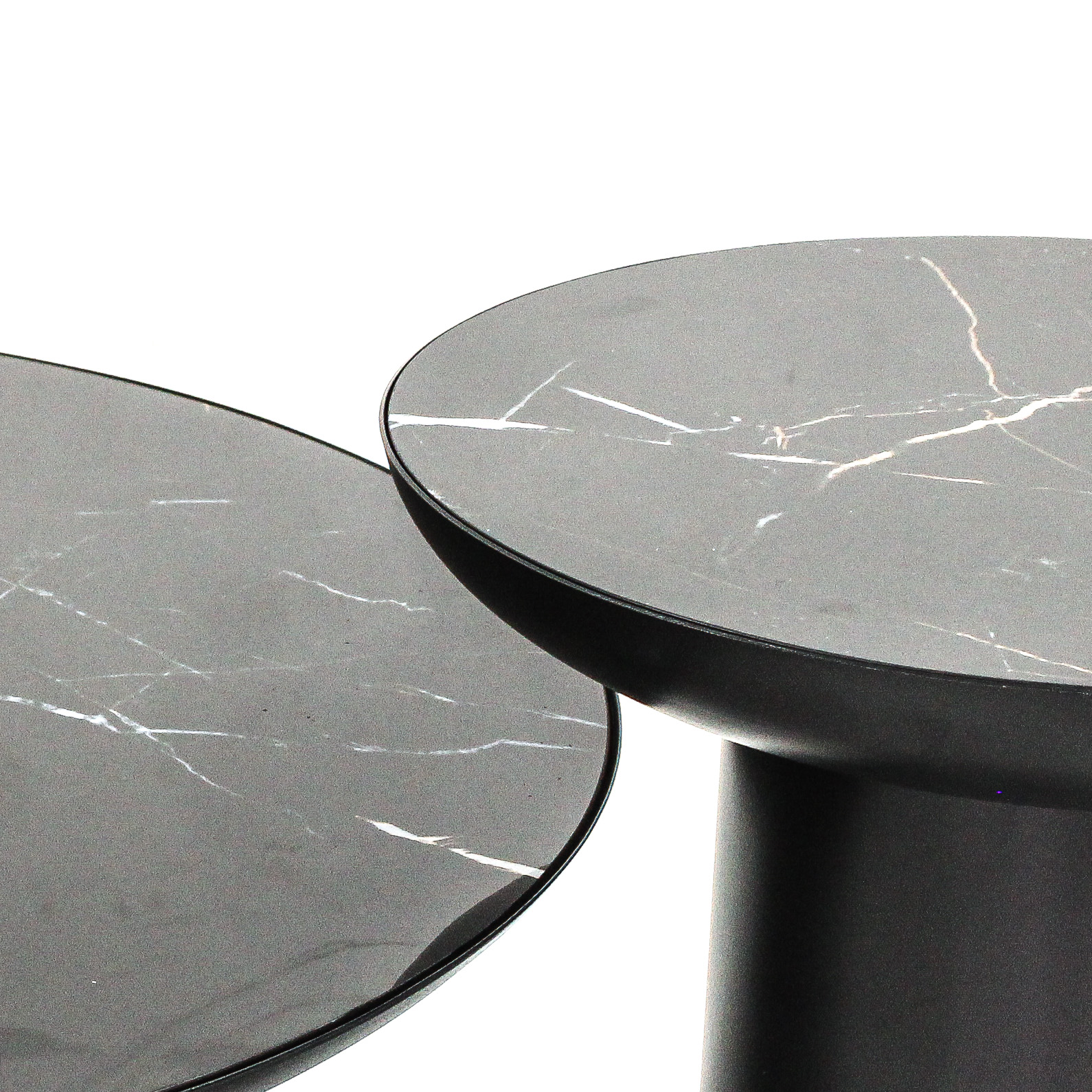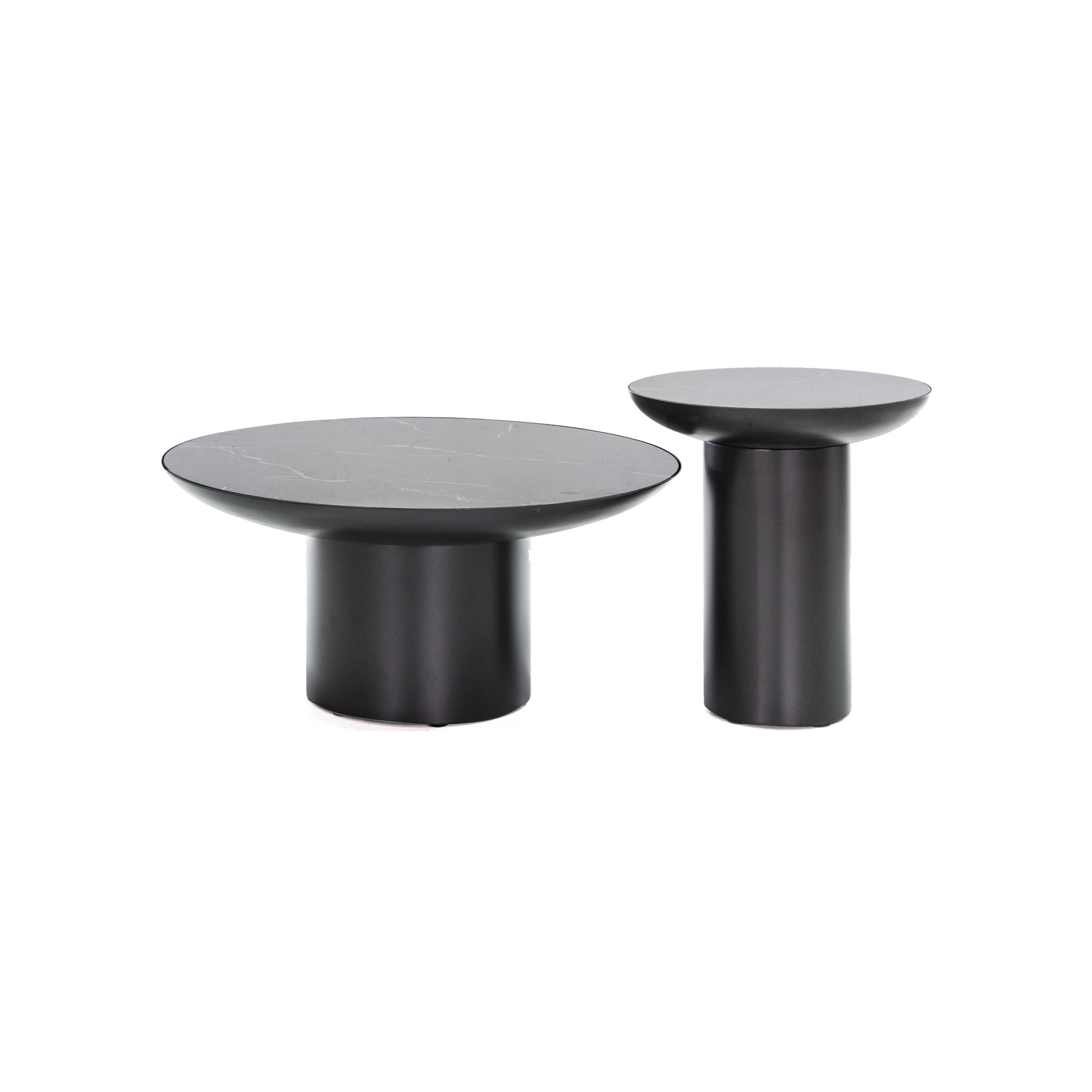 Set de dos mesas de centro con elegantes sobres de porcelana negra y robustas bases de metal negro. Este diseño moderno y sofisticado es perfecto para cualquier sala de estar, añadiendo un toque de lujo y estilo contemporáneo a tu espacio.