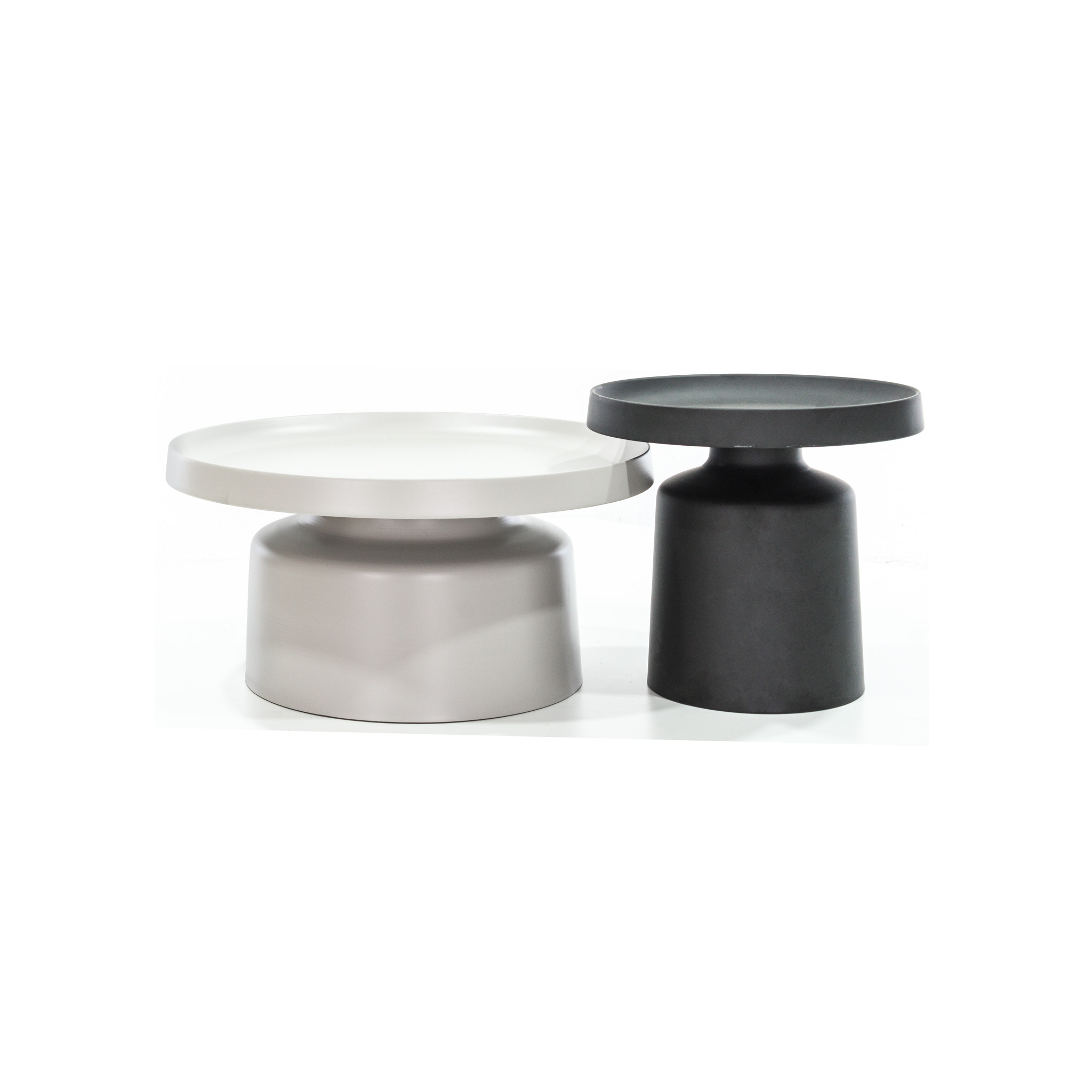 Set de dos mesas de centro redondas fabricadas en metal con un elegante acabado en caqui y negro. Este diseño moderno y versátil es ideal para cualquier sala de estar, añadiendo un toque de estilo contemporáneo y sofisticado a tu espacio.