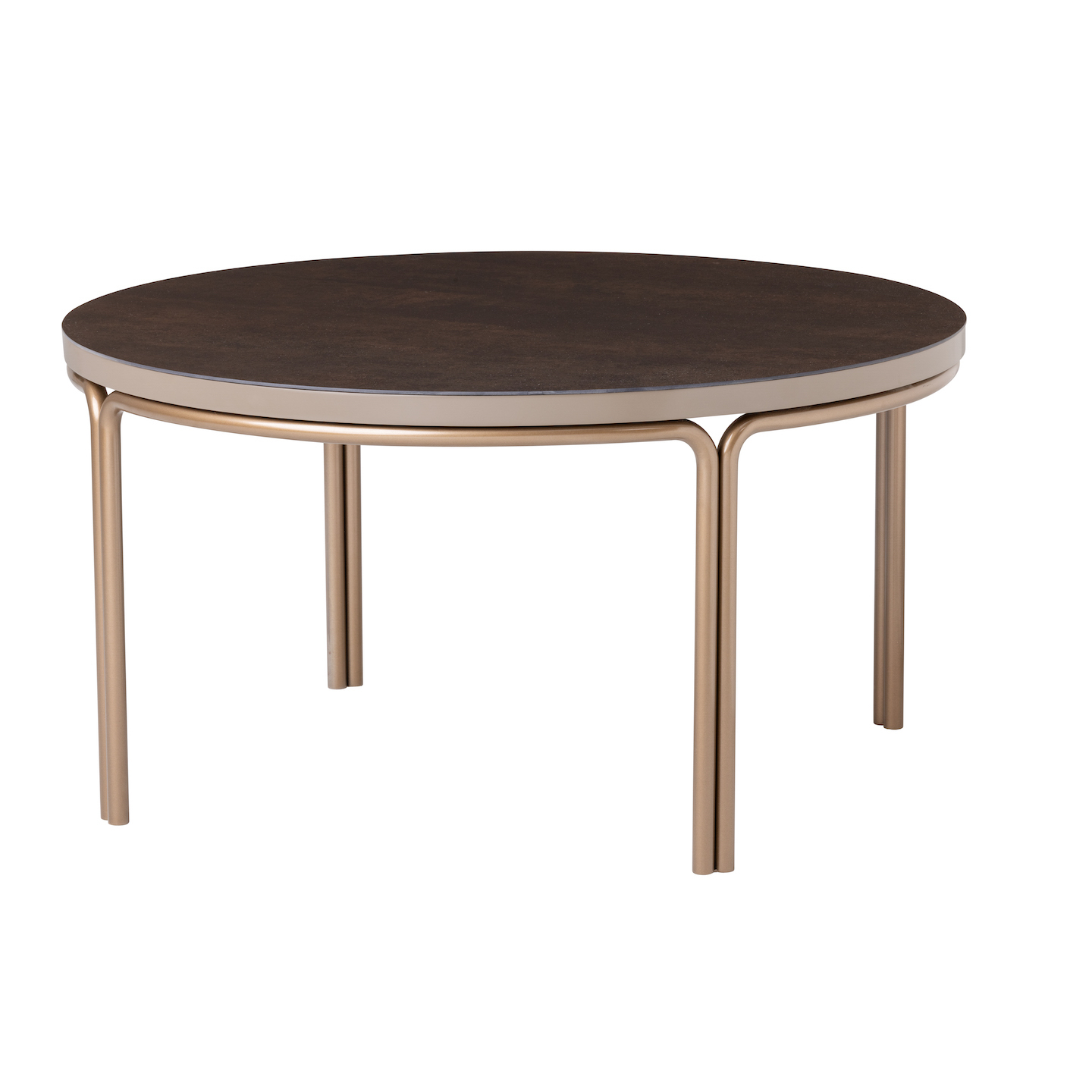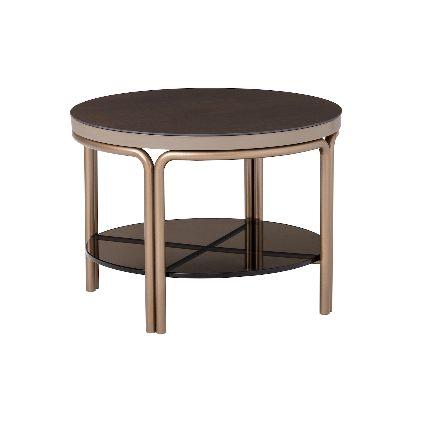 Set de 2 mesas de centro redondas con sobres en madera y vidrio color chocolate, y patas de metal en acabado Lux Bronze. Diseño elegante y funcional, ideal para añadir un toque moderno y sofisticado a tu sala.