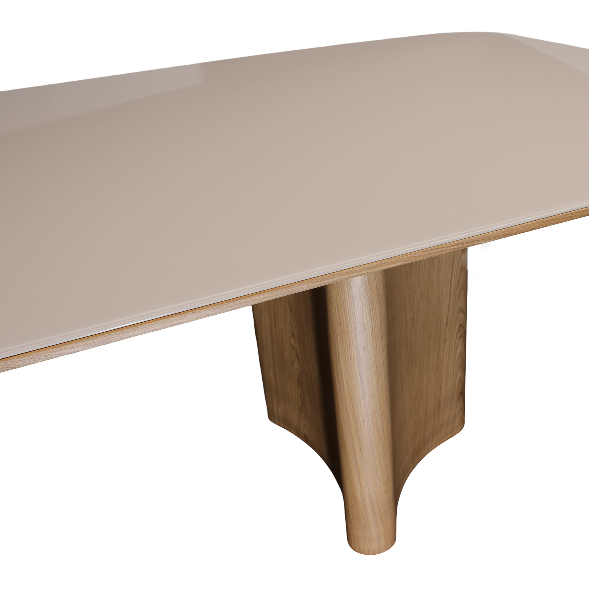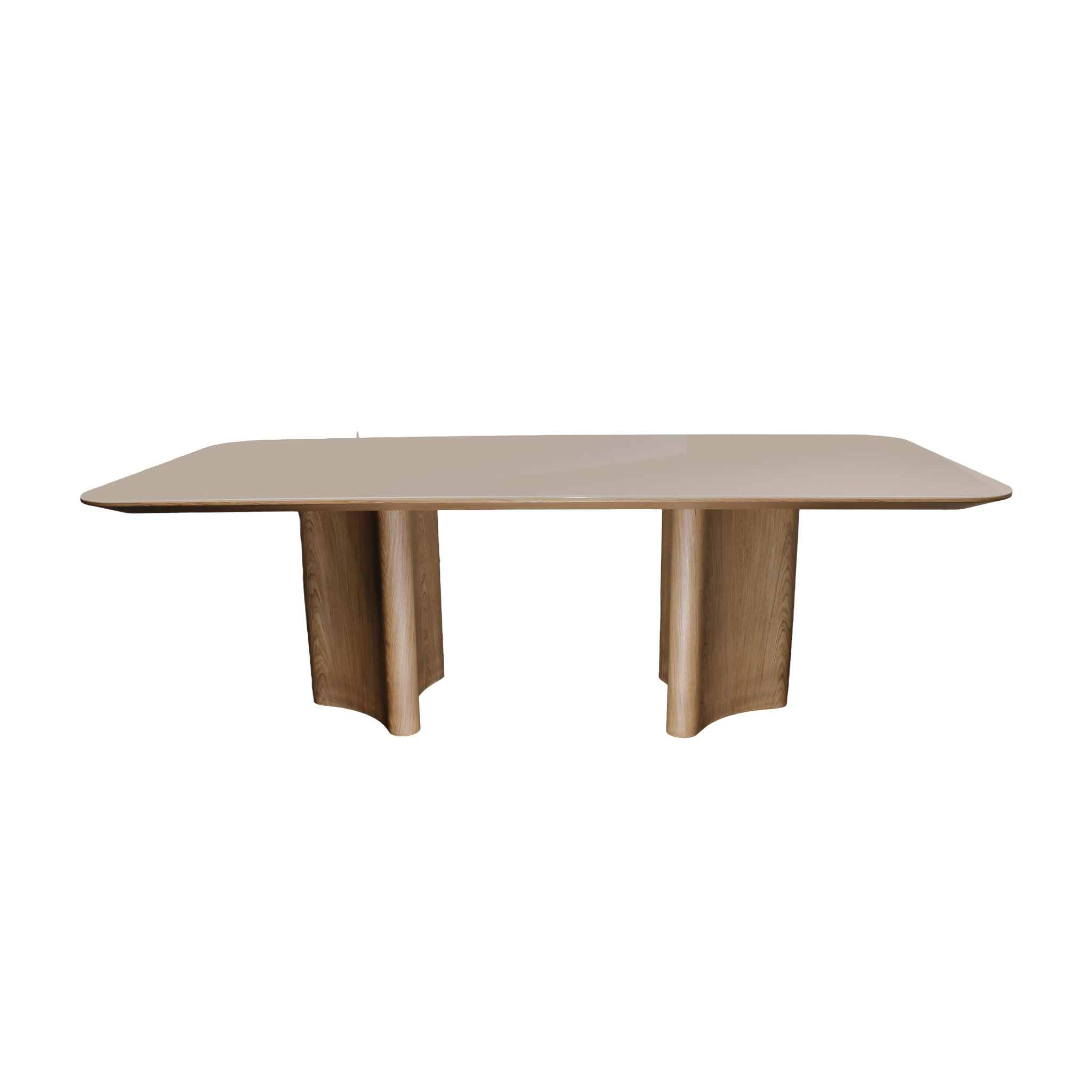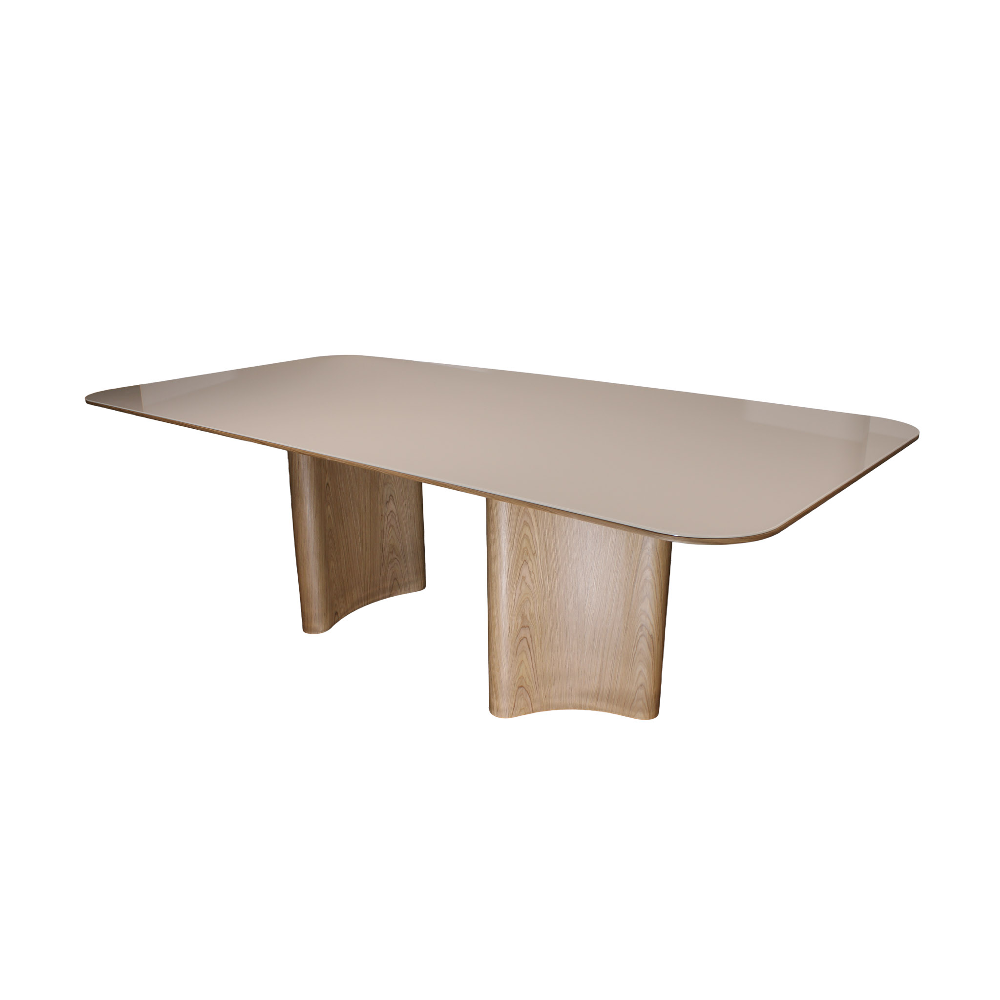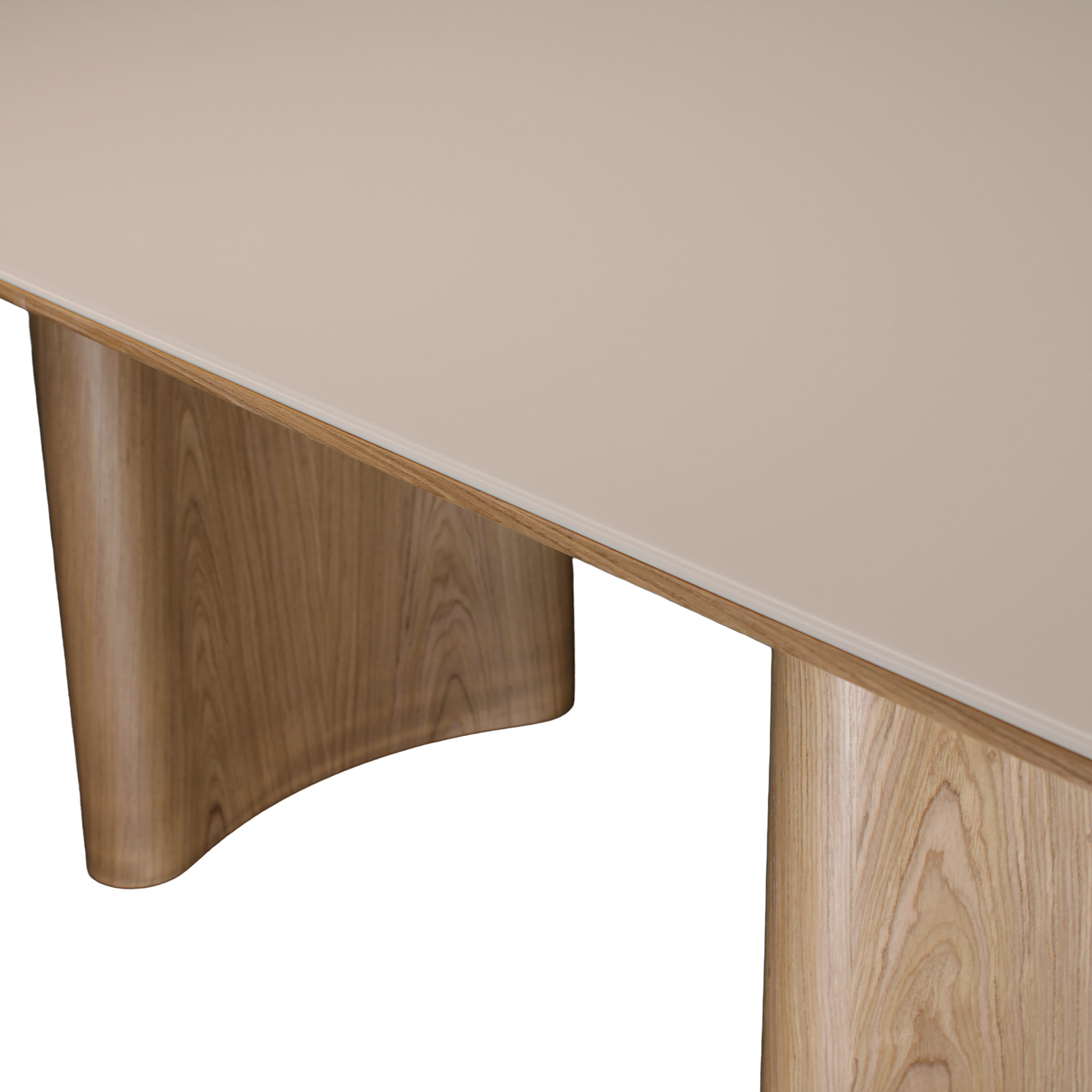Diseño lineal, expresión orgánica. La mesa Antares aporta una estética relajada con sofisticación natural. Su cuerpo en madera laurel almendra y el sobre en vidrio laqueado arena logran una pieza visualmente suave, ideal para comedores minimalistas, nórdicos o de estilo slow living. Una mesa que transmite calma sin perder presencia.