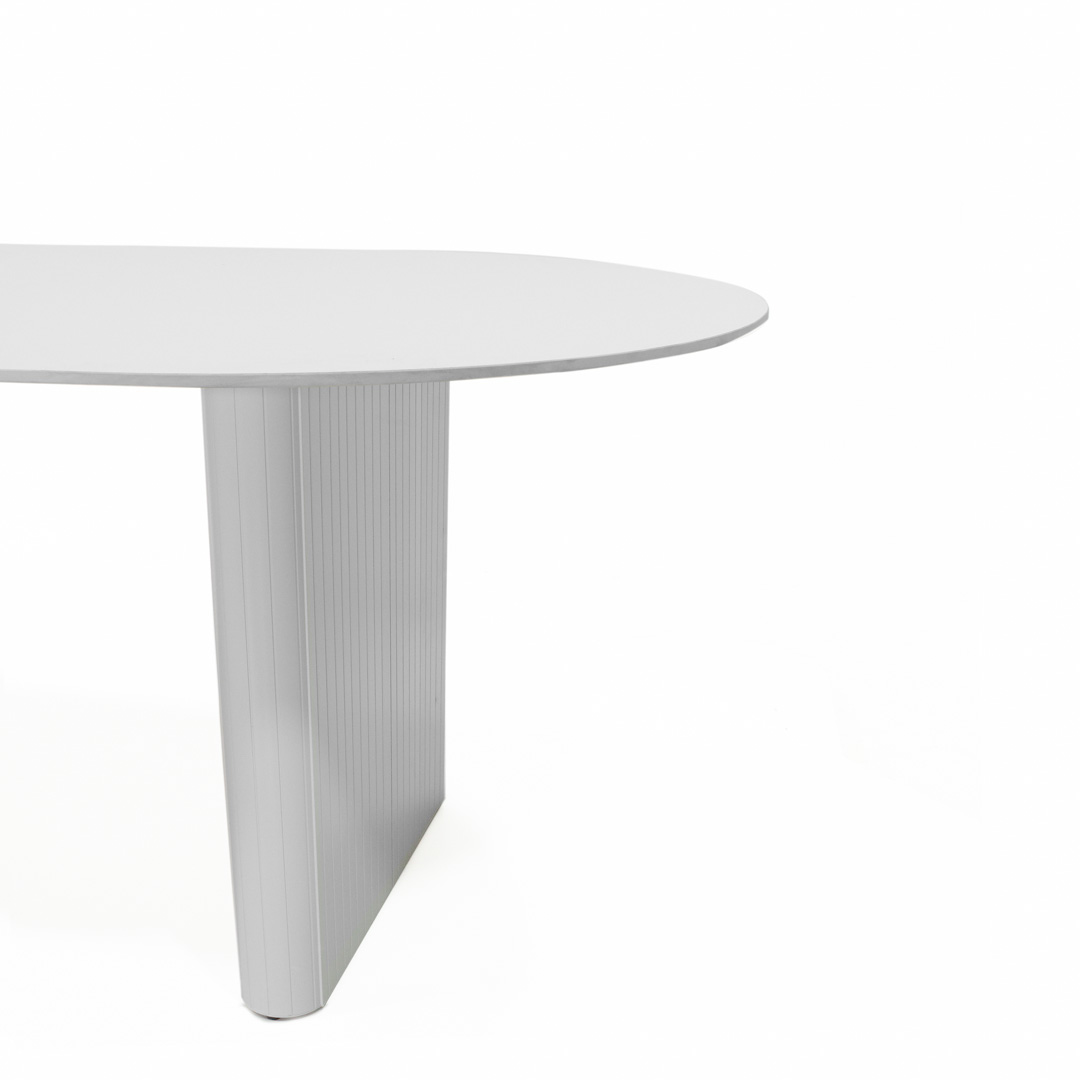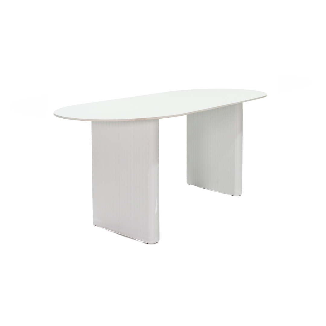 Esta mesa combina la belleza natural de un sobre de piedra blanco con la fortaleza industrial de una base de metal blanco, perfecta para áreas de comedor contemporáneas.