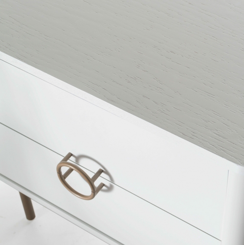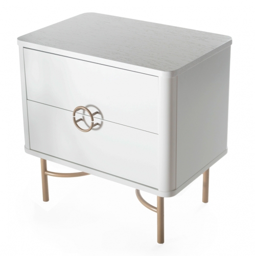Mesa de noche de madera en color off white con dos gavetas, y con tiradores y patas de metal en color dorado.