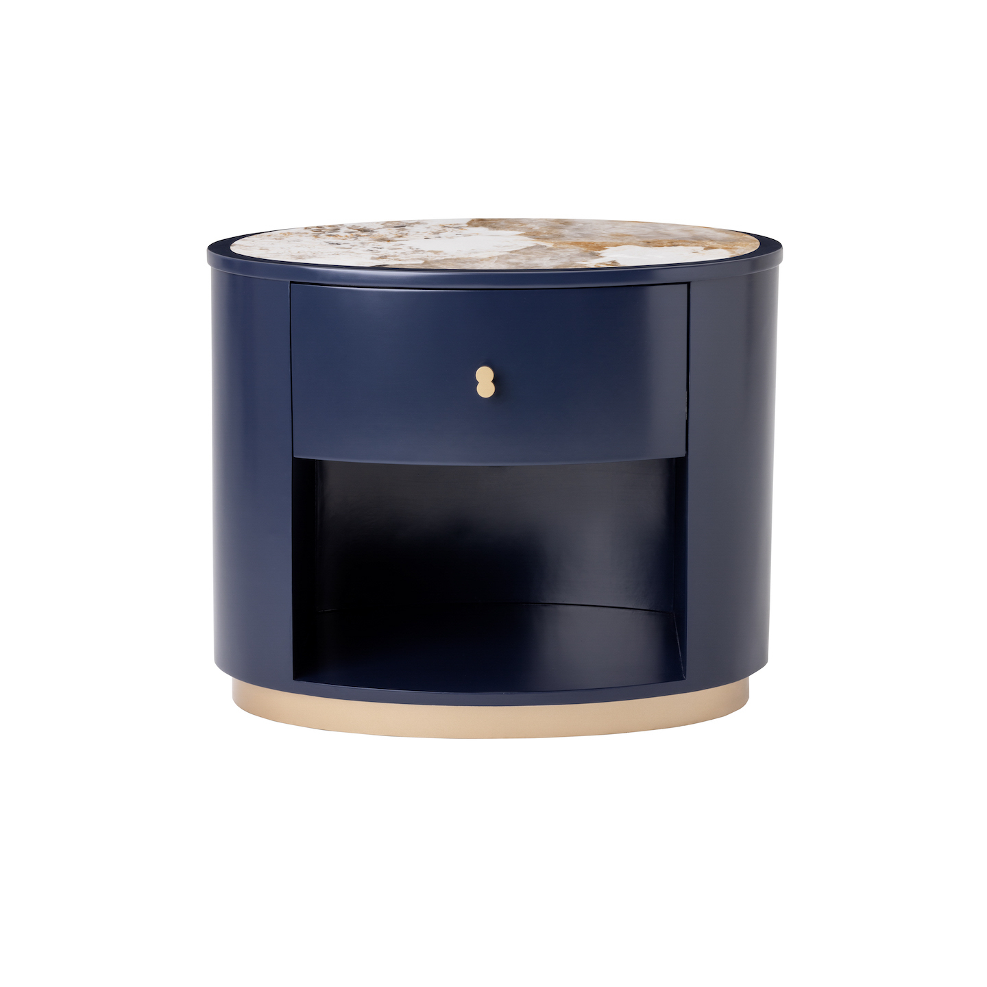 La mesa de noche modelo Maxine en madera Urban azul con sobre de cerámica y patas de metal Lux en tono champaña es una pieza compacta y elegante. Su mezcla de materiales aporta carácter y modernidad, perfecta para complementar cualquier dormitorio con estilo.