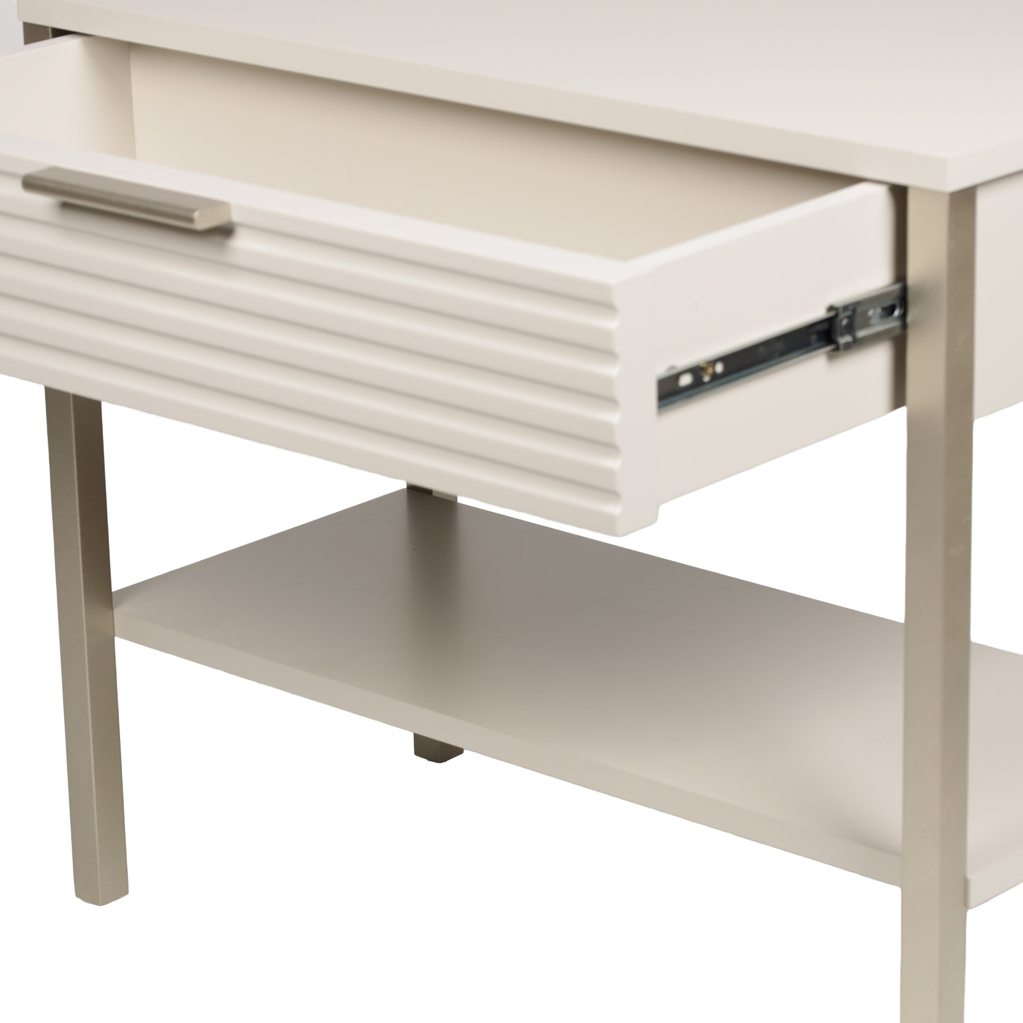 Mesa de noche de madera en tono off white satinado, con una gaveta y patas en tono champaña.