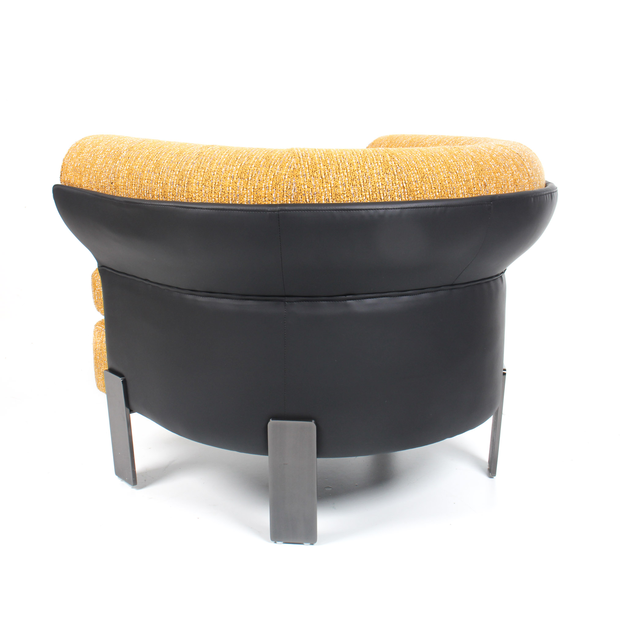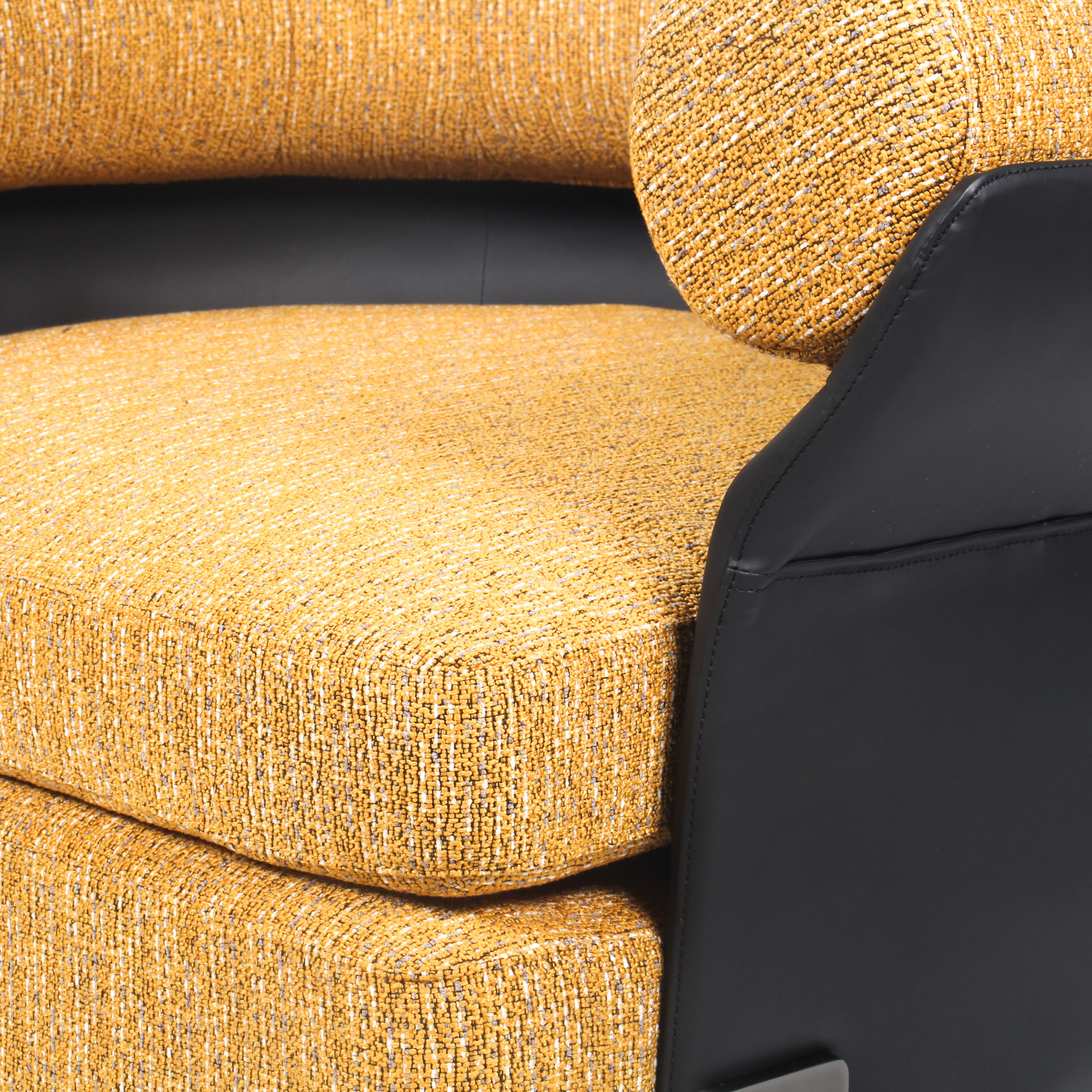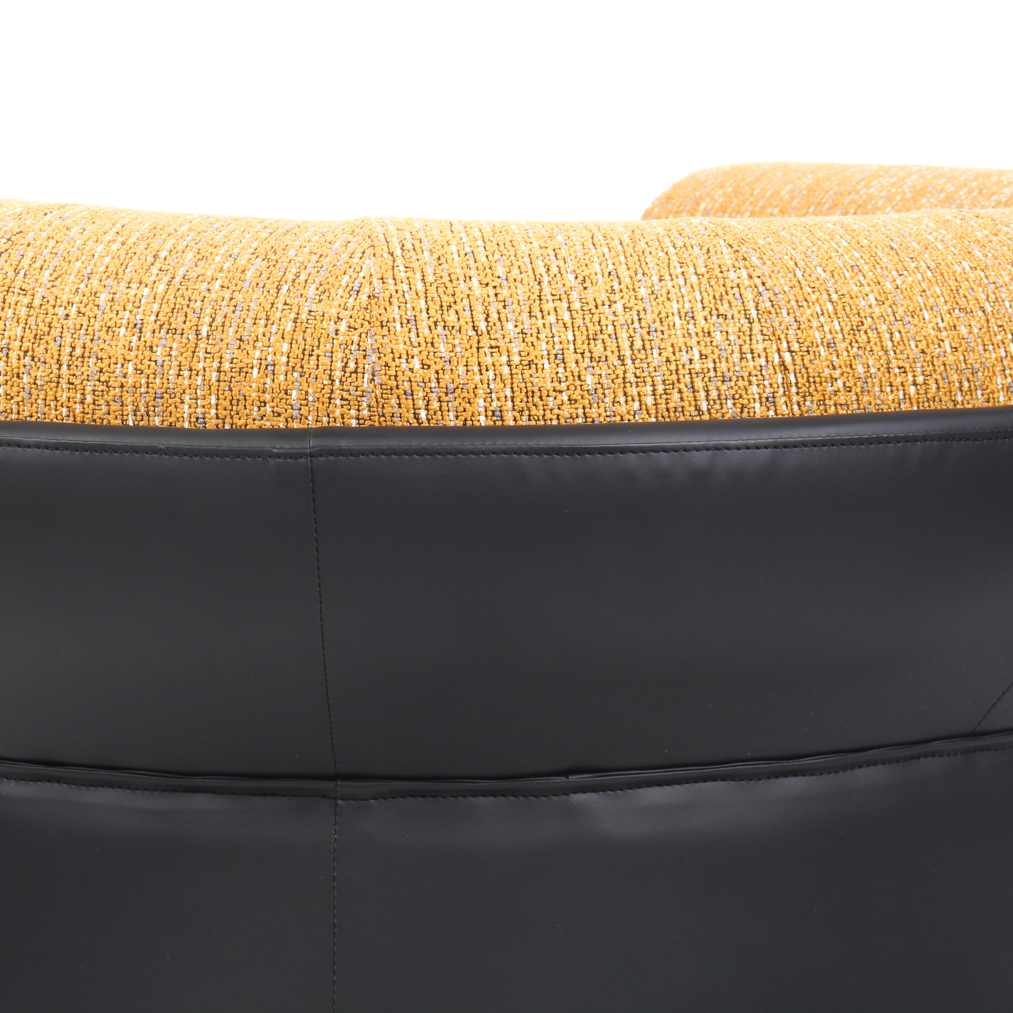 Esta poltrona de tela con tapiz mostaza combina un diseño vibrante y moderno. Su respaldo de cuerina negra y patas metálicas le aportan un toque único y contemporáneo. Ideal para quienes buscan una pieza llamativa y de gran estilo.