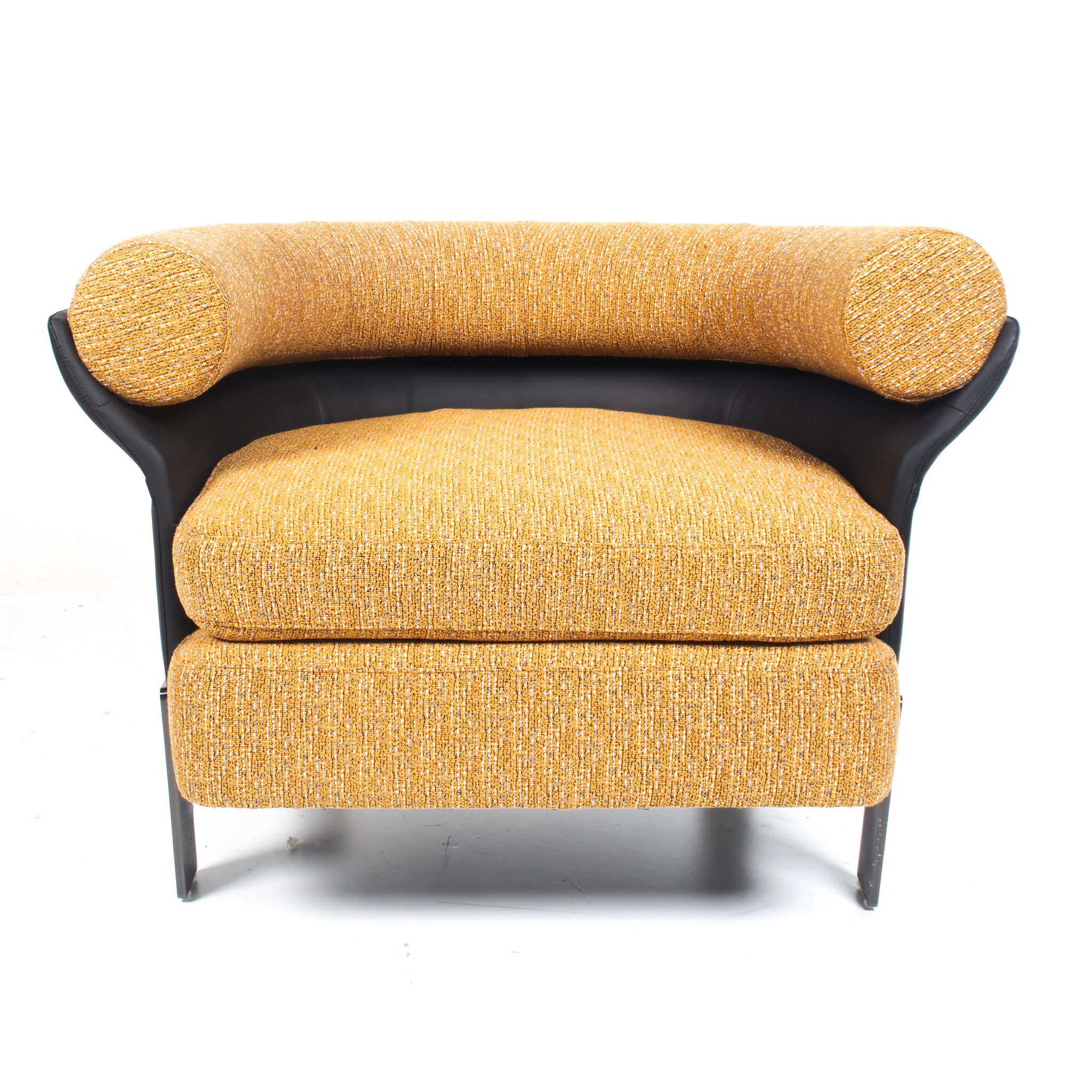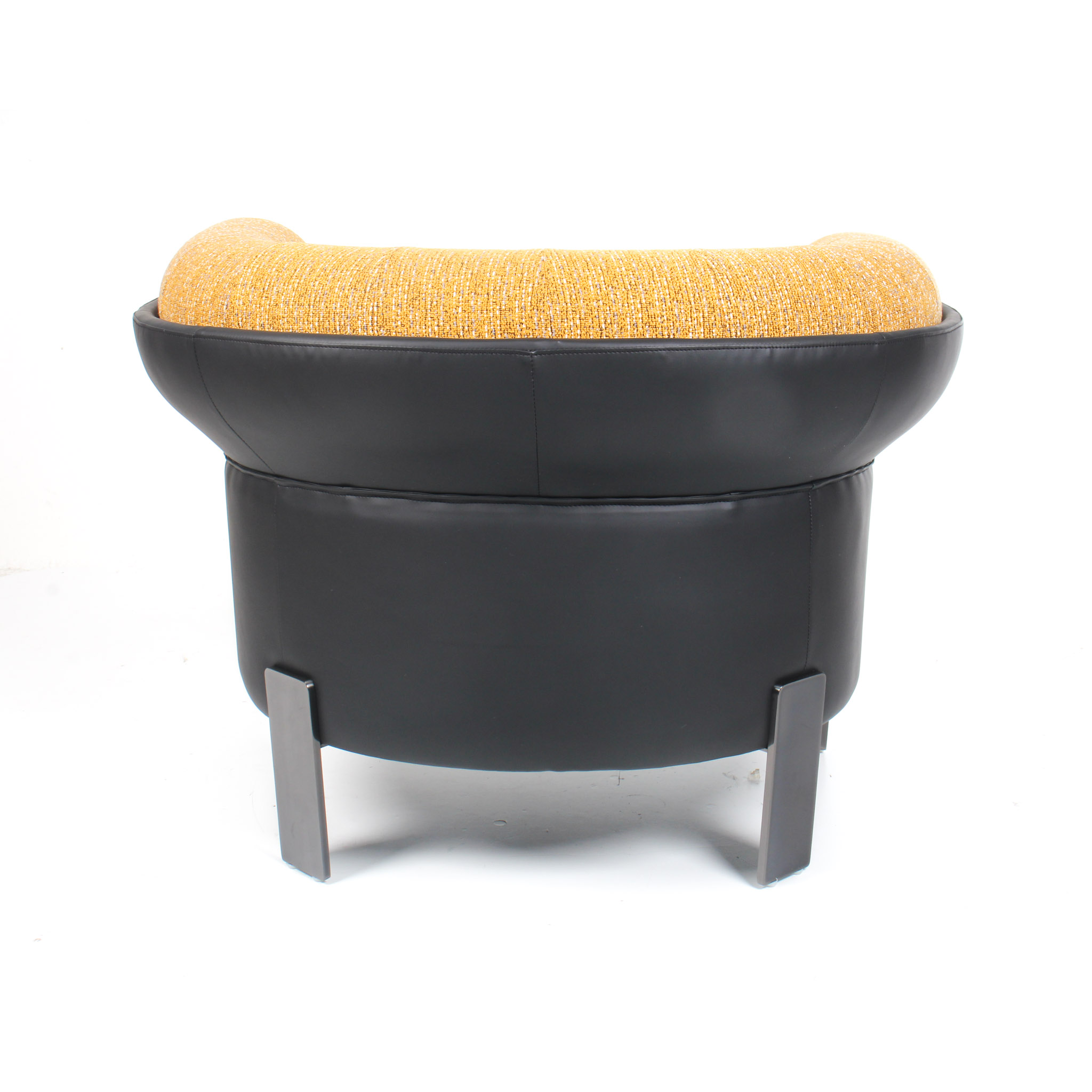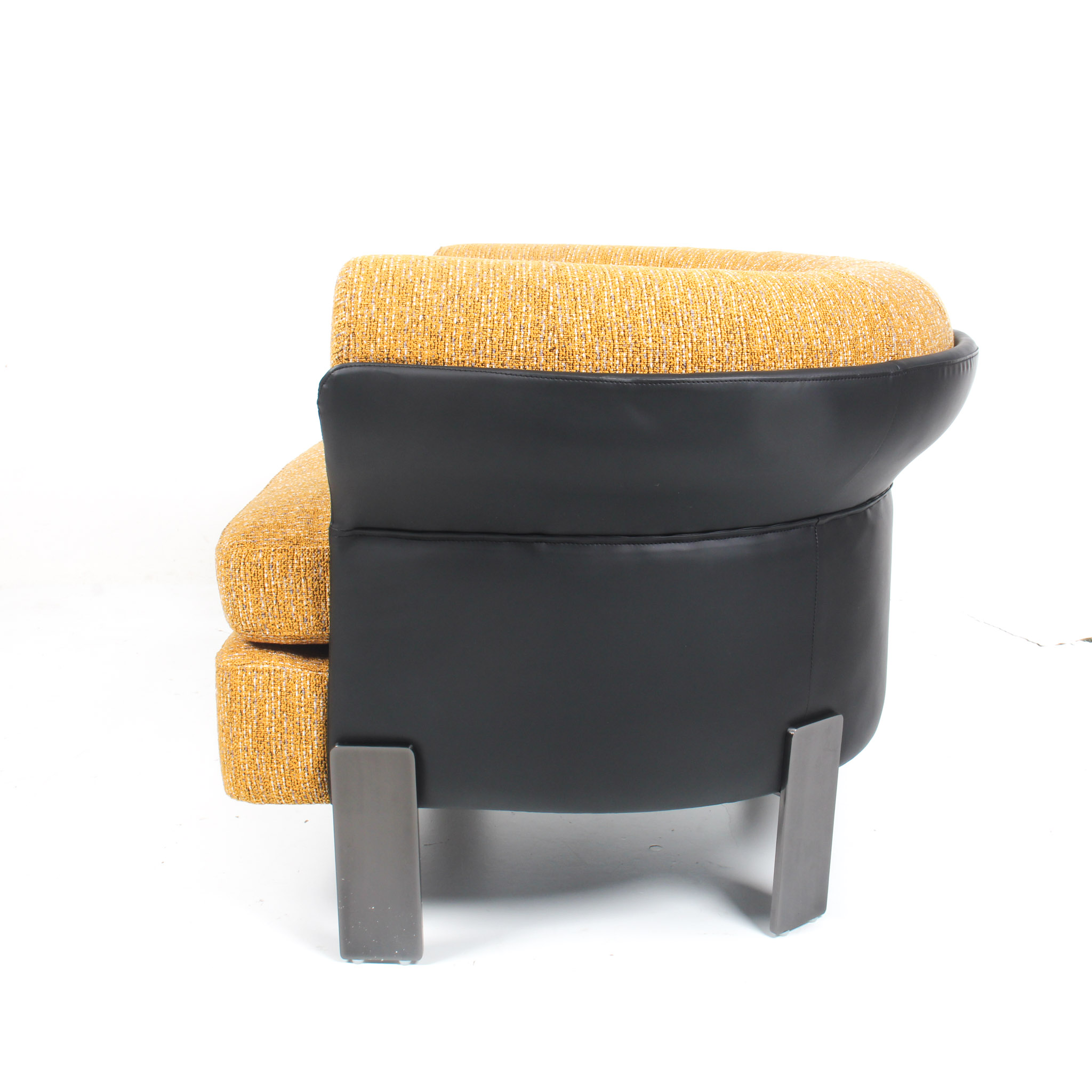 Esta poltrona de tela con tapiz mostaza combina un diseño vibrante y moderno. Su respaldo de cuerina negra y patas metálicas le aportan un toque único y contemporáneo. Ideal para quienes buscan una pieza llamativa y de gran estilo.