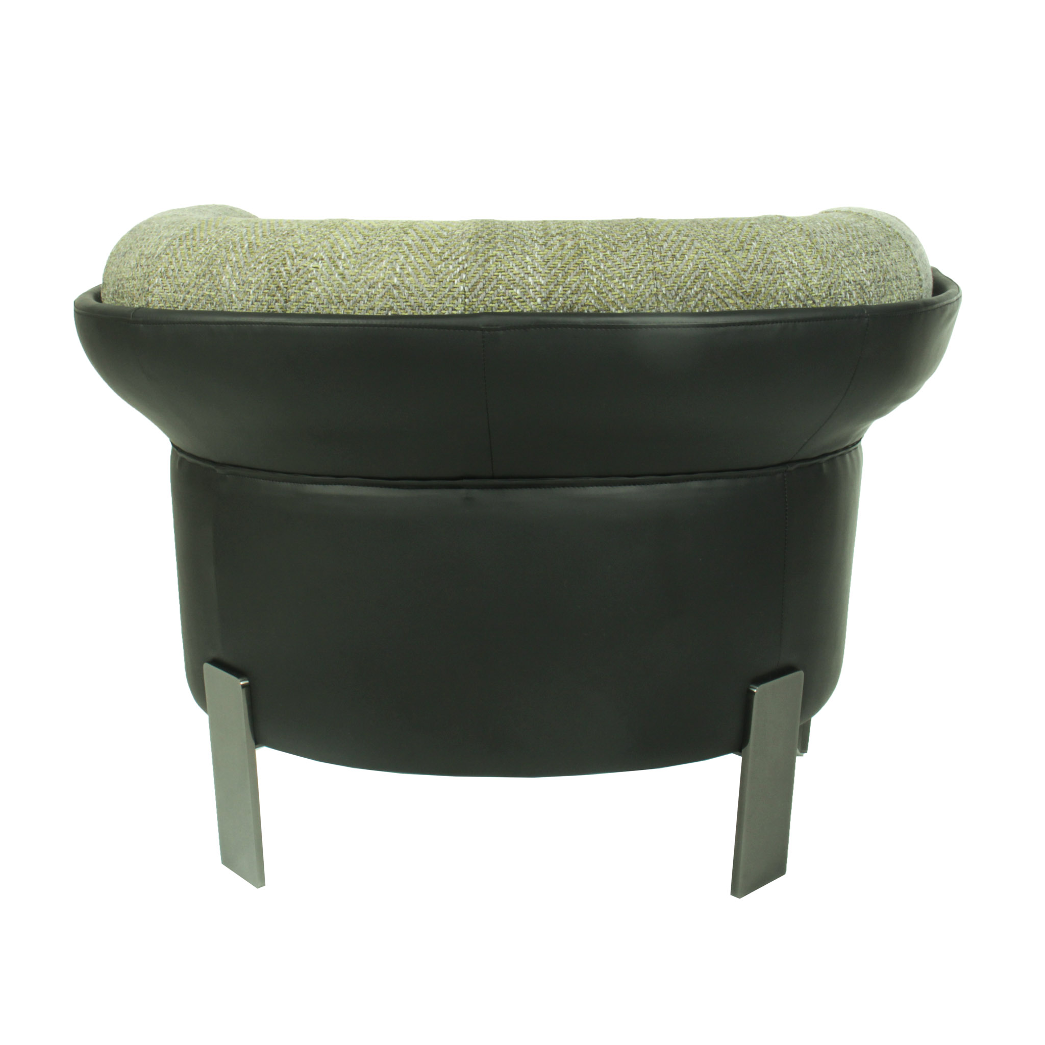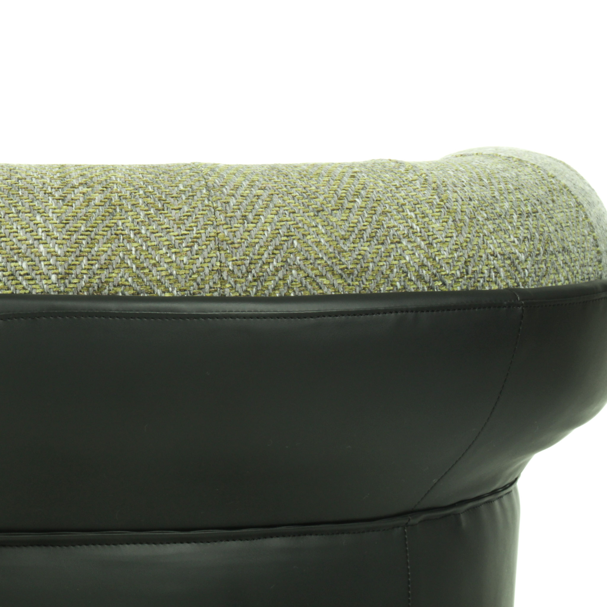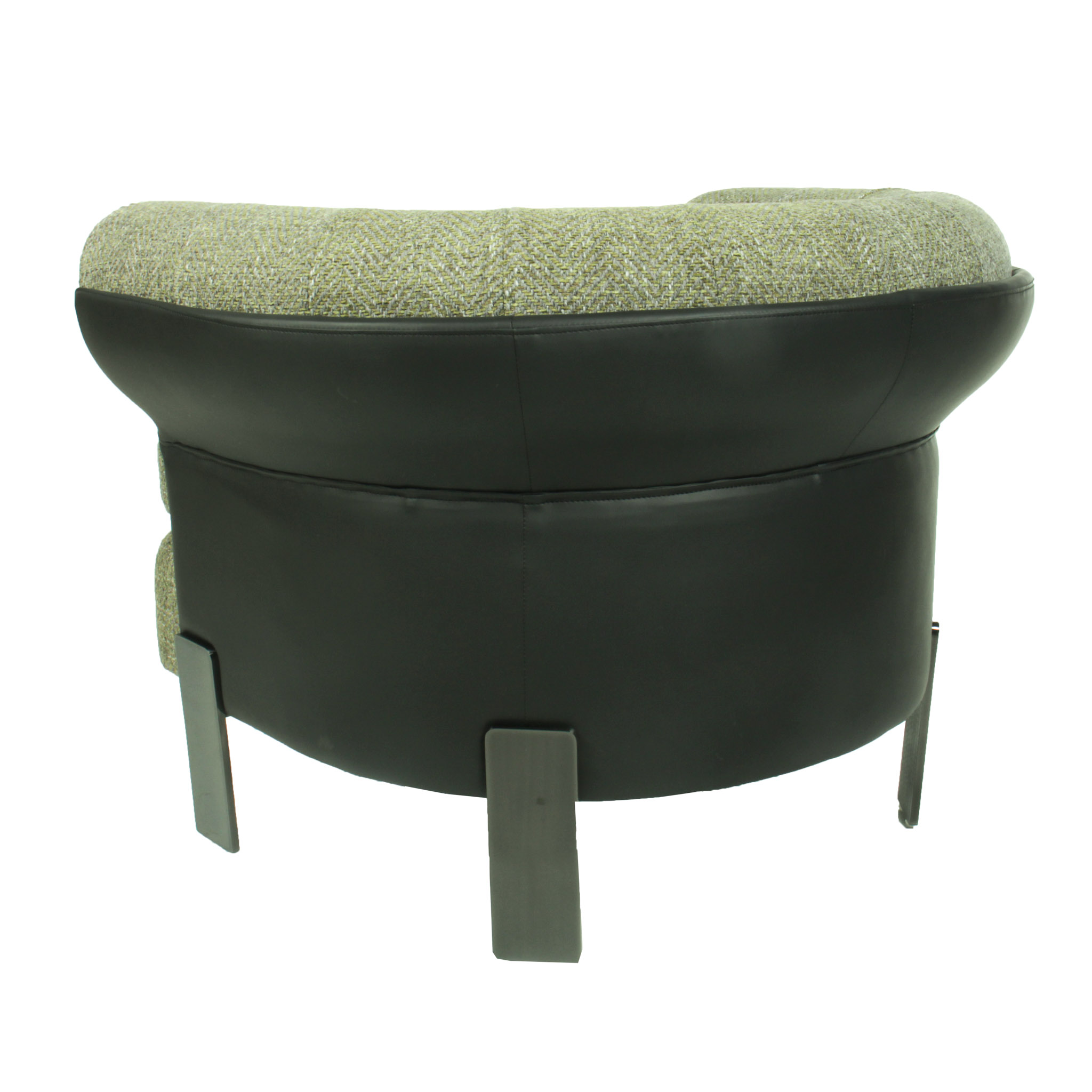 Esta poltrona de tela con tapiz verde presenta un diseño elegante y moderno. El respaldo en cuerina negra y las patas metálicas aportan un toque sofisticado y contemporáneo. Perfecta para añadir estilo y confort a cualquier espacio.