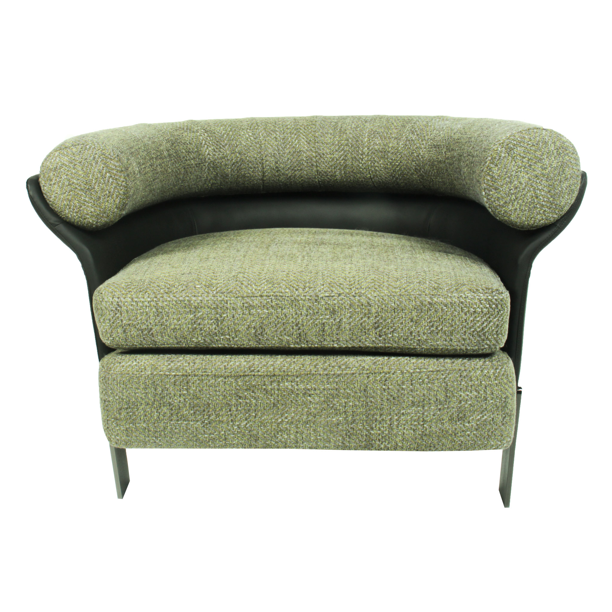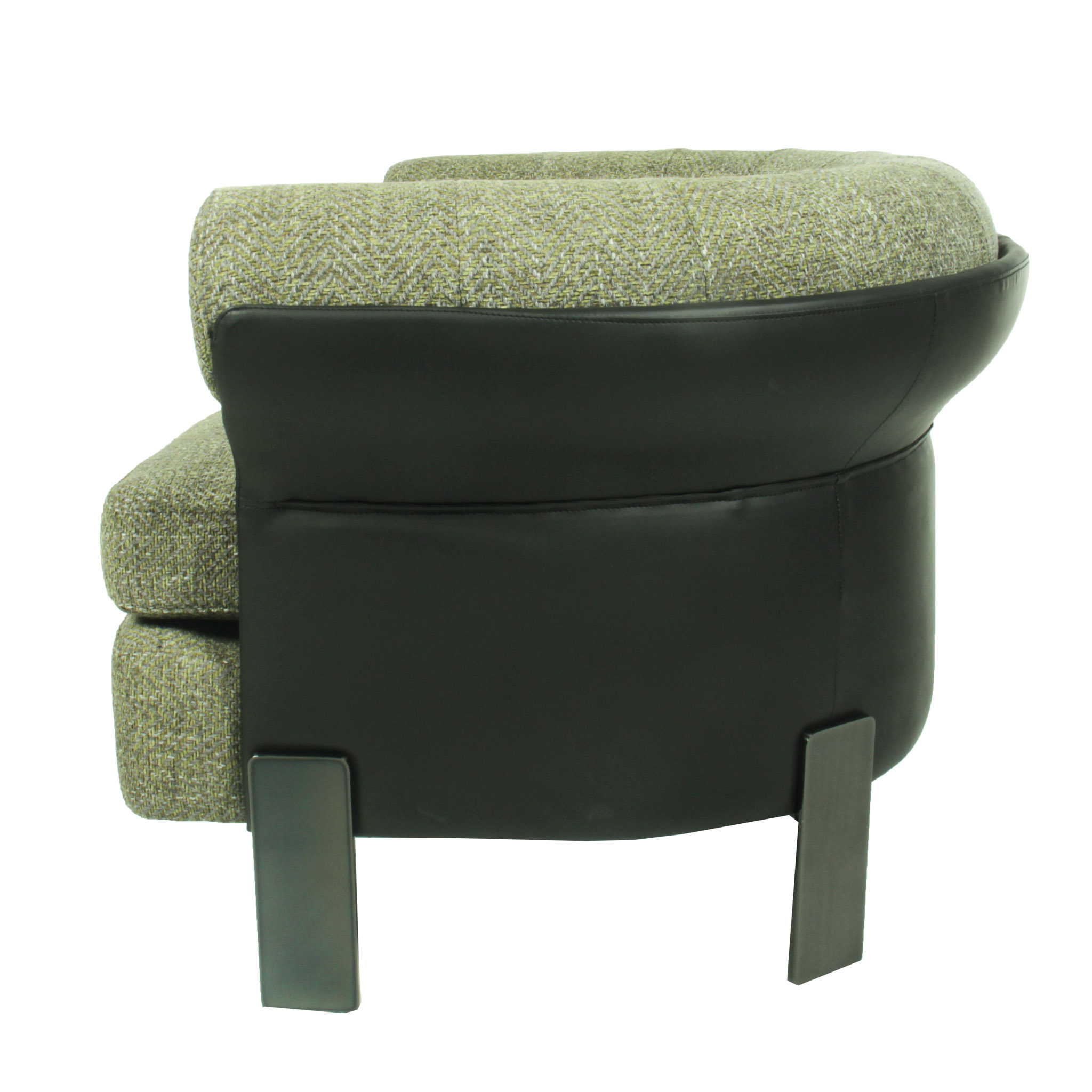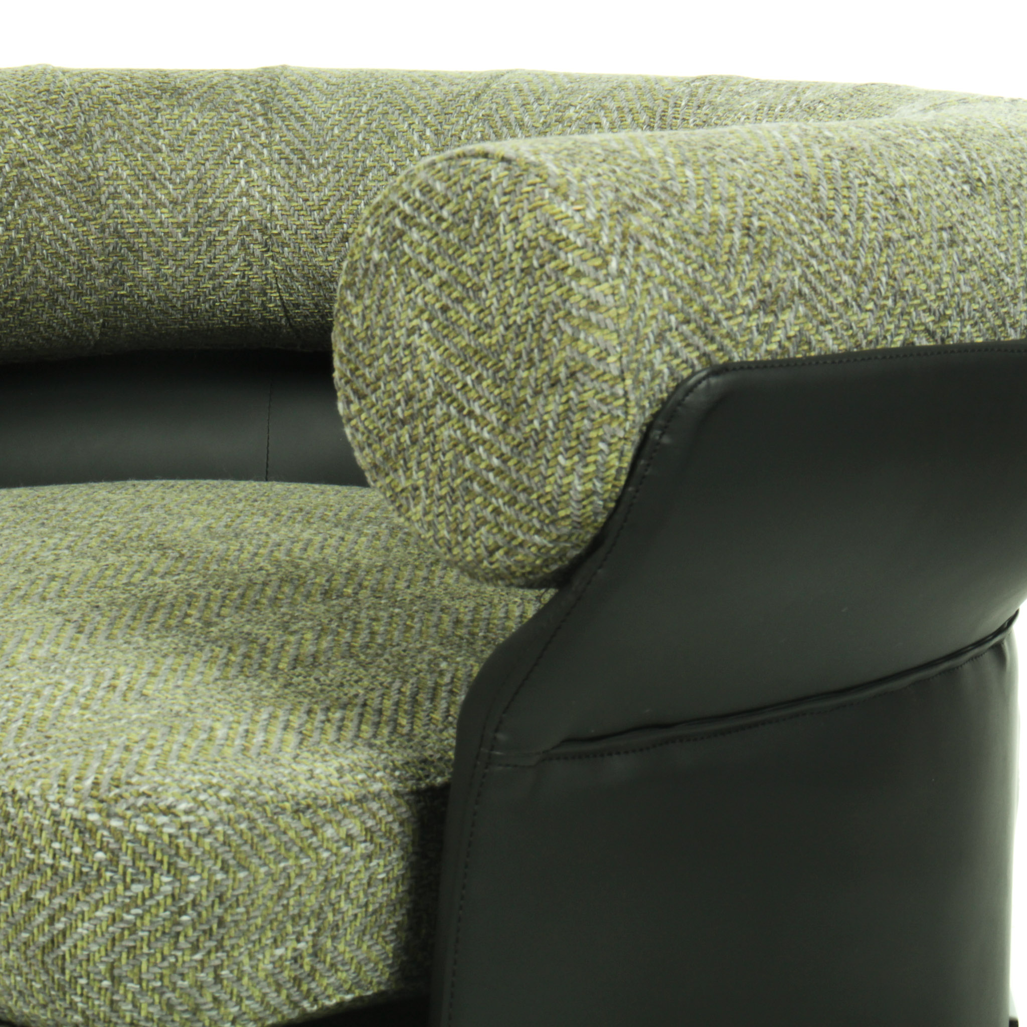 Esta poltrona de tela con tapiz verde presenta un diseño elegante y moderno. El respaldo en cuerina negra y las patas metálicas aportan un toque sofisticado y contemporáneo. Perfecta para añadir estilo y confort a cualquier espacio.