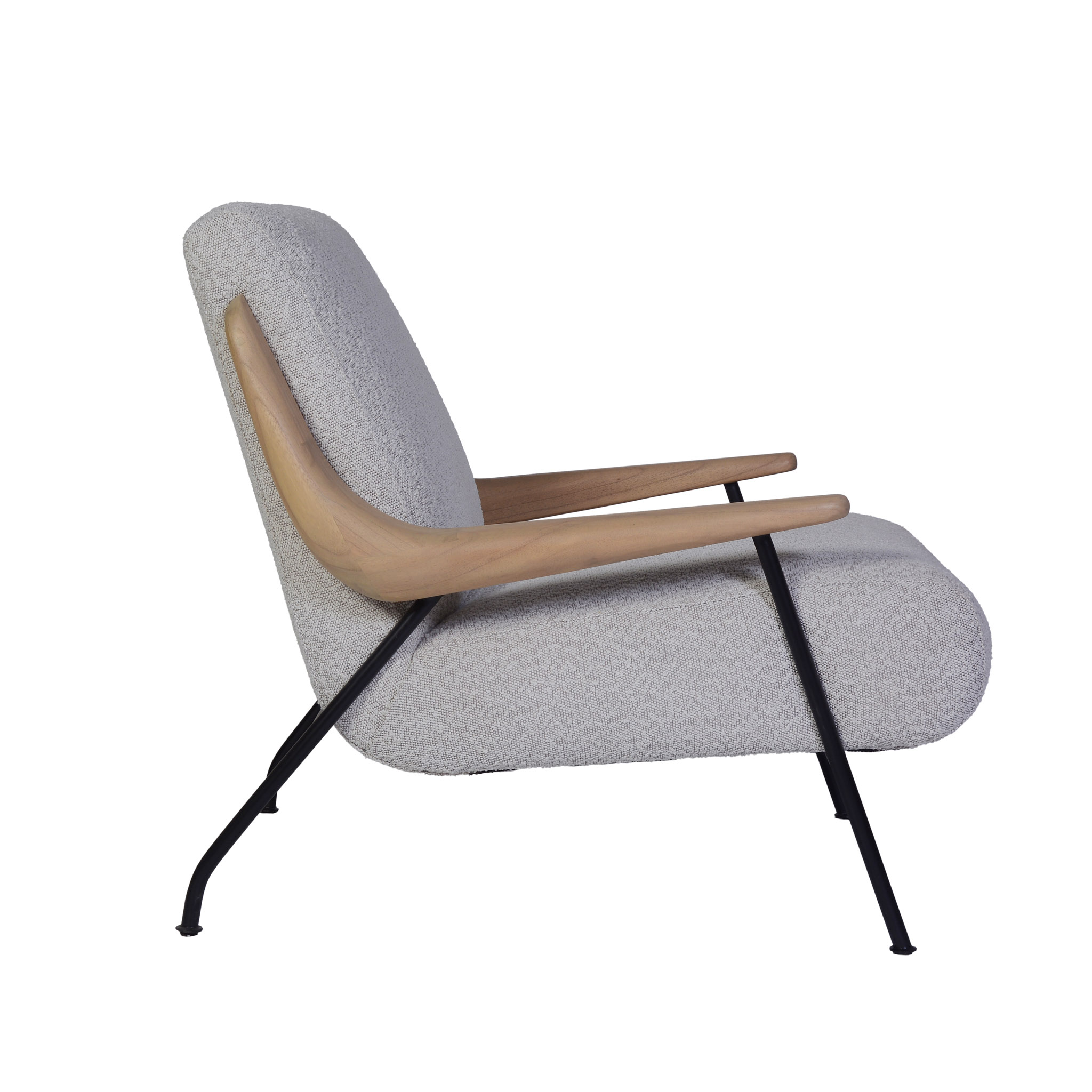 Esta poltrona de tela boucle, con brazos de madera natural y patas de metal negro, ofrece una mezcla perfecta de texturas y materiales. Su diseño sofisticado y moderno aporta confort y estilo a cualquier espacio, creando un ambiente elegante y acogedor con un toque contemporáneo.