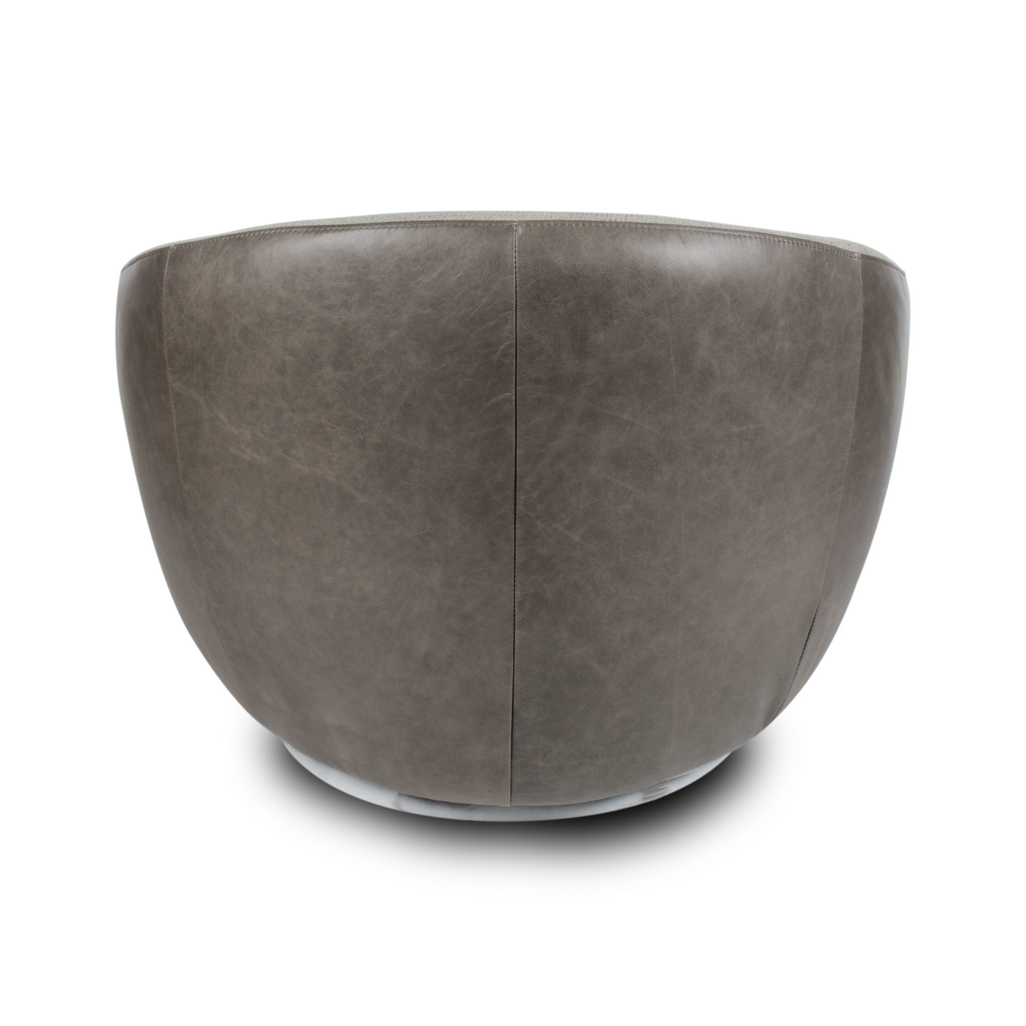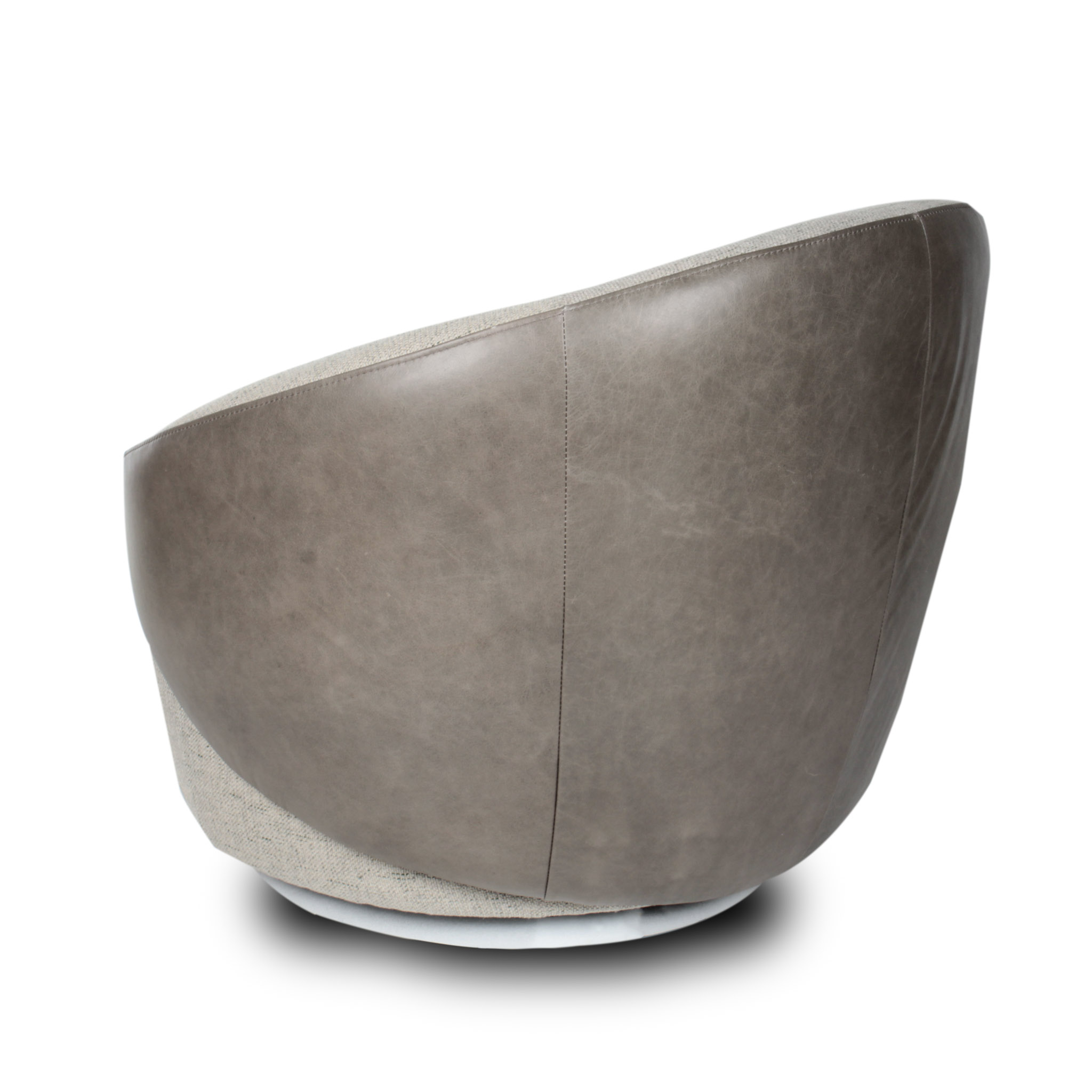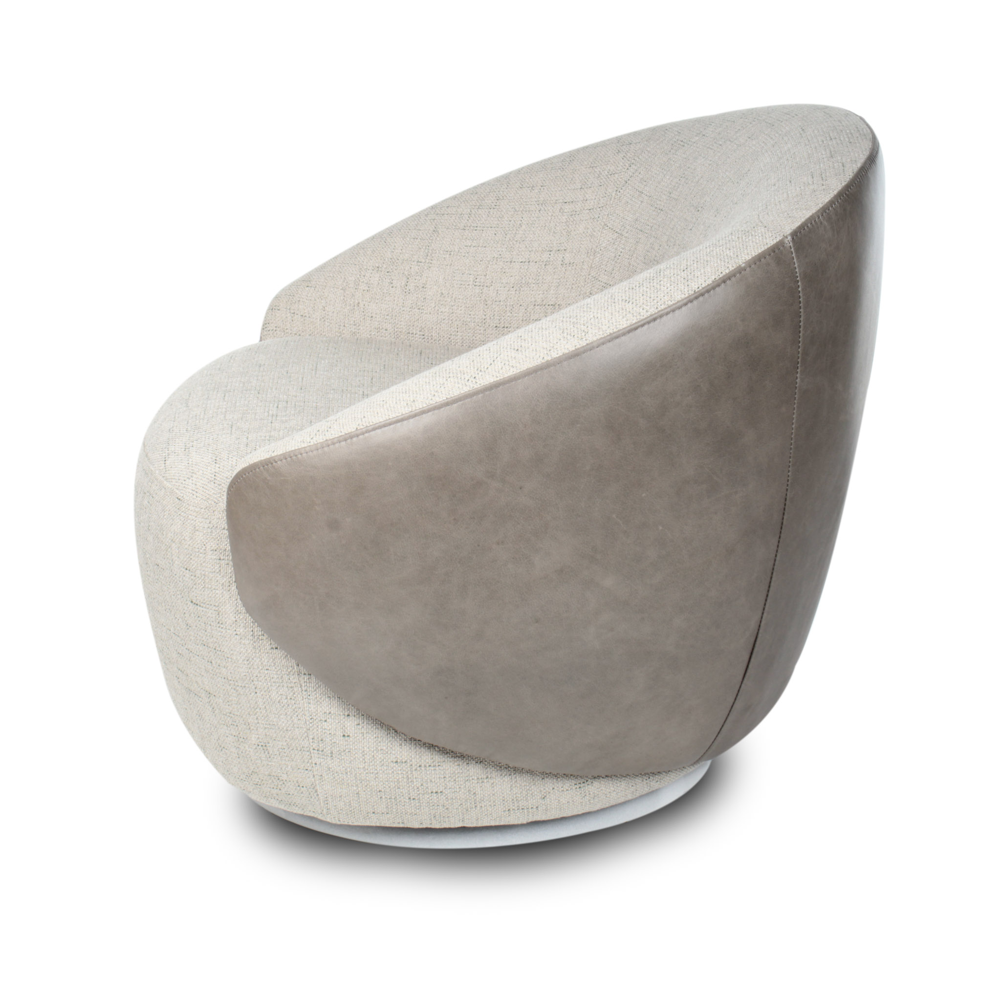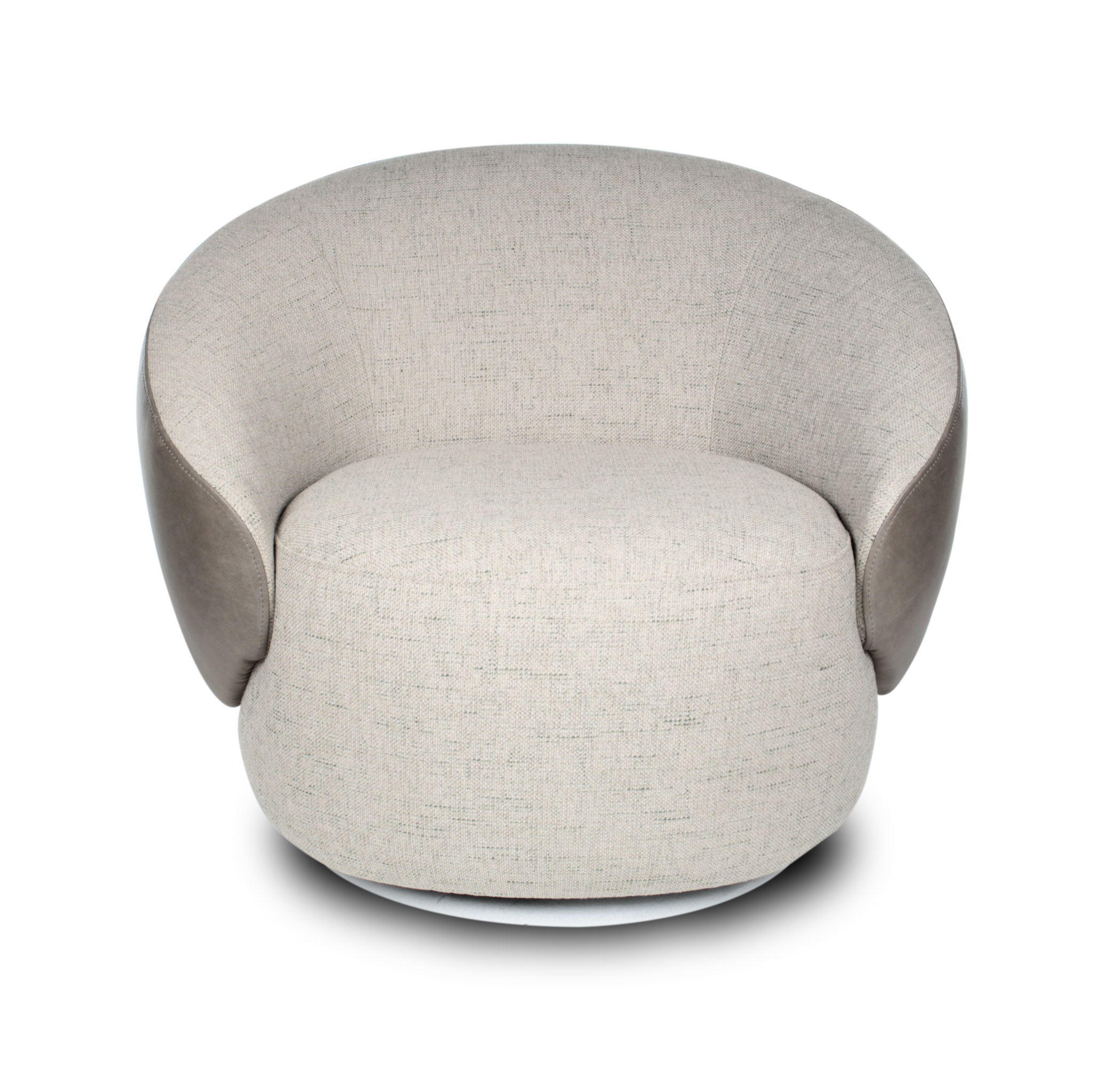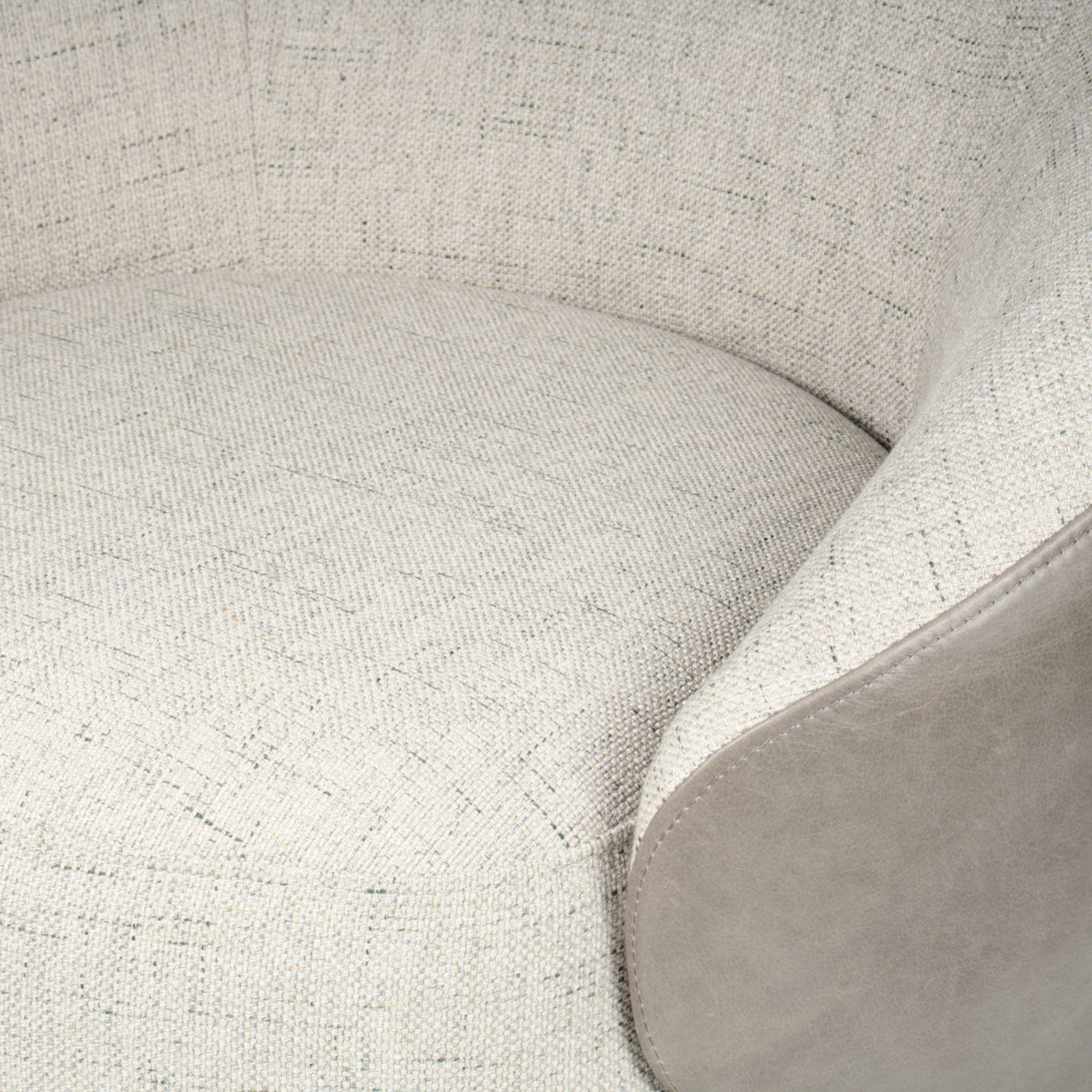 Texturas que contrastan con elegancia. Esta poltrona giratoria combina tela en tono crema claro con hilos grises al frente, y un detalle sofisticado en cuero gris en la parte trasera. Ideal para espacios que buscan una mezcla armoniosa de suavidad y carácter.