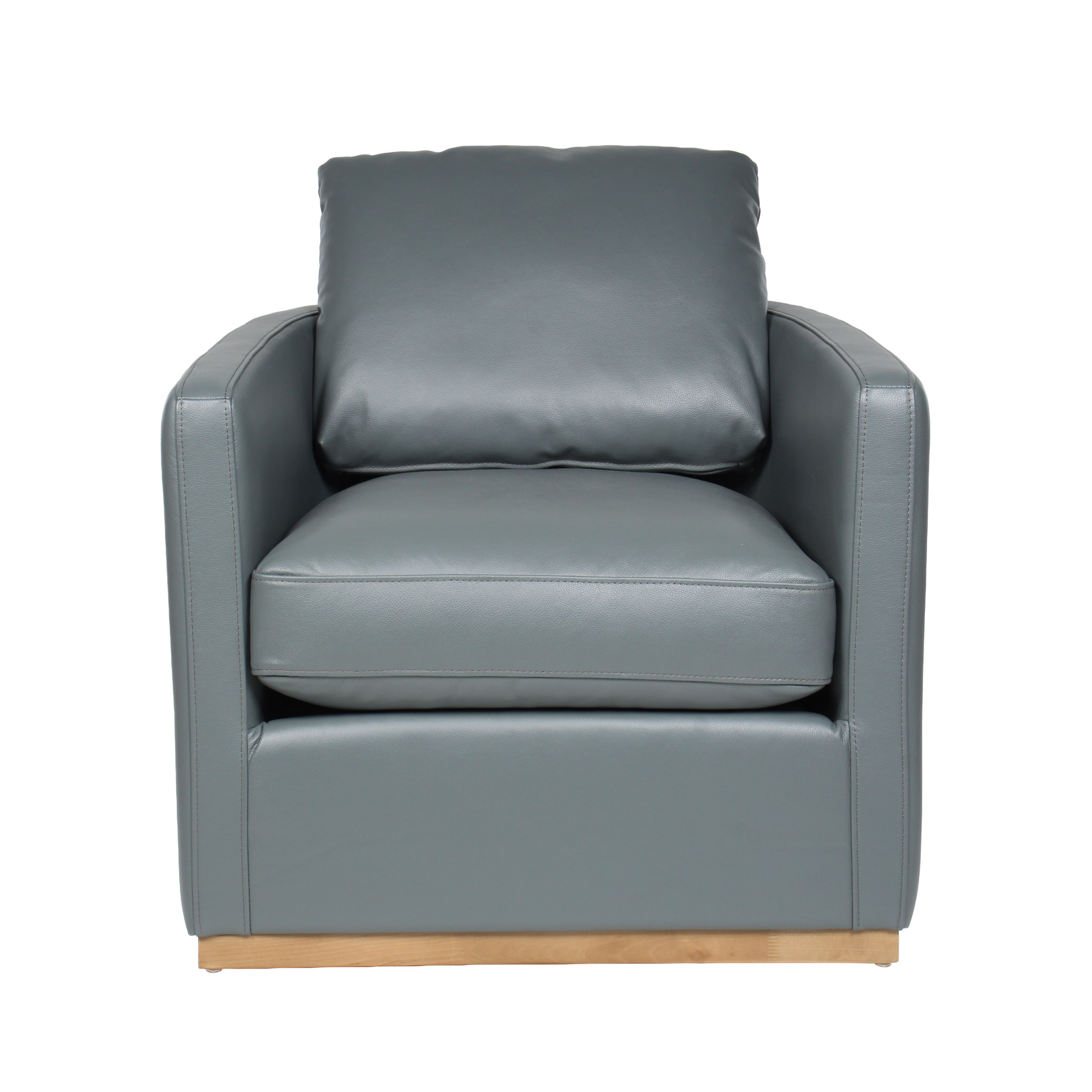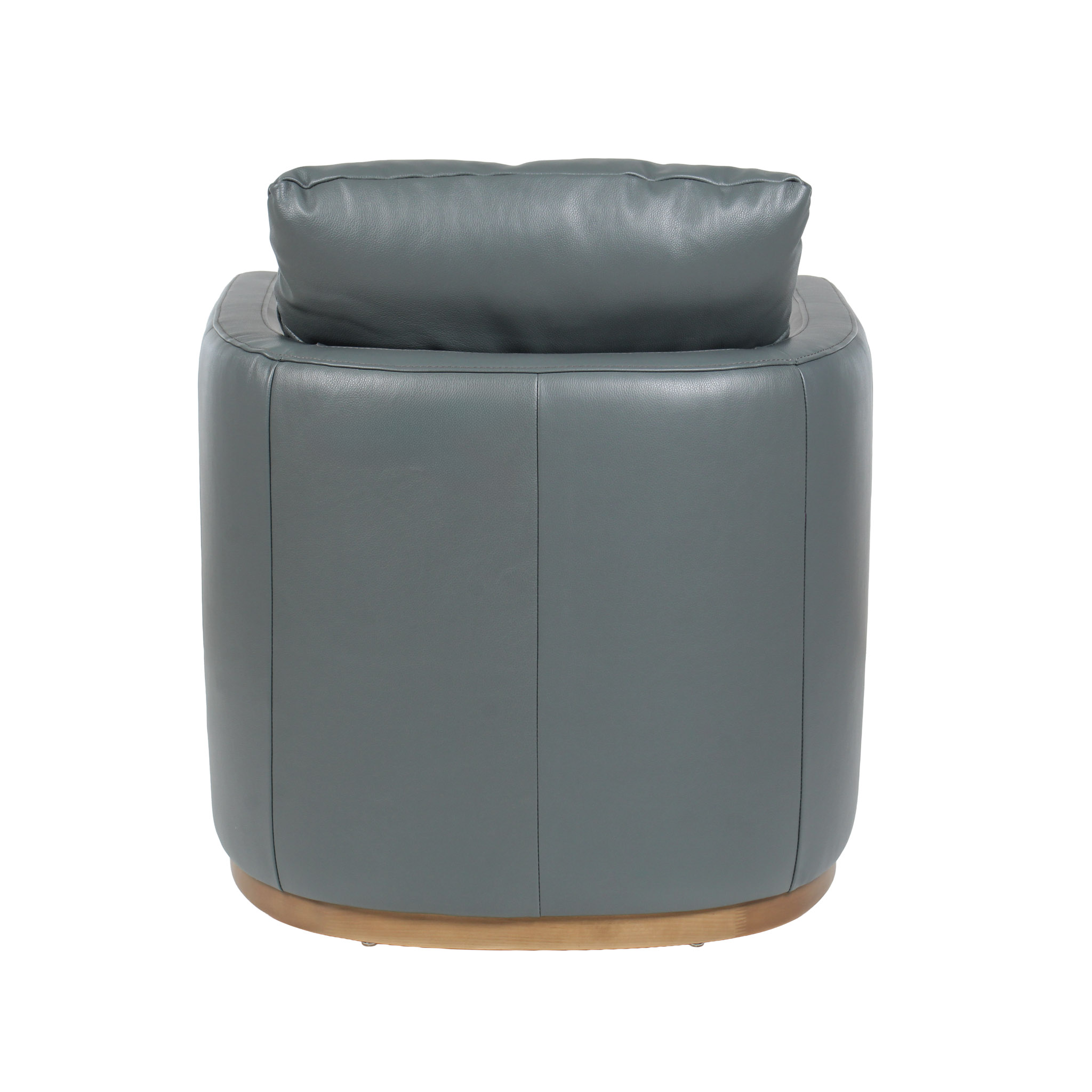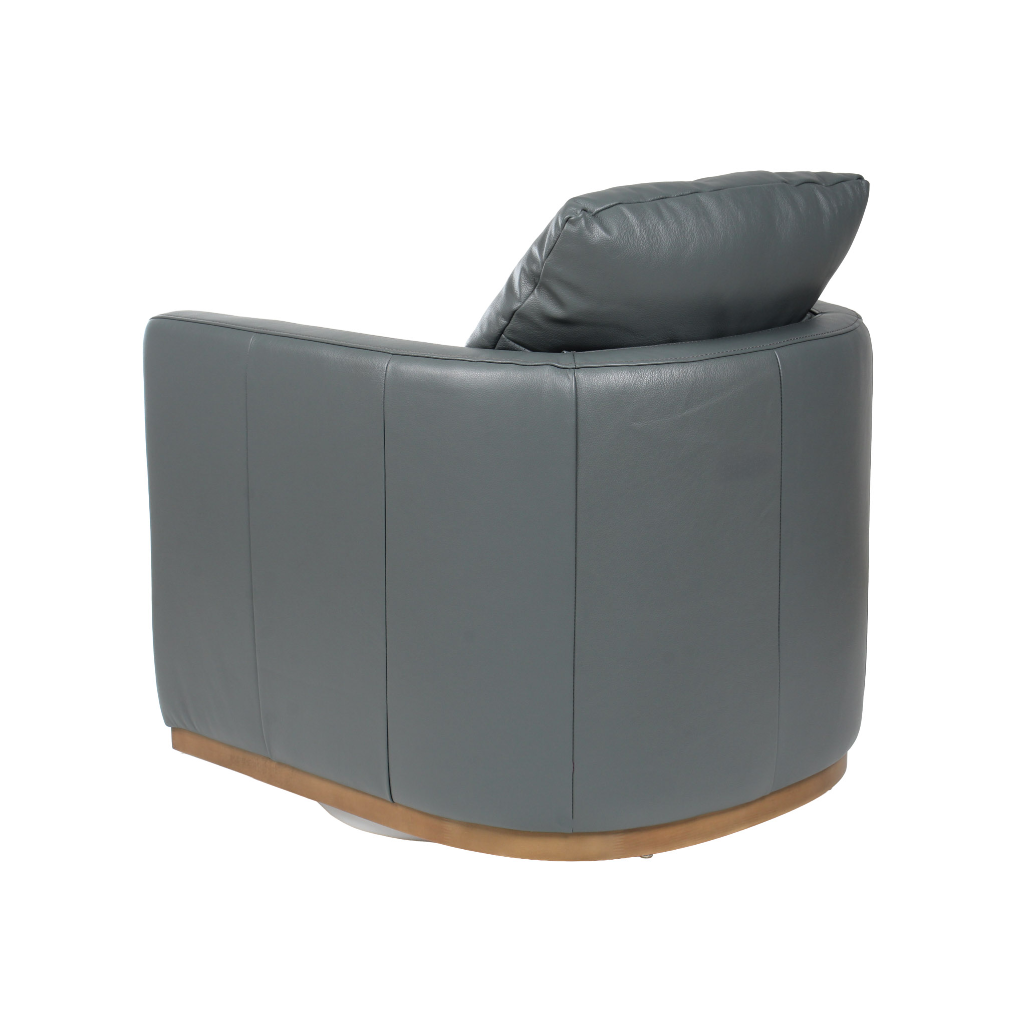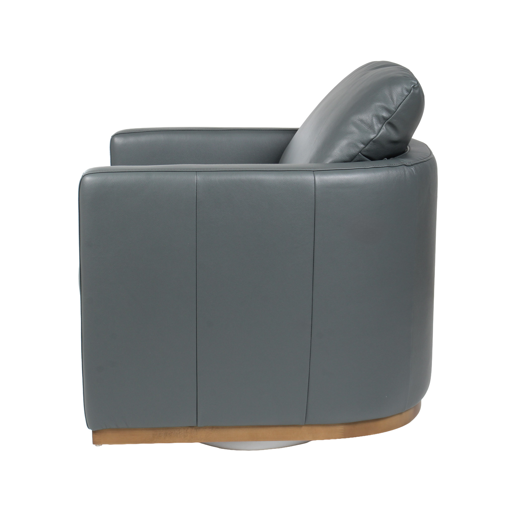 Poltrona giratoria tapizada en cuero gris, con base giratoria y detalles en madera que realzan su elegancia atemporal. Una pieza cómoda y sofisticada, ideal para complementar salas, estudios o rincones de descanso con un estilo moderno y equilibrado.