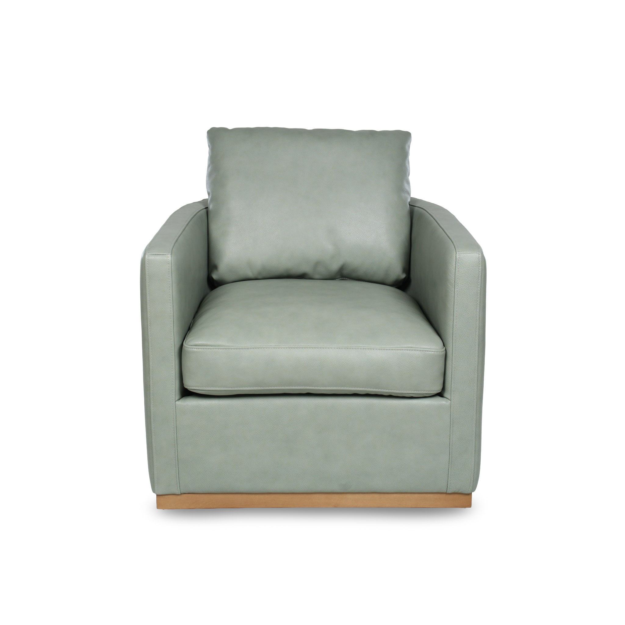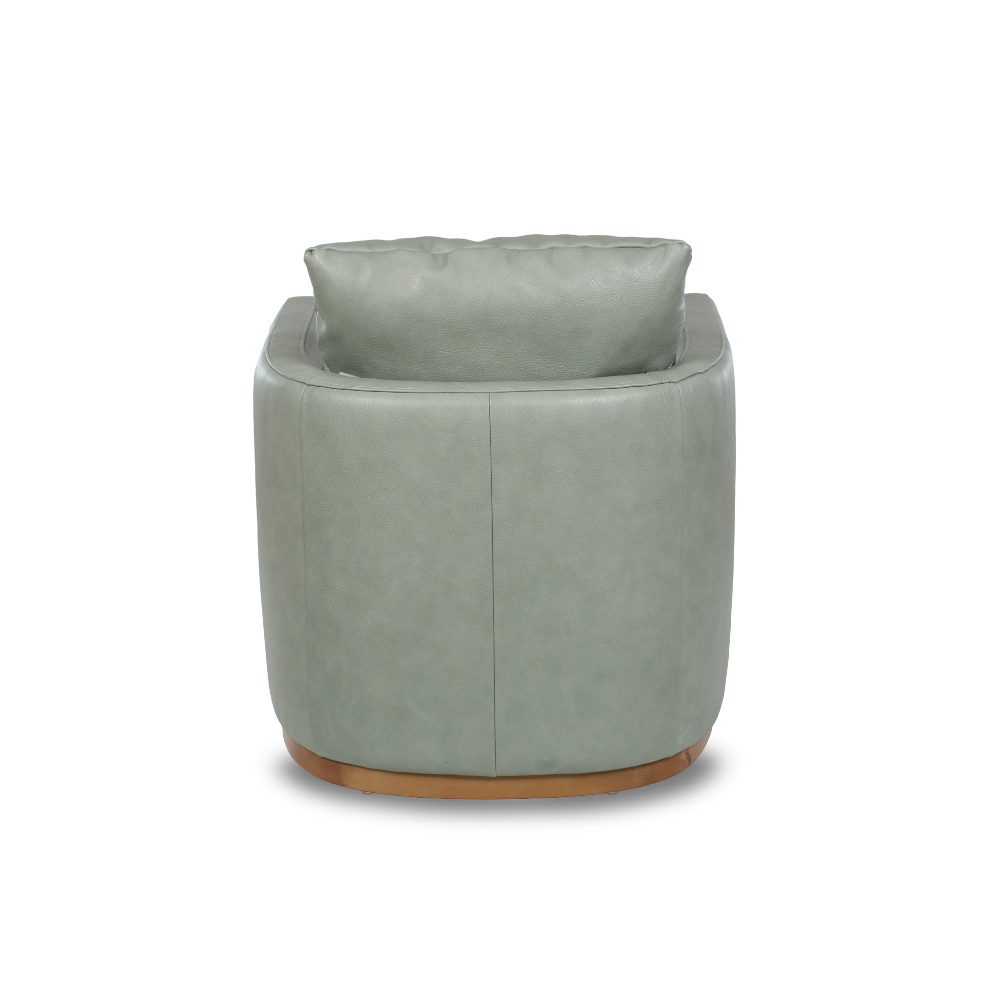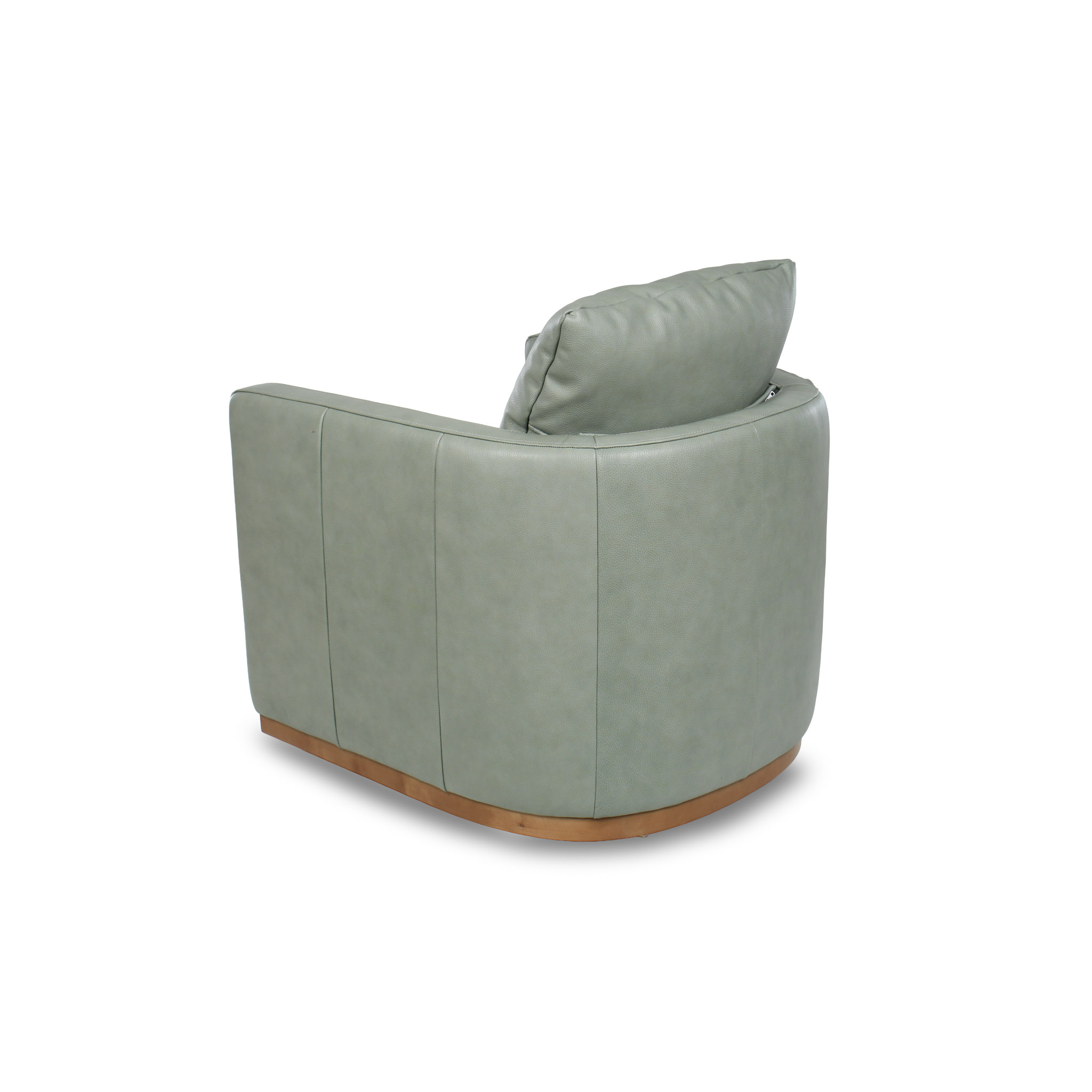 Poltrona giratoria tapizada en cuero verde claro, con base giratoria y detalles en madera que aportan un toque natural y sofisticado. Su diseño contemporáneo combina suavidad visual, confort y funcionalidad, ideal para dar personalidad a cualquier espacio moderno.