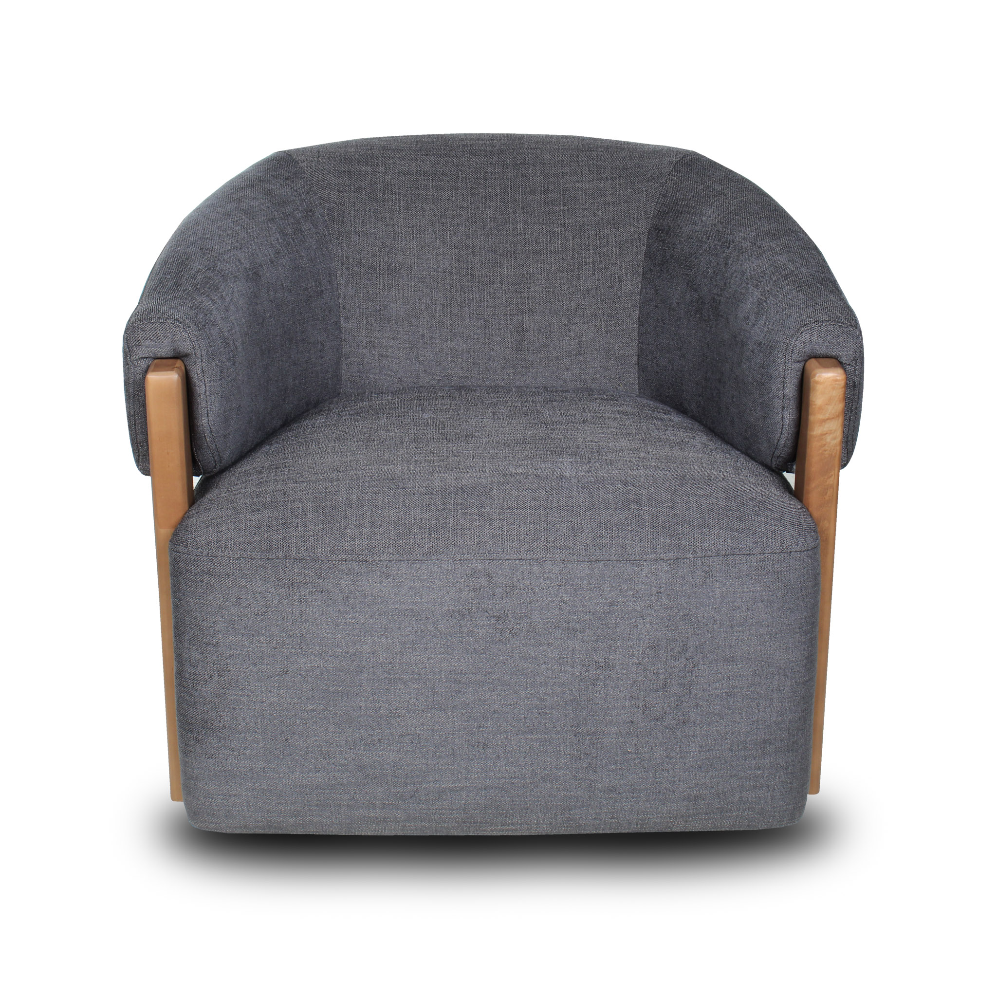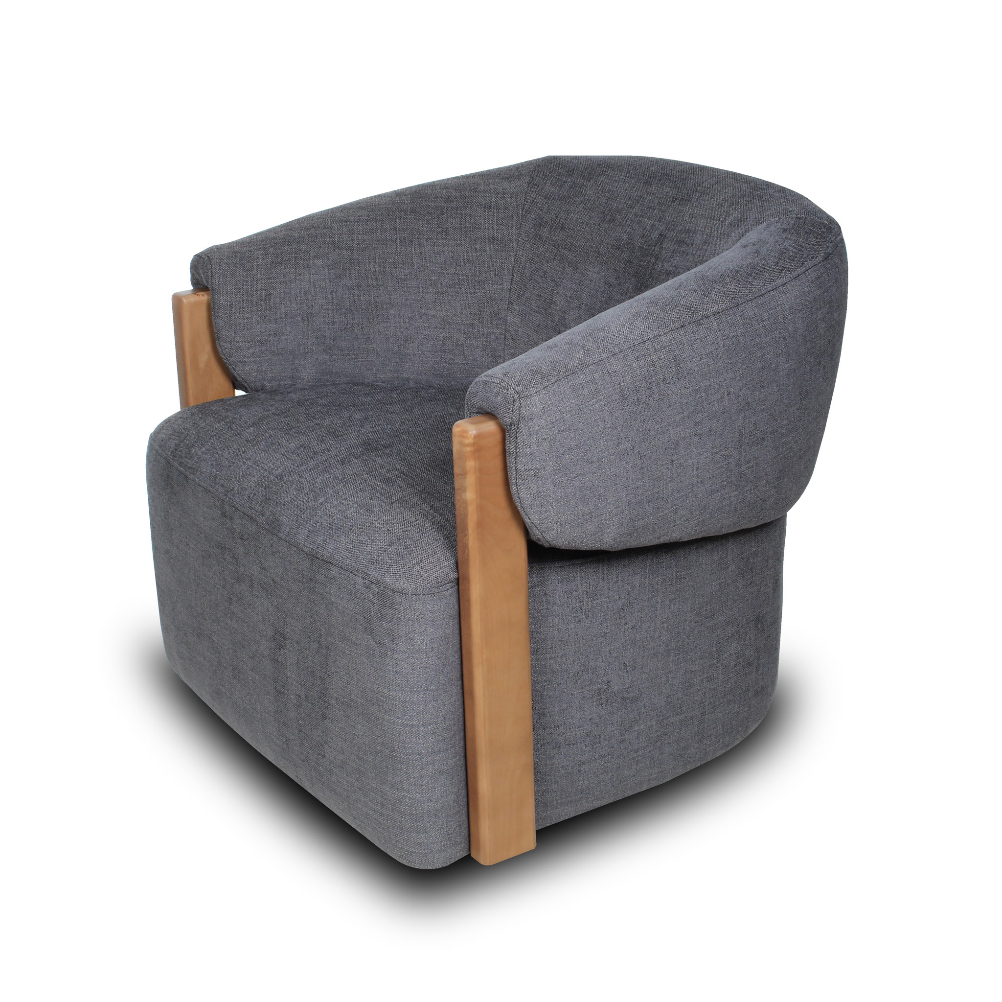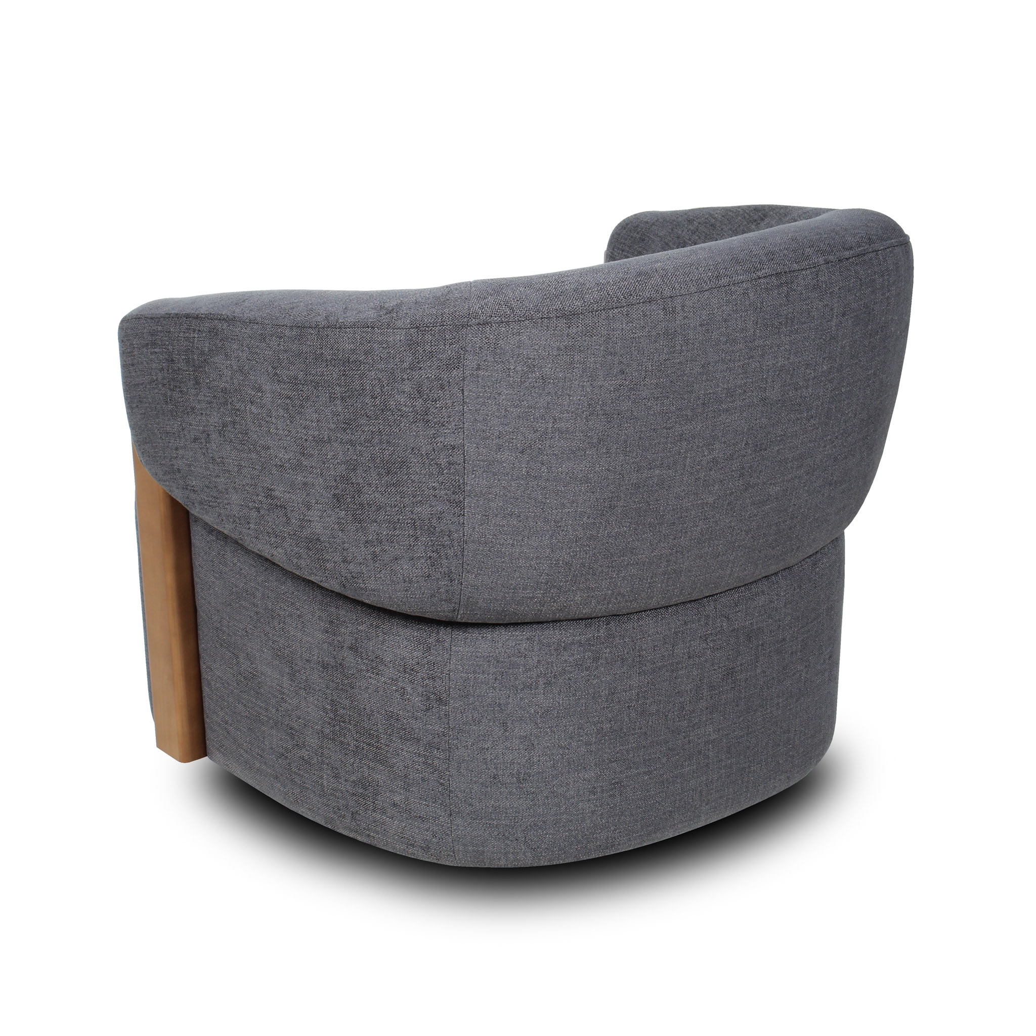 Con un tono gris azulado elegante, esta poltrona introduce un matiz sutil de color al espacio. El detalle en madera refuerza su estética natural y su base giratoria añade funcionalidad, ideal para un living sofisticado.