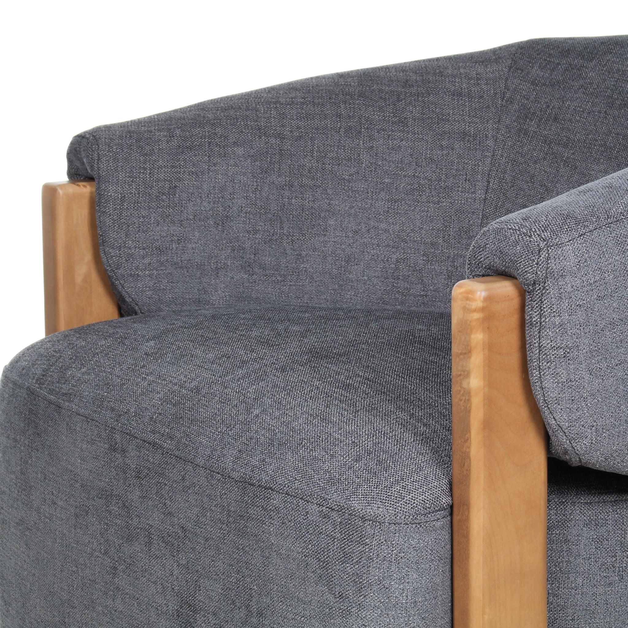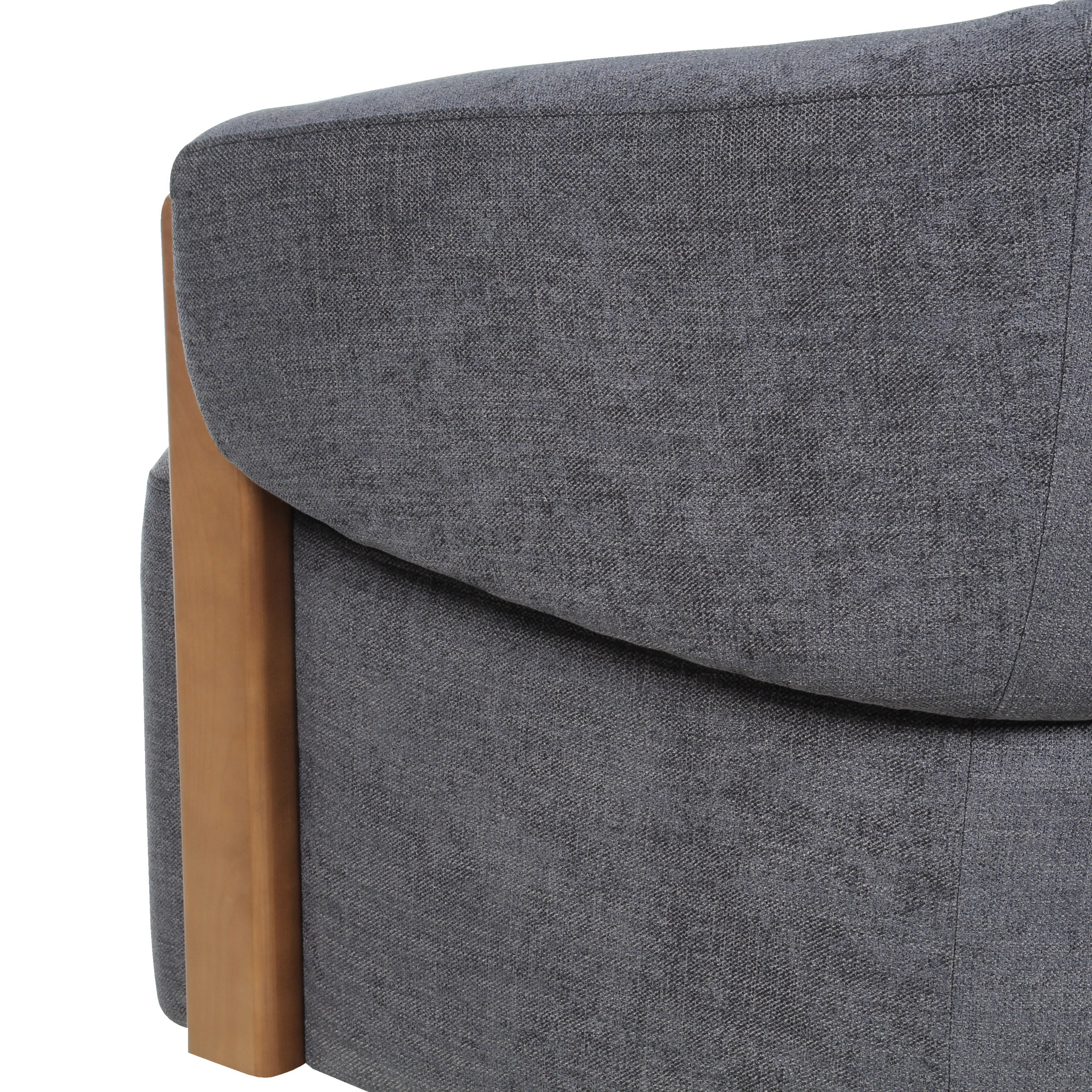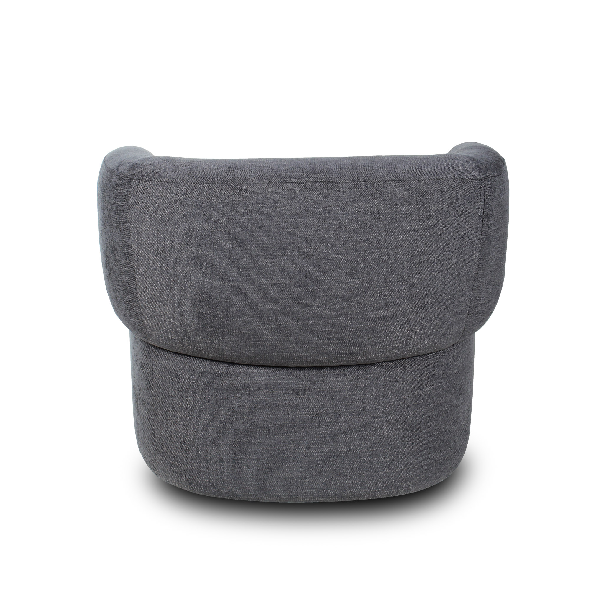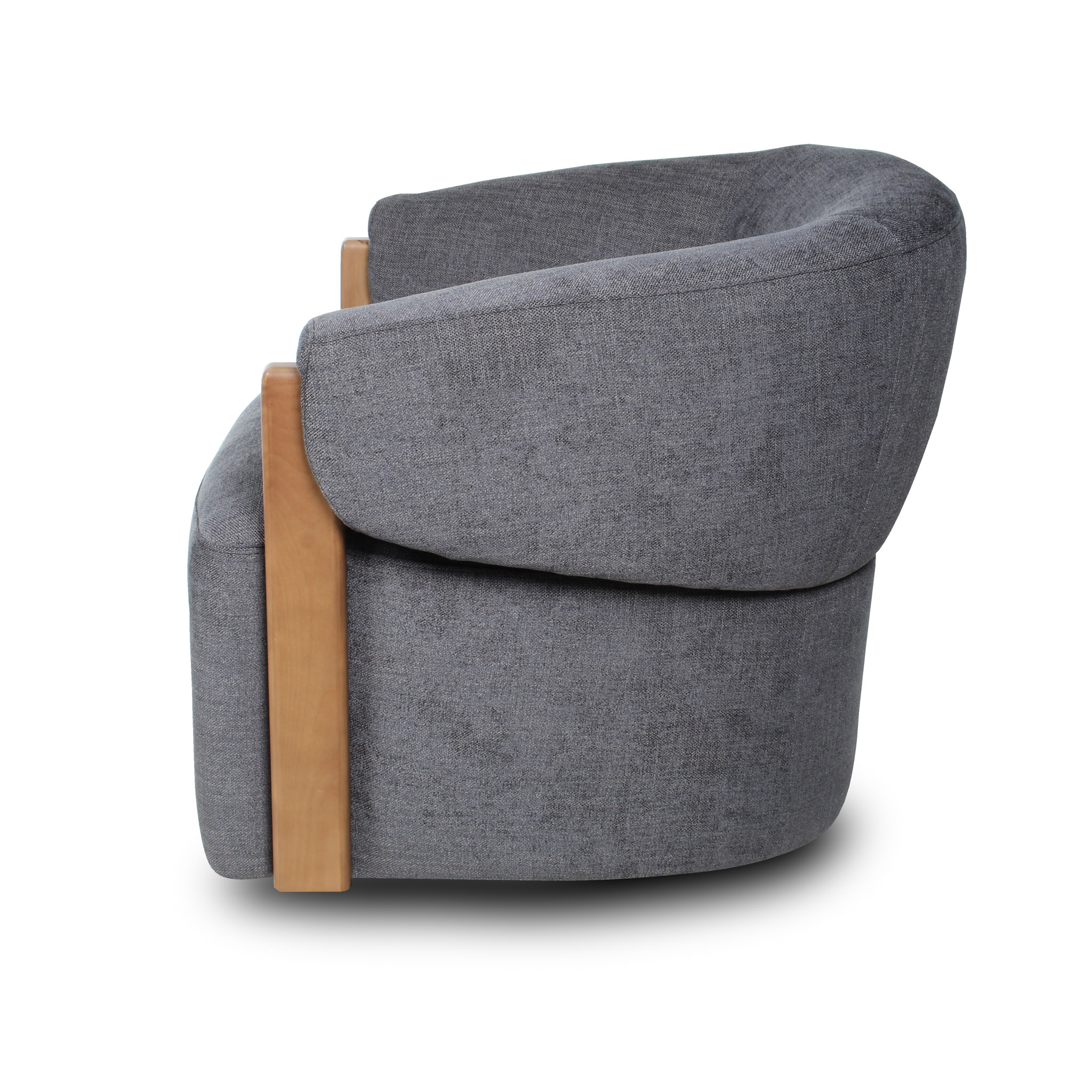 Con un tono gris azulado elegante, esta poltrona introduce un matiz sutil de color al espacio. El detalle en madera refuerza su estética natural y su base giratoria añade funcionalidad, ideal para un living sofisticado.