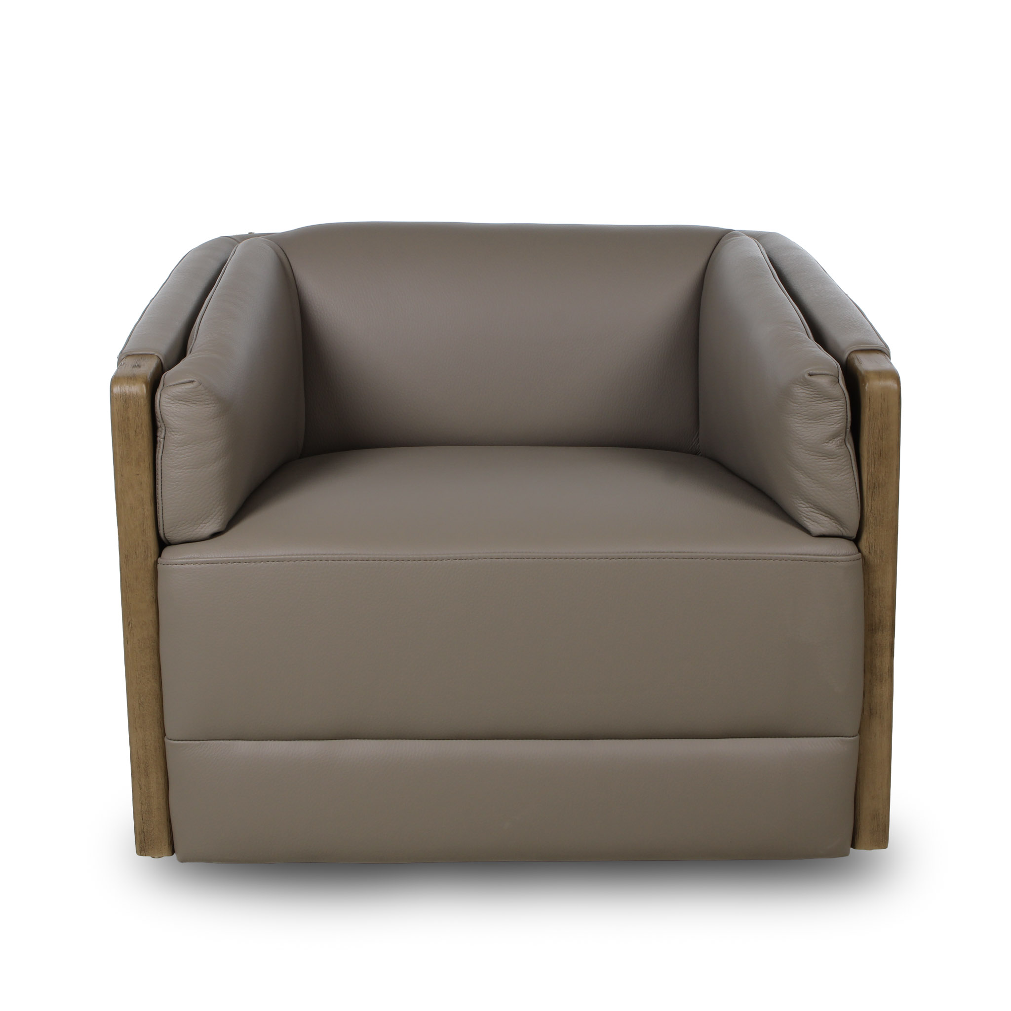 Diseño sofisticado con detalles que marcan la diferencia. El cuero gris oscuro aporta seriedad y presencia, mientras la madera en los brazos suma calidez.
