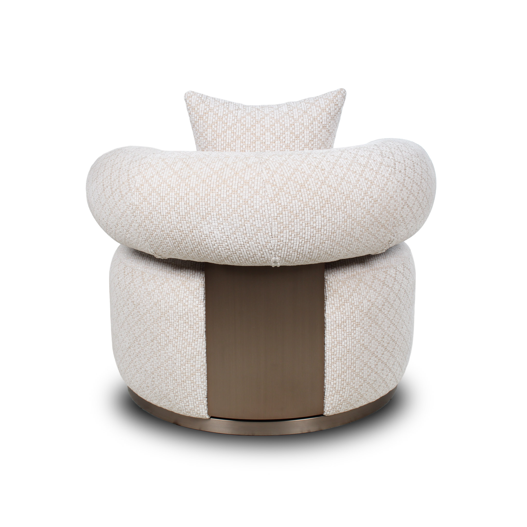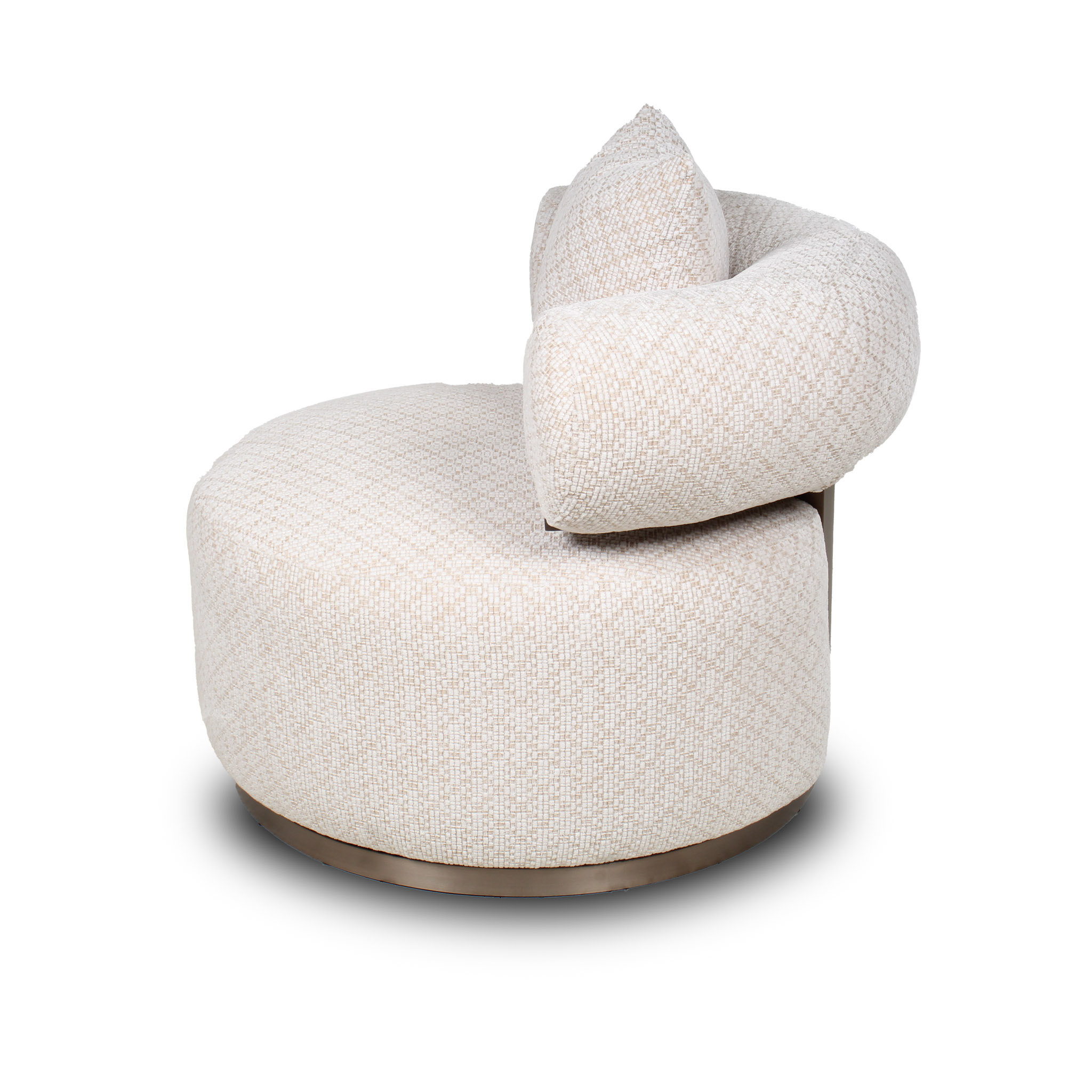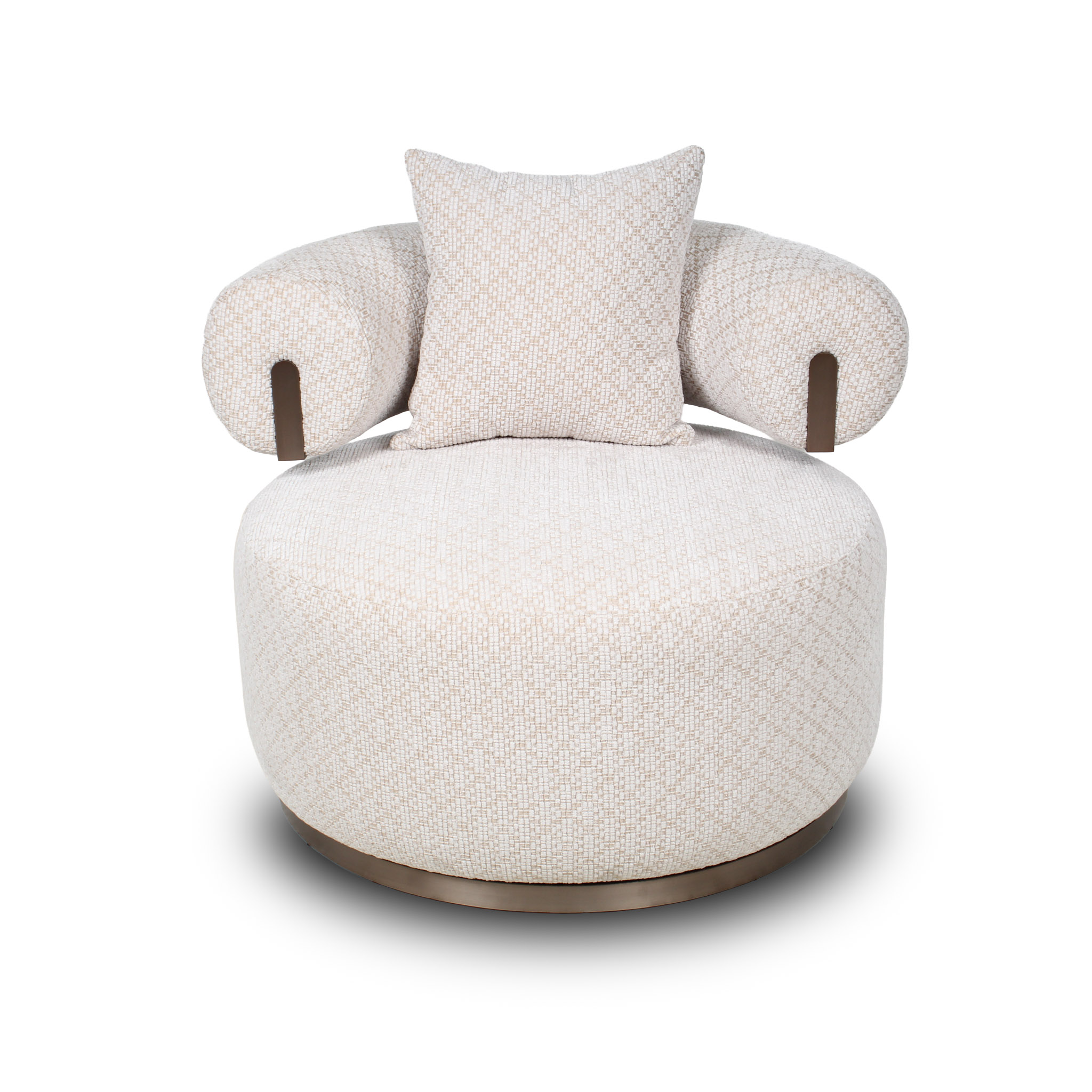 La poltrona giratoria de tela en tono miso natural con cojín ofrece confort y estilo en un diseño contemporáneo. Su base de metal en acabado bronce aporta un toque sofisticado y moderno. Una pieza versátil y elegante, ideal para salas u oficinas con personalidad.