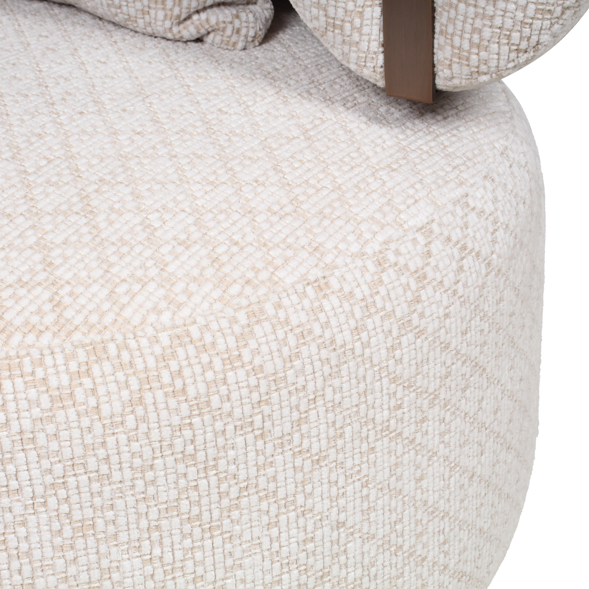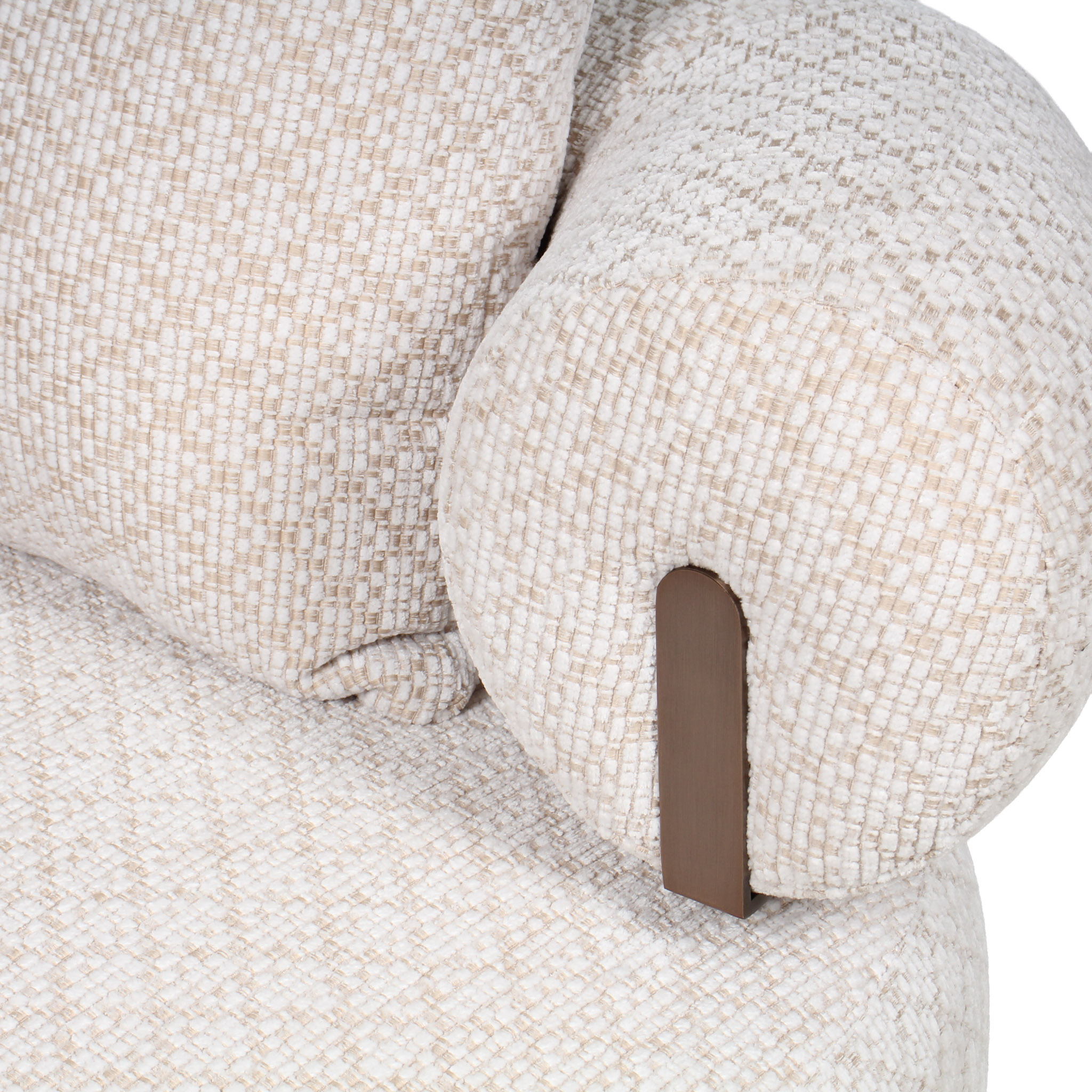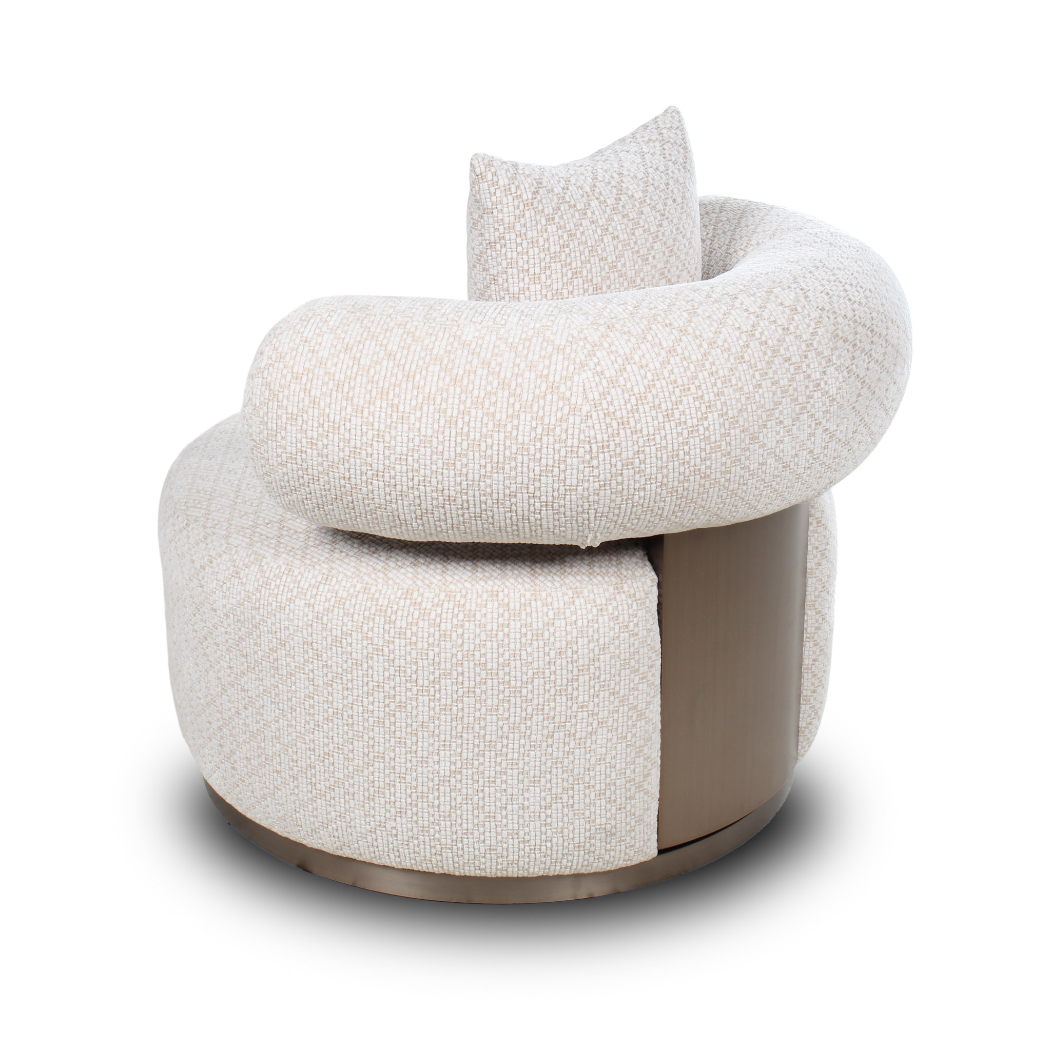 La poltrona giratoria de tela en tono miso natural con cojín ofrece confort y estilo en un diseño contemporáneo. Su base de metal en acabado bronce aporta un toque sofisticado y moderno. Una pieza versátil y elegante, ideal para salas u oficinas con personalidad.