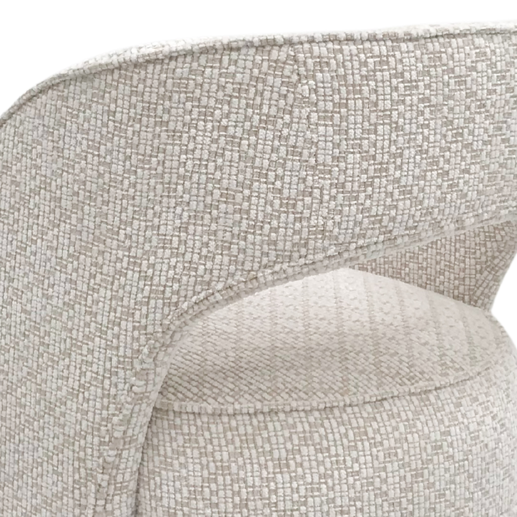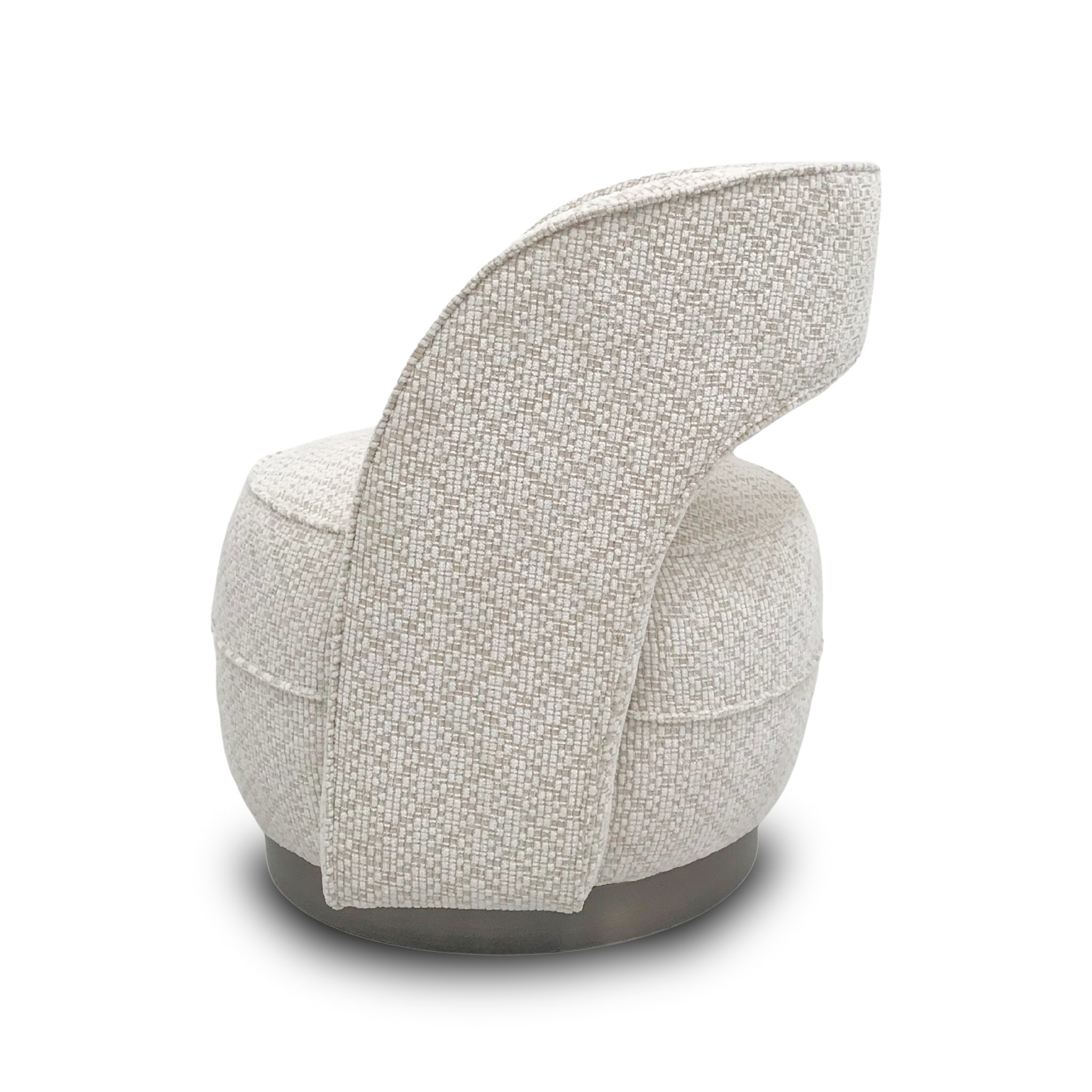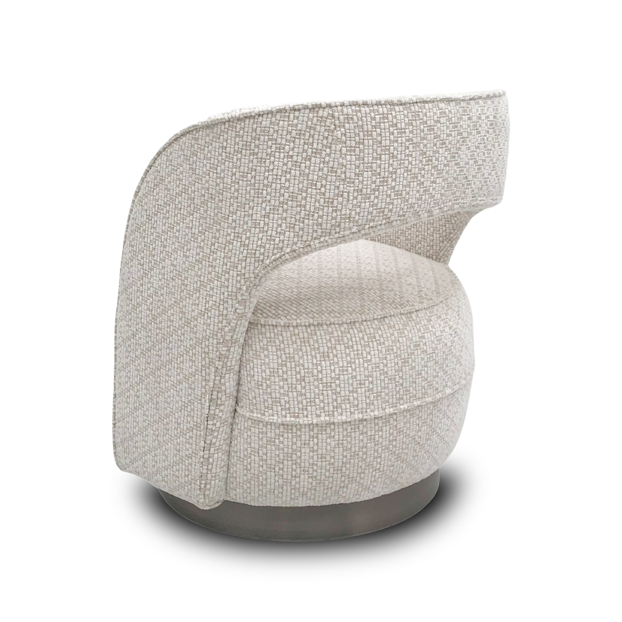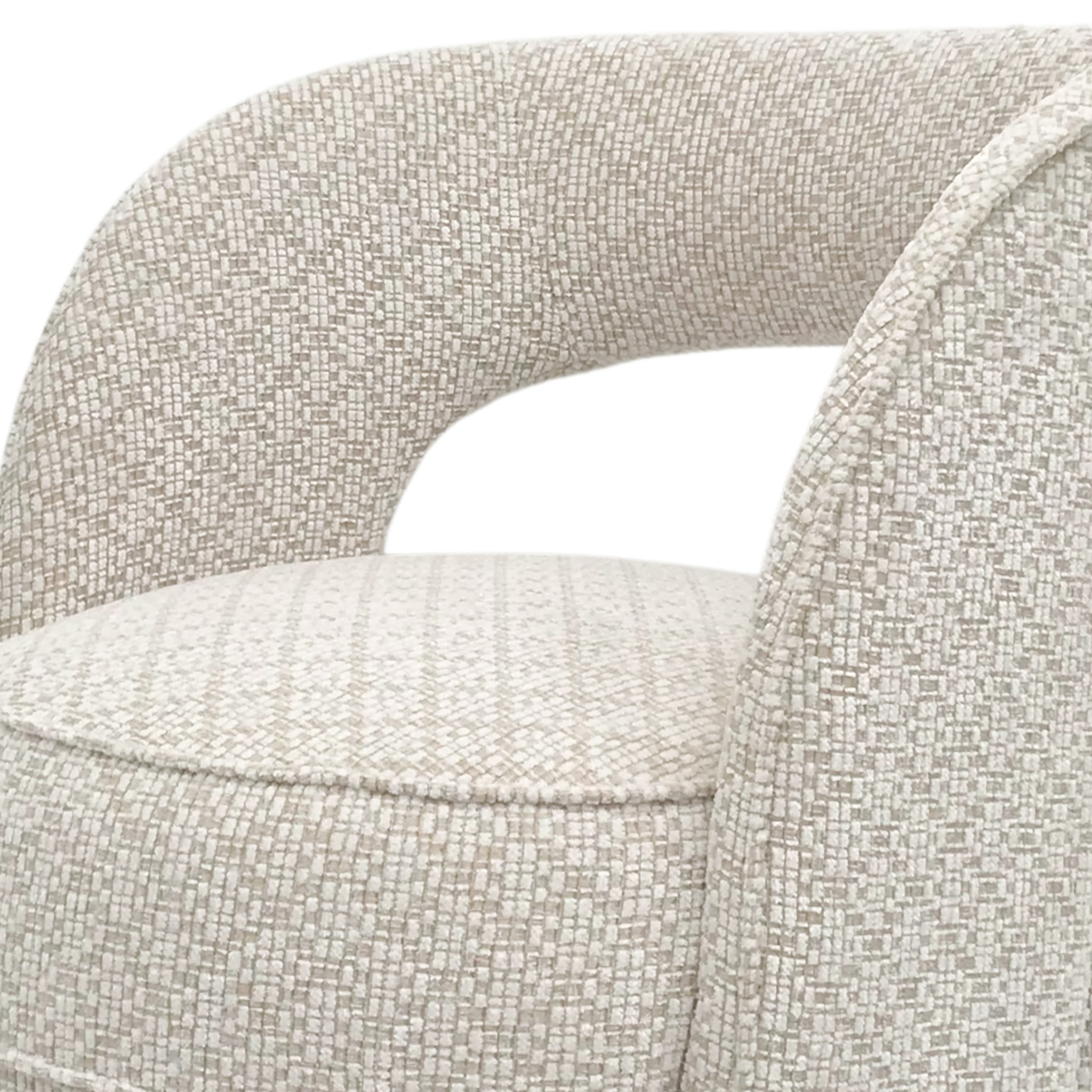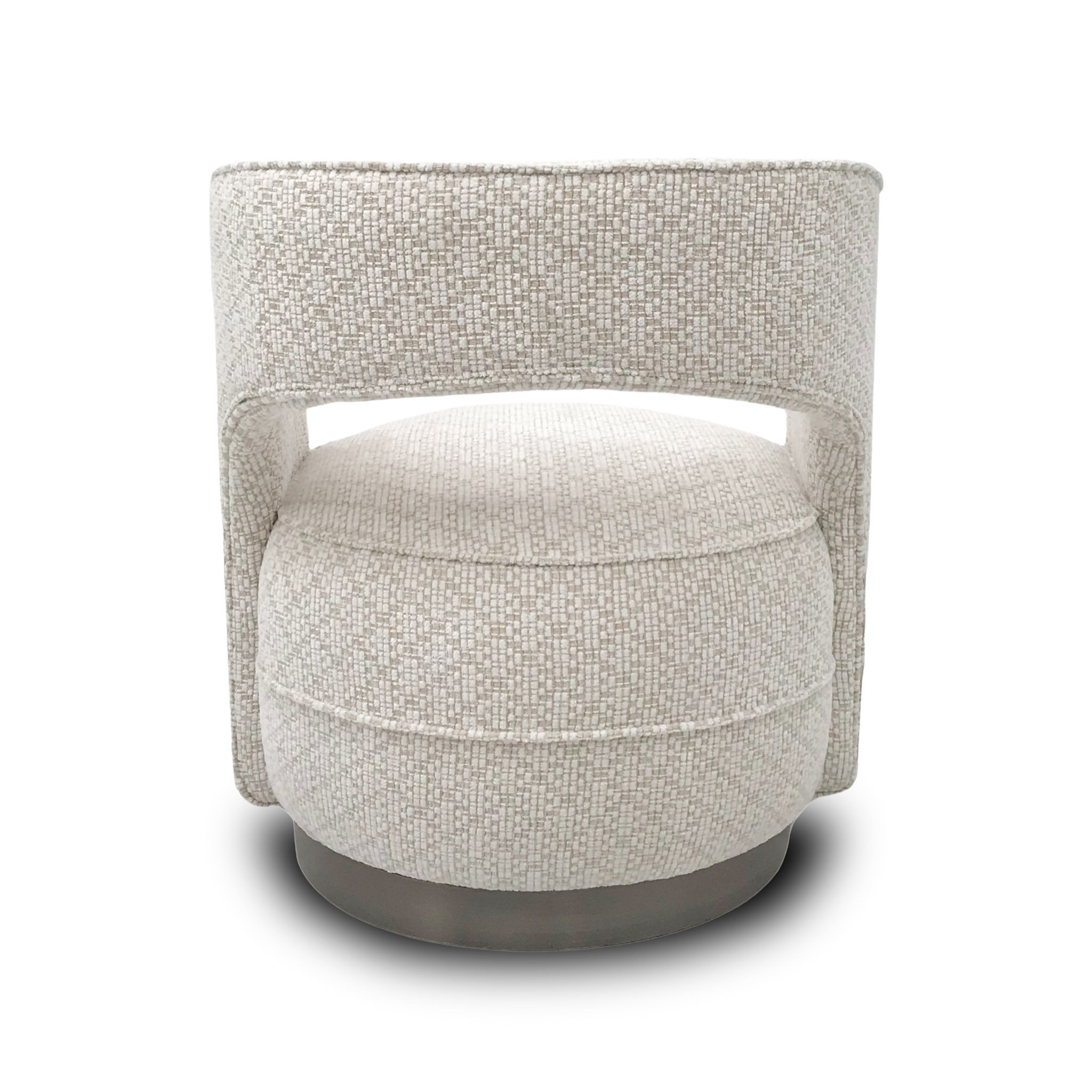 Sofisticación rotatoria. La poltrona Hampton destaca por su forma envolvente, tapizada en una mezcla de tonos crema y blanco que aportan luminosidad y serenidad. Su base metálica en acabado bronce le otorga un aire contemporáneo, perfecto para salones, estudios o rincones de lectura de estilo elevado.