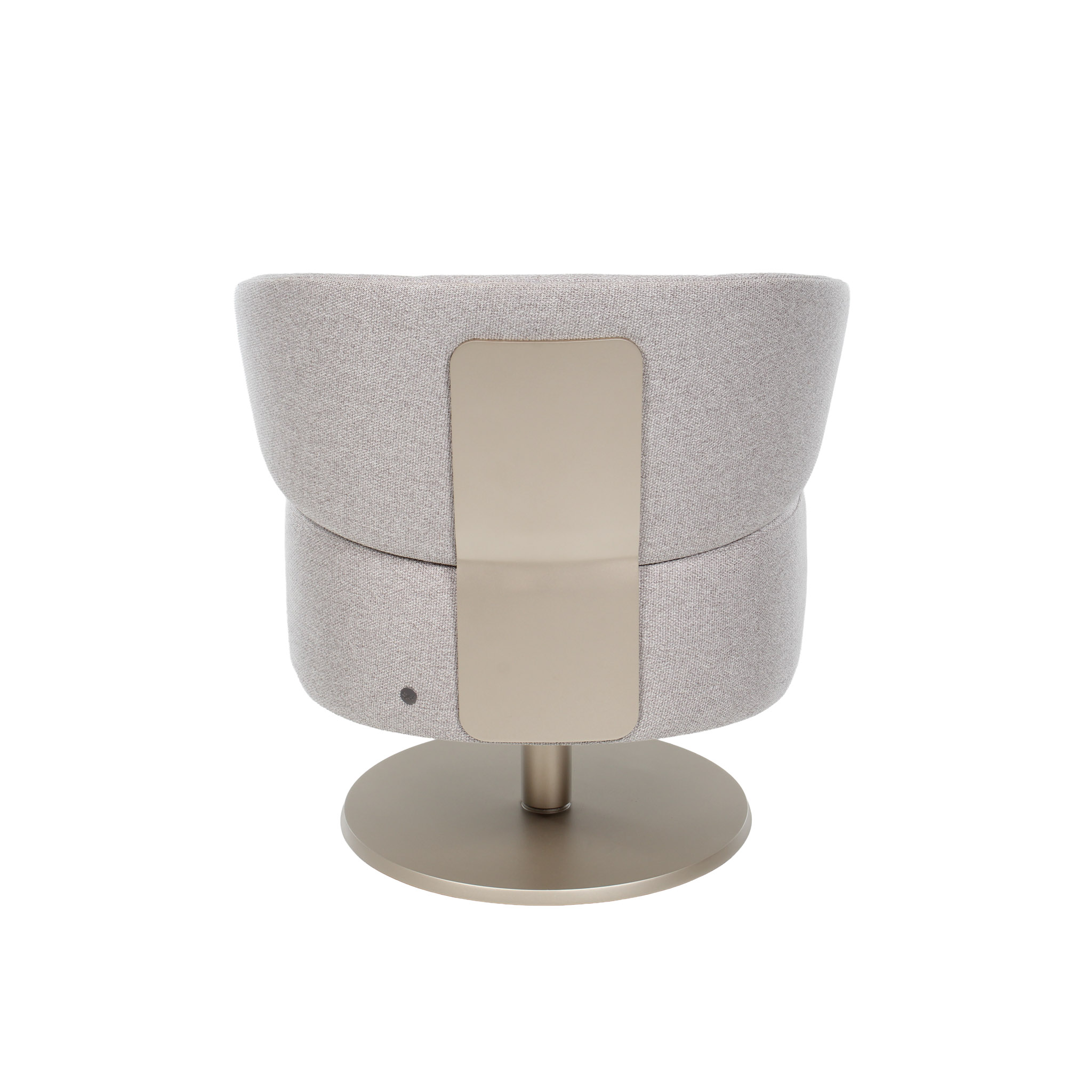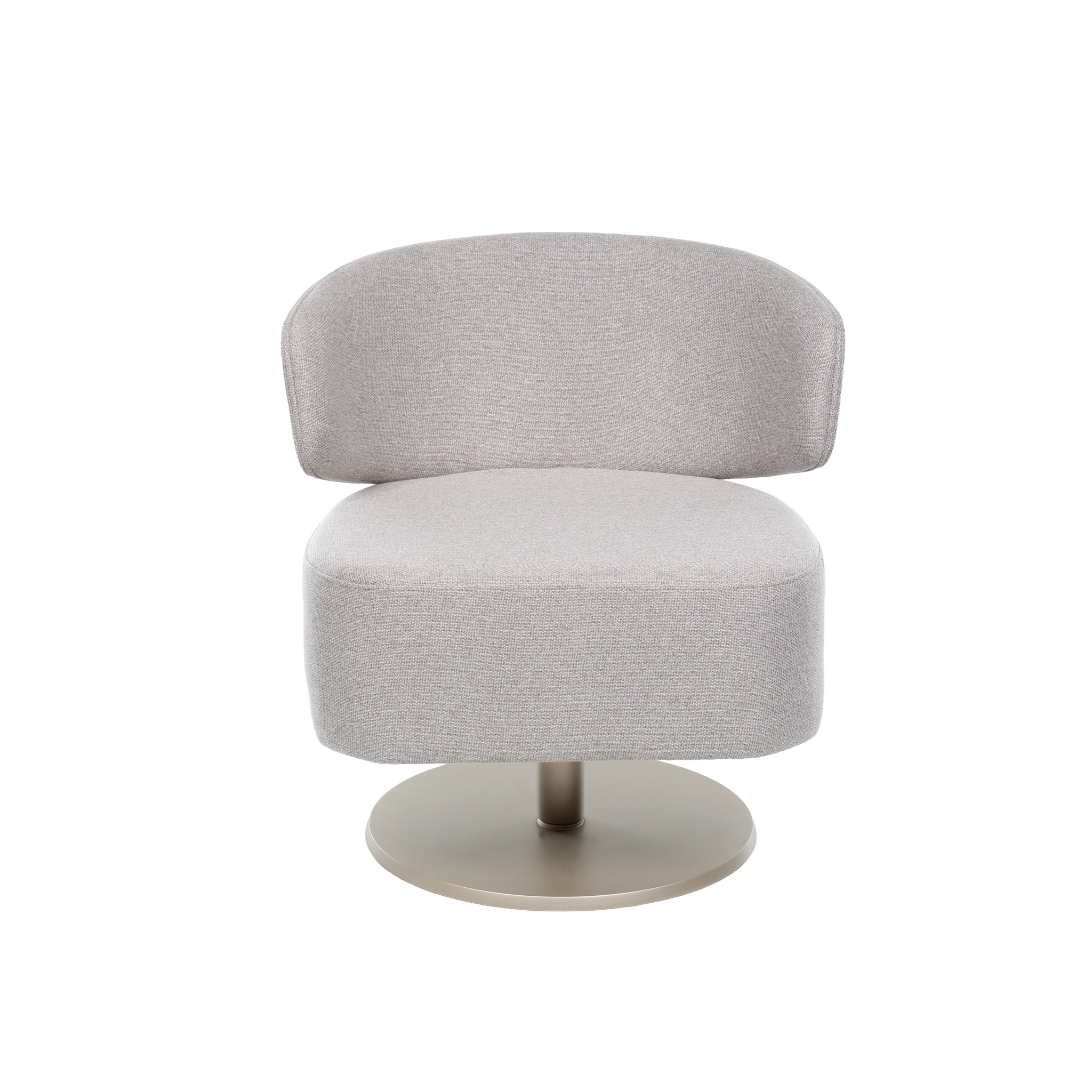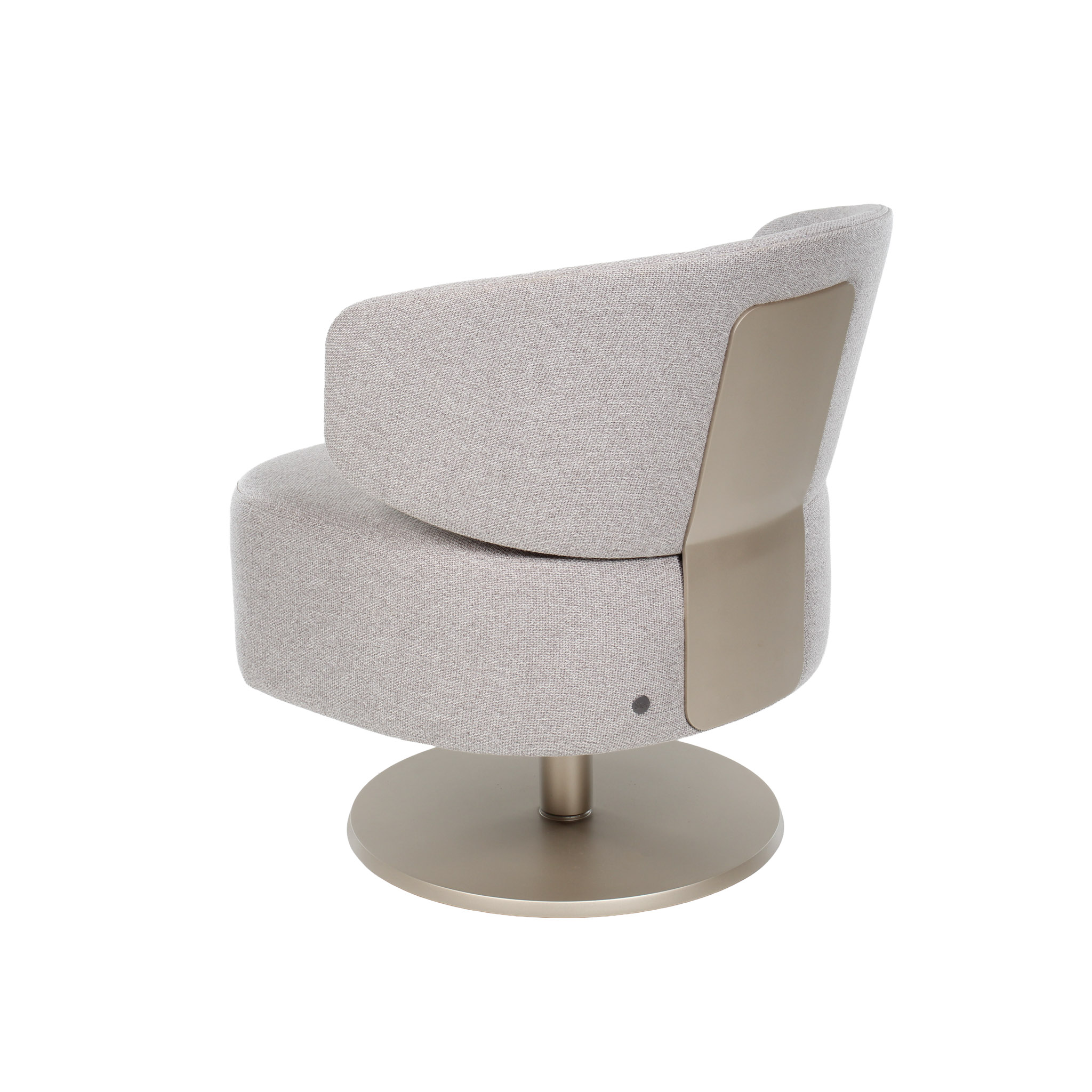 La poltrona modelo Lourdes combina el confort de su tapizado en tela con la funcionalidad de su base giratoria en metal color champaña. Su diseño elegante aporta un toque sofisticado y contemporáneo al espacio. Ideal para crear rincones acogedores con estilo.