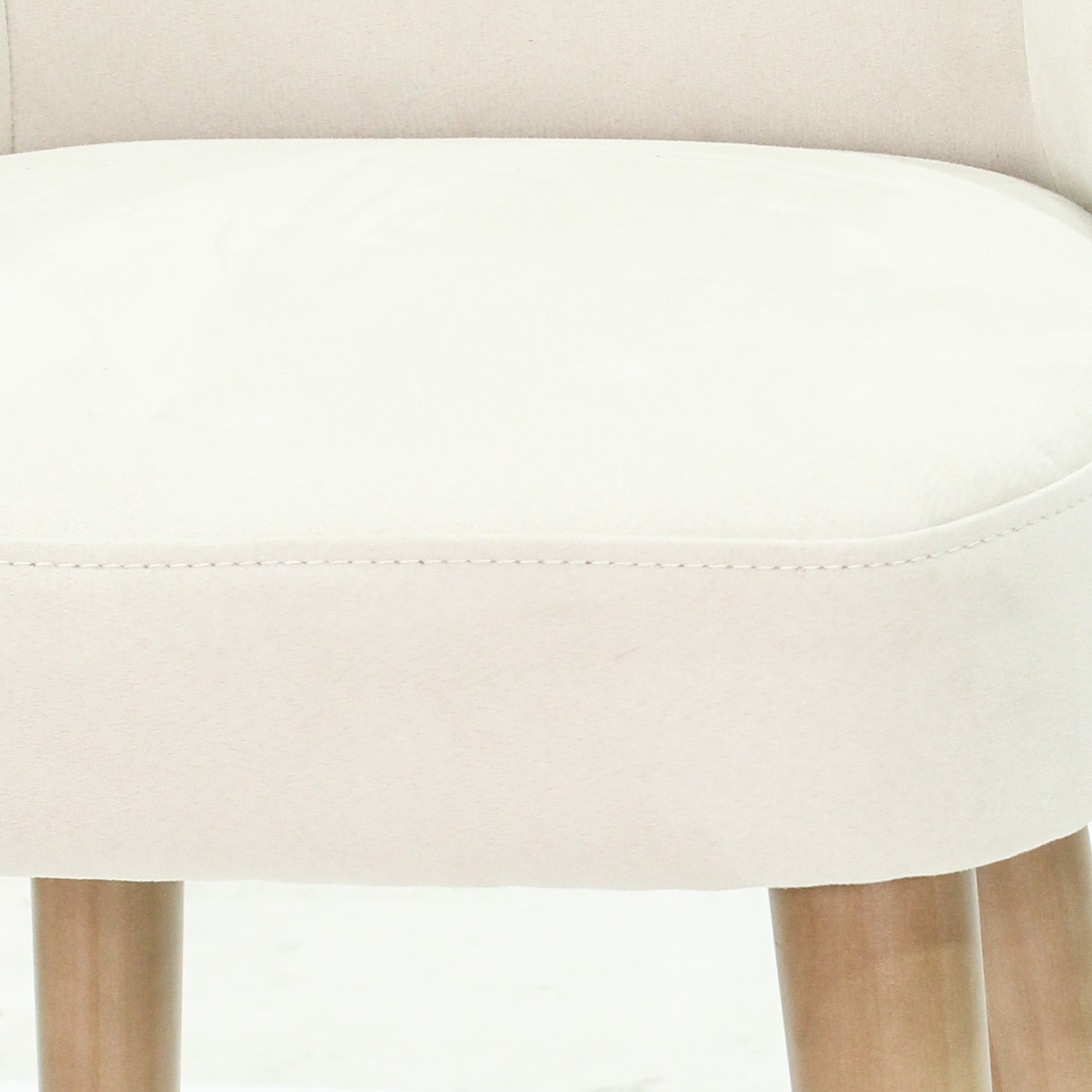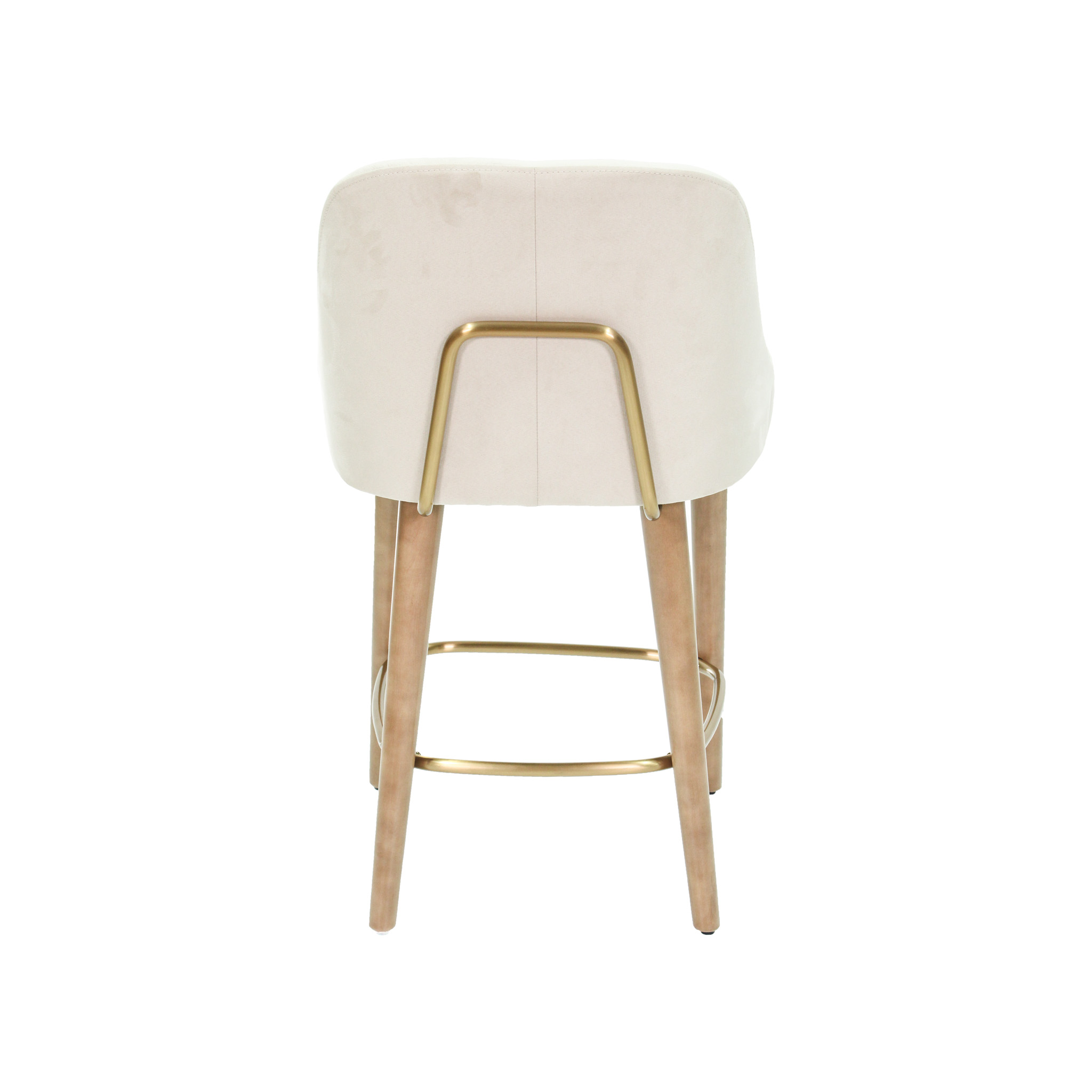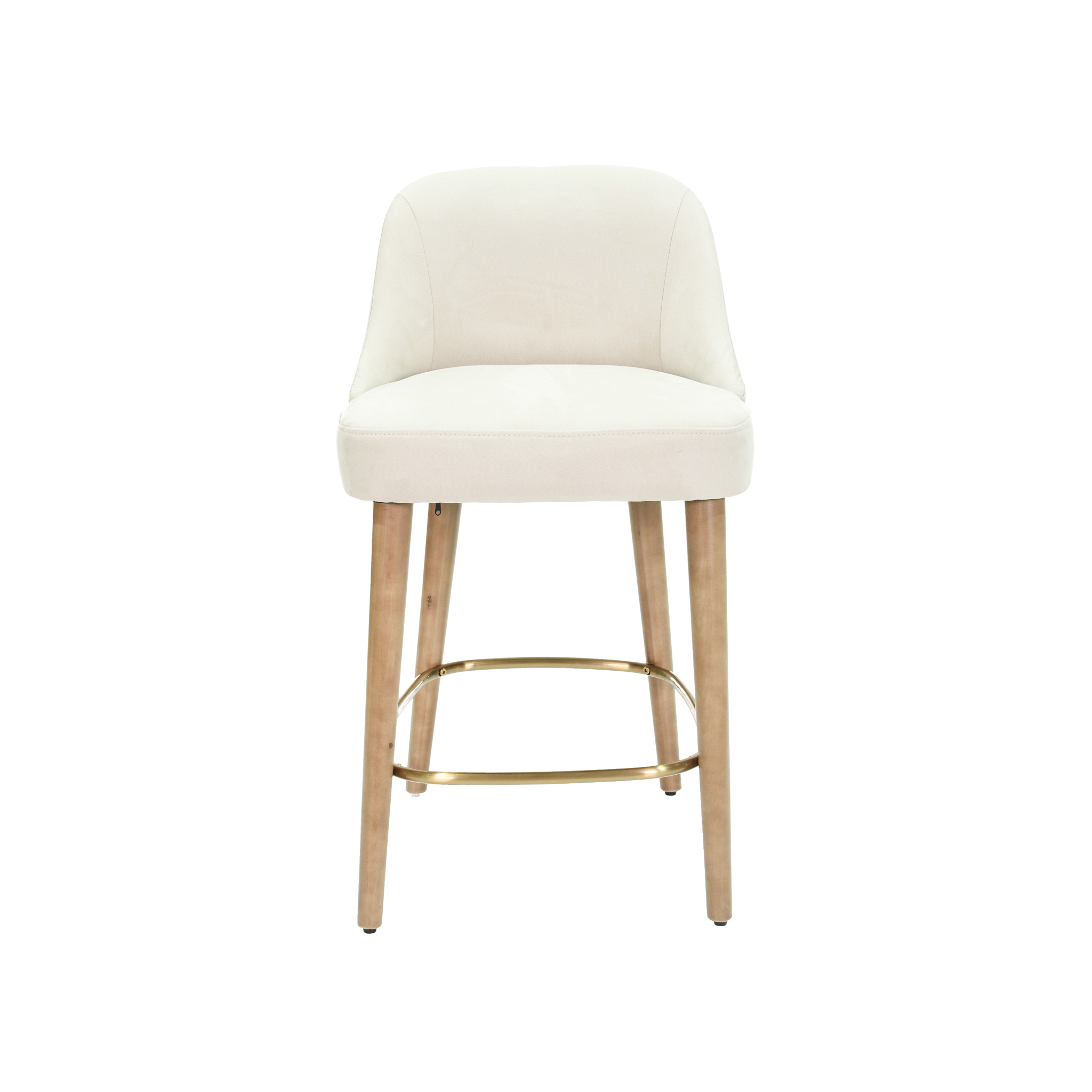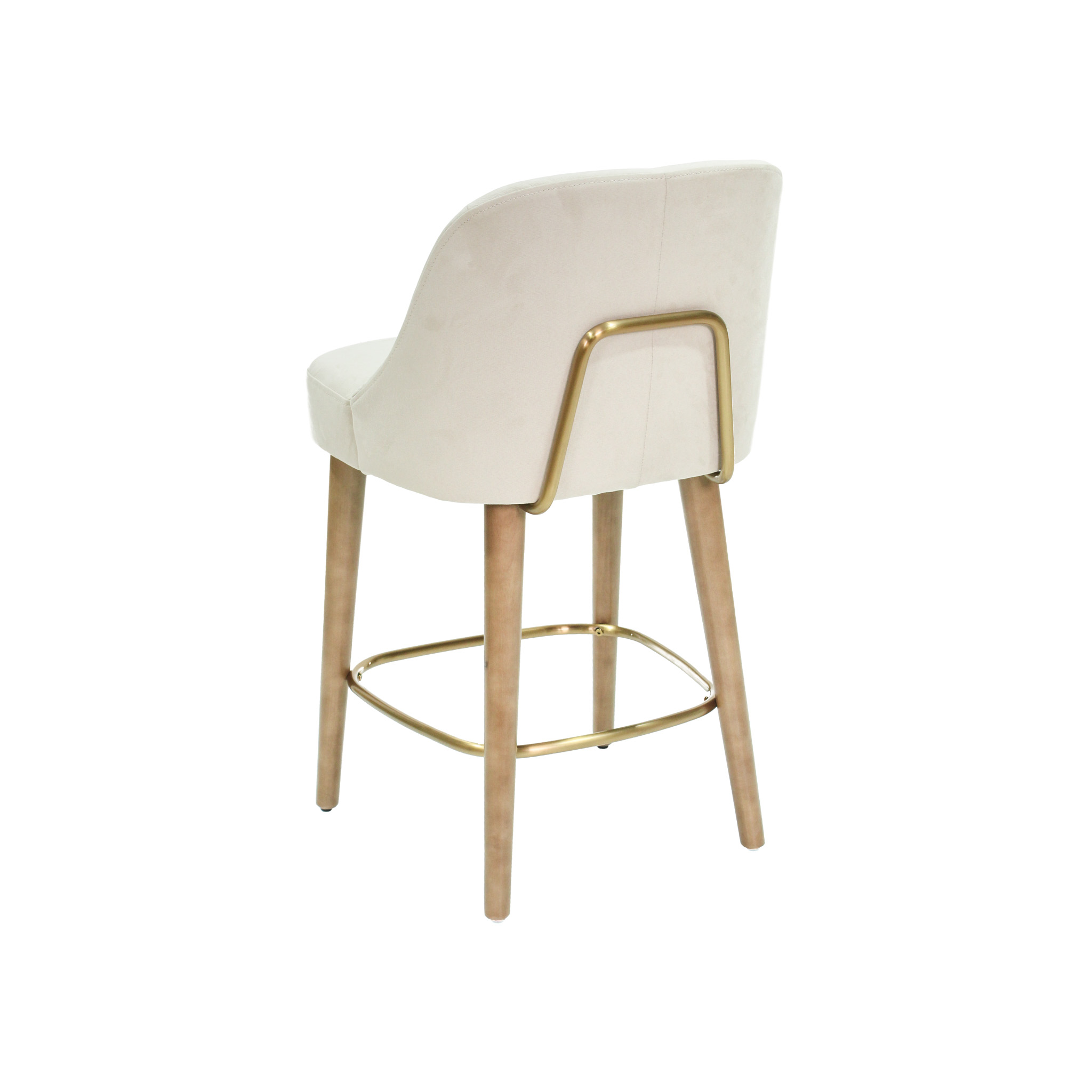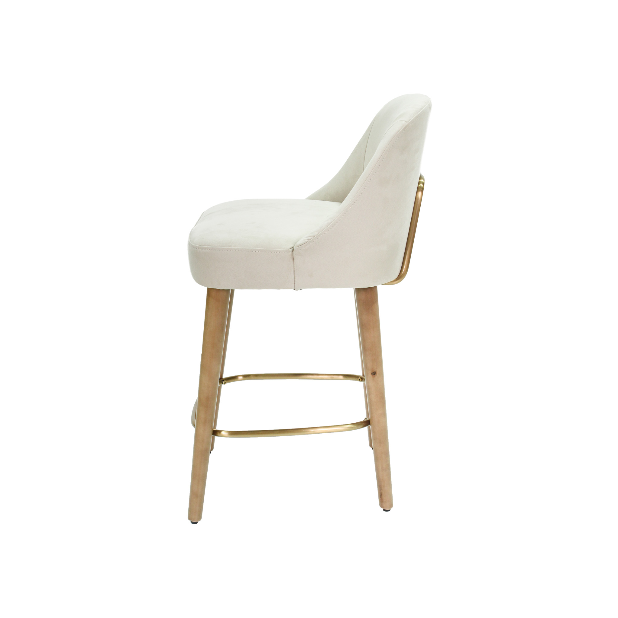 Silla de bar con asiento de tela en color crema con patas de madera natural y detalle de metal en color dorado.
