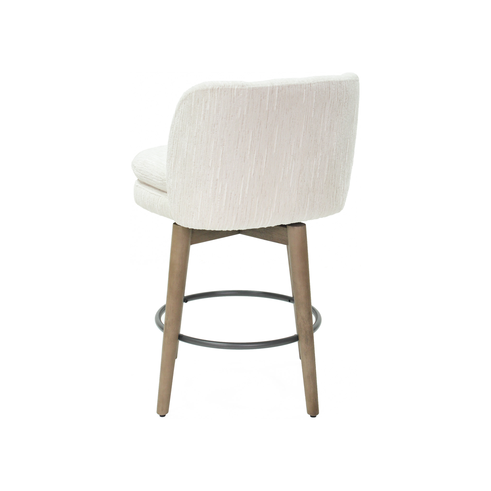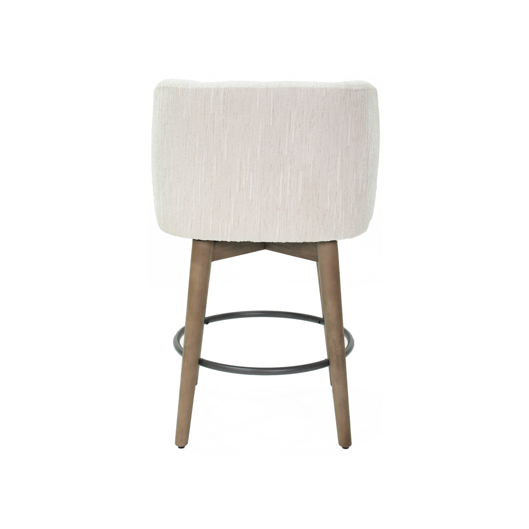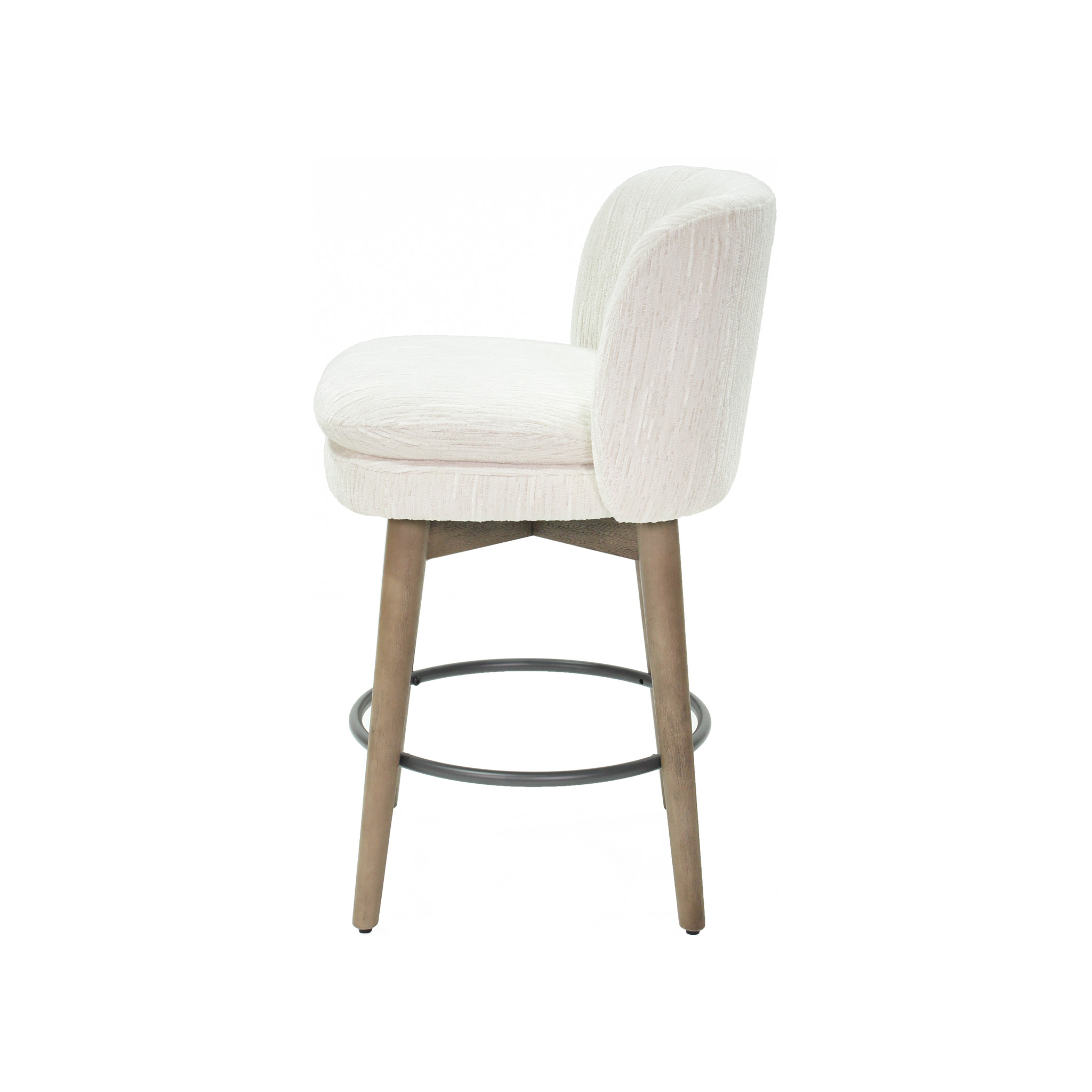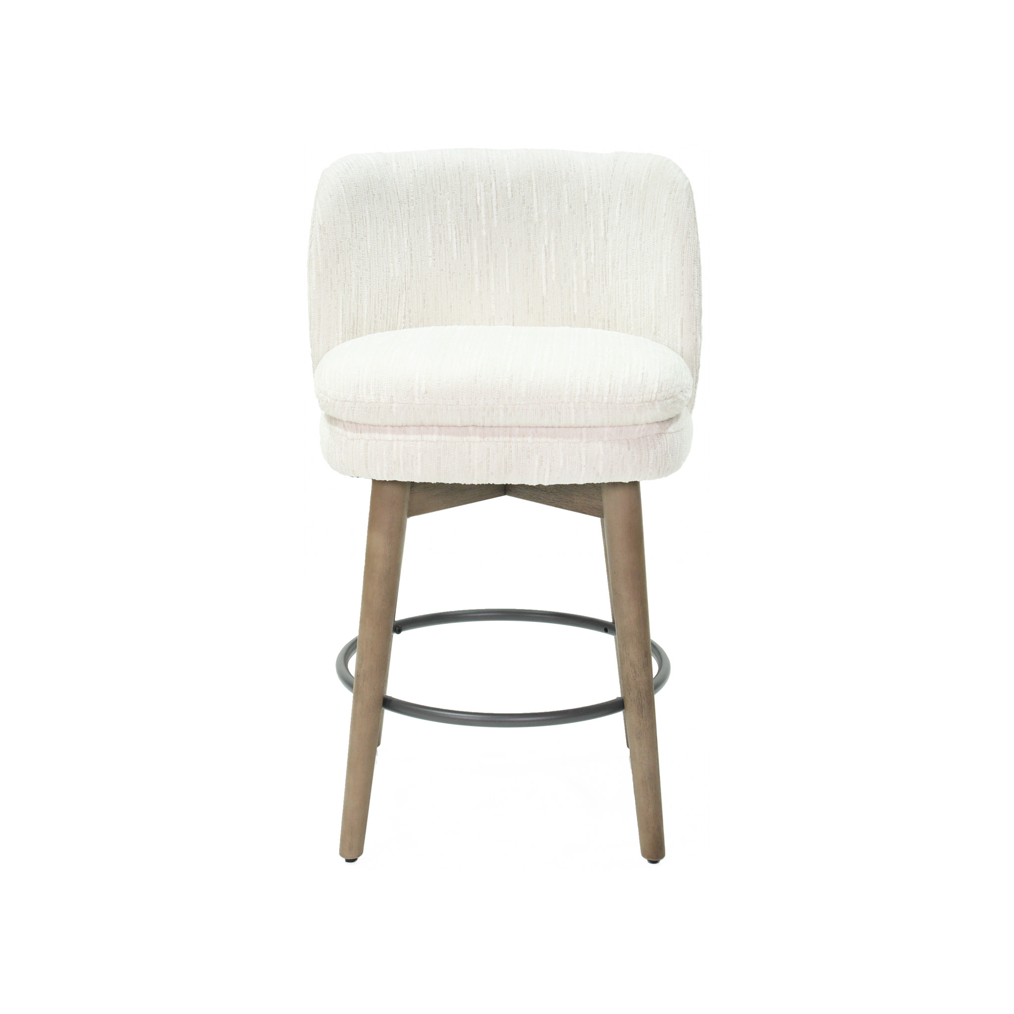 Esta elegante silla de bar cuenta con un tapizado en tela color ivory, ideal para brindar un toque de sofisticación a cualquier espacio. Su diseño giratorio facilita la movilidad, mientras que las patas de madera natural aportan un aspecto cálido y acogedor. Perfecta para complementar barras o islas de cocina con estilo moderno o clásico.
