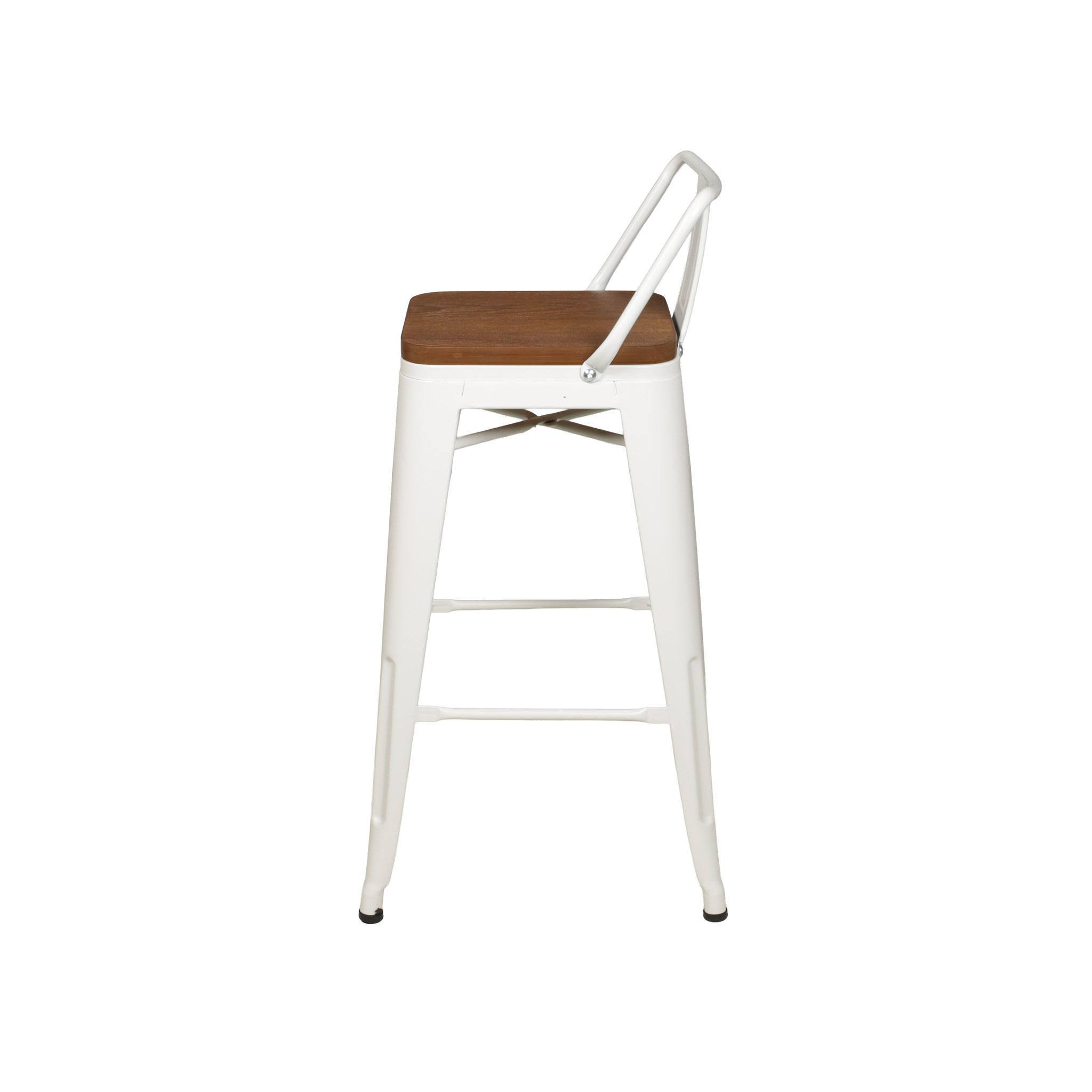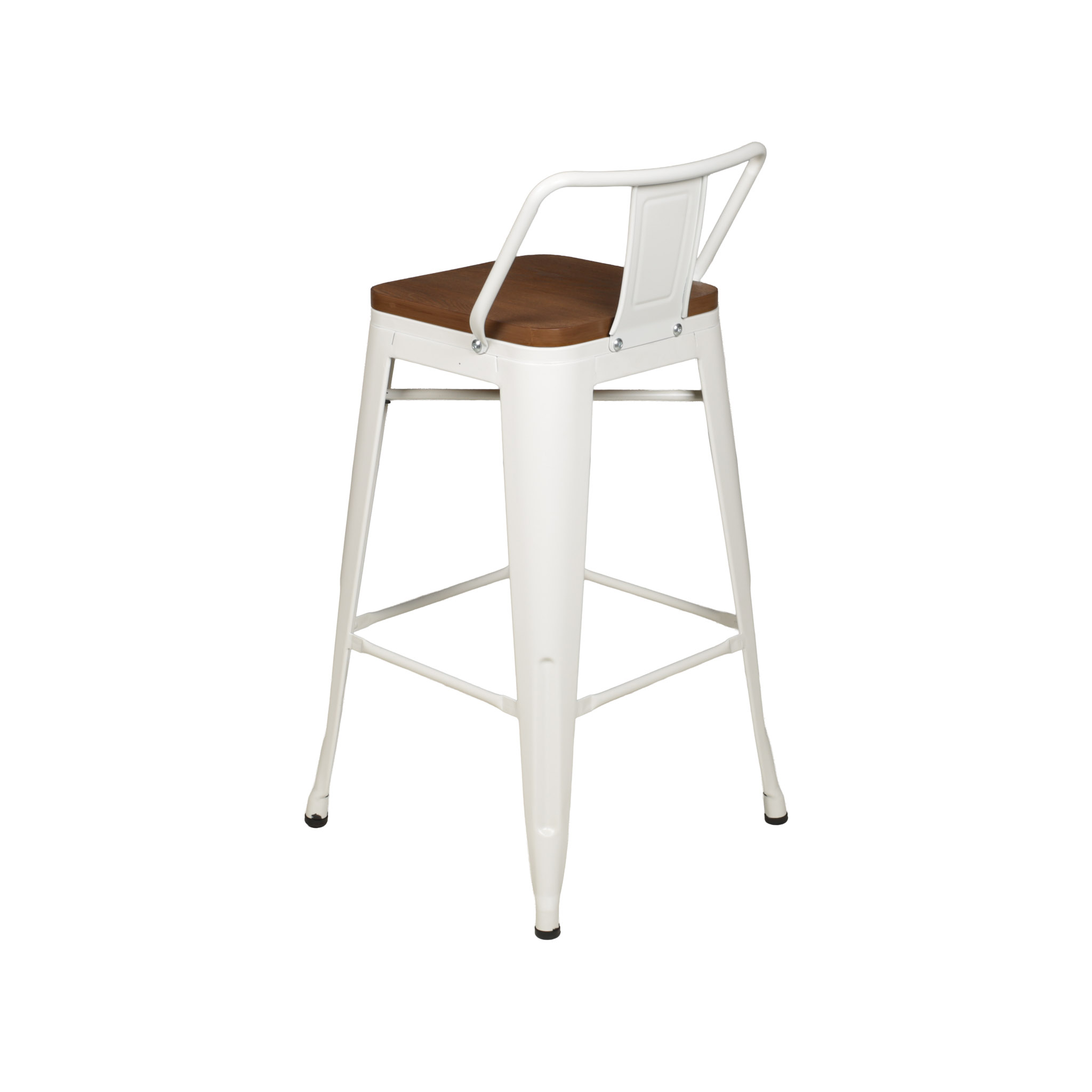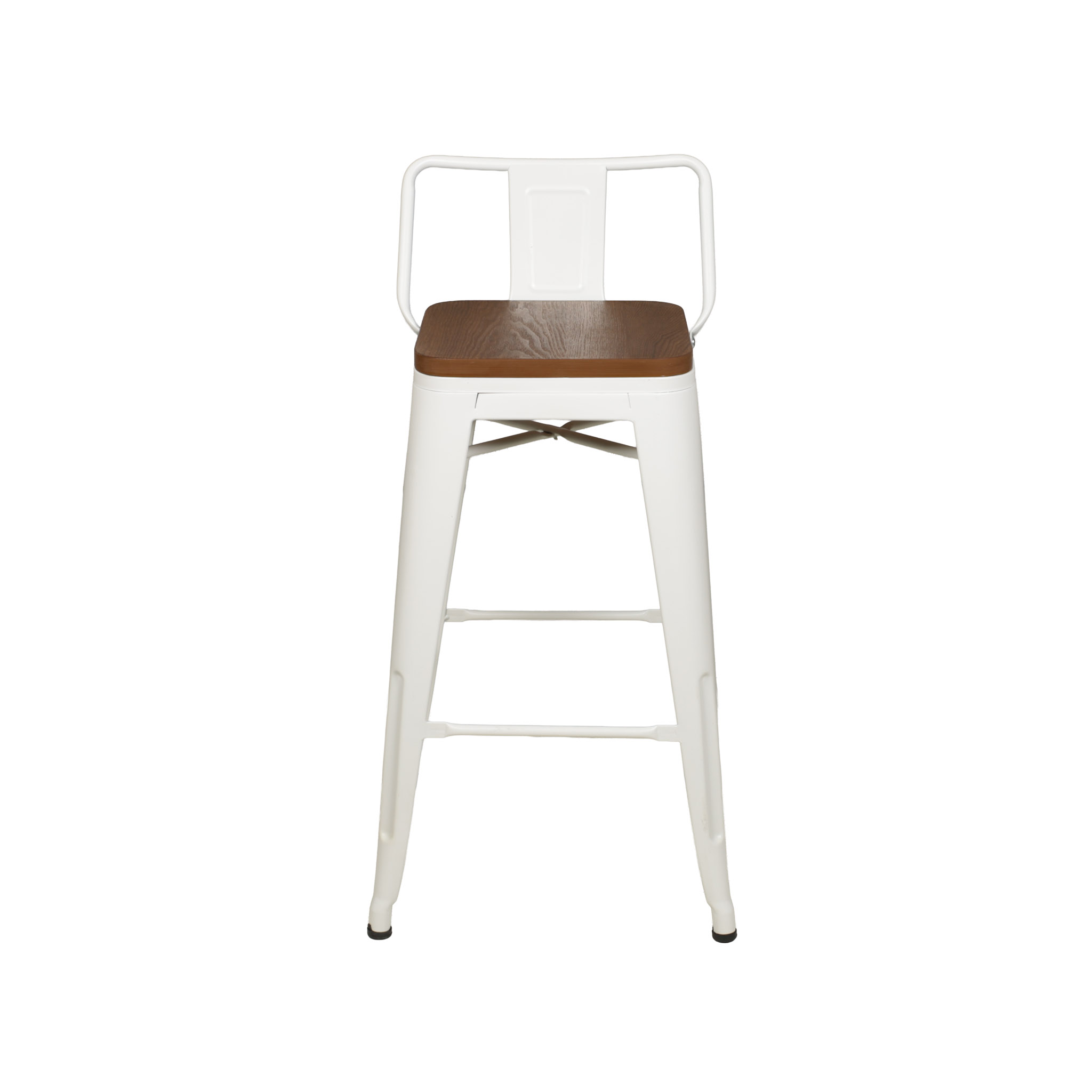 Silla alta para counter / bar de metal blanco, con asiento de madera chocolate.