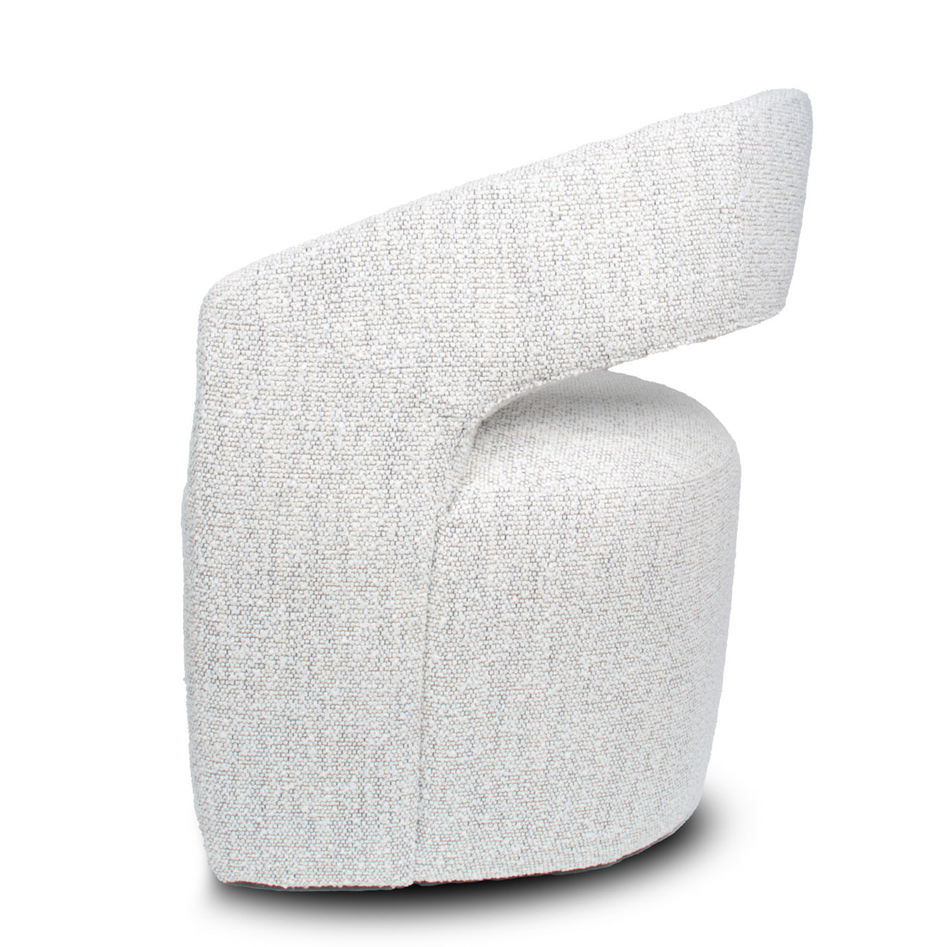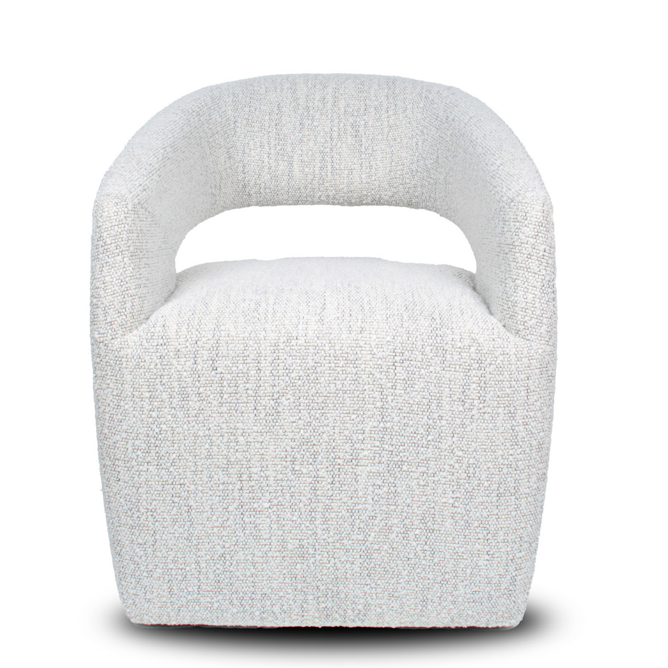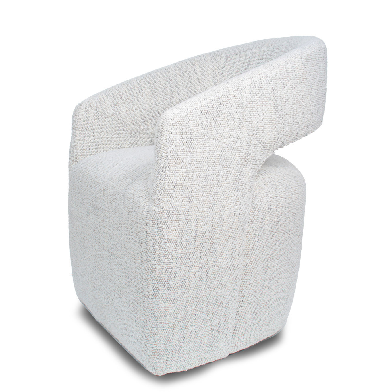 Silla de comedor con ruedas de tela en color blanco. Su diseño limpio y versátil se adapta a cualquier estilo de decoración. Perfecta para añadir comodidad y elegancia a tu espacio.