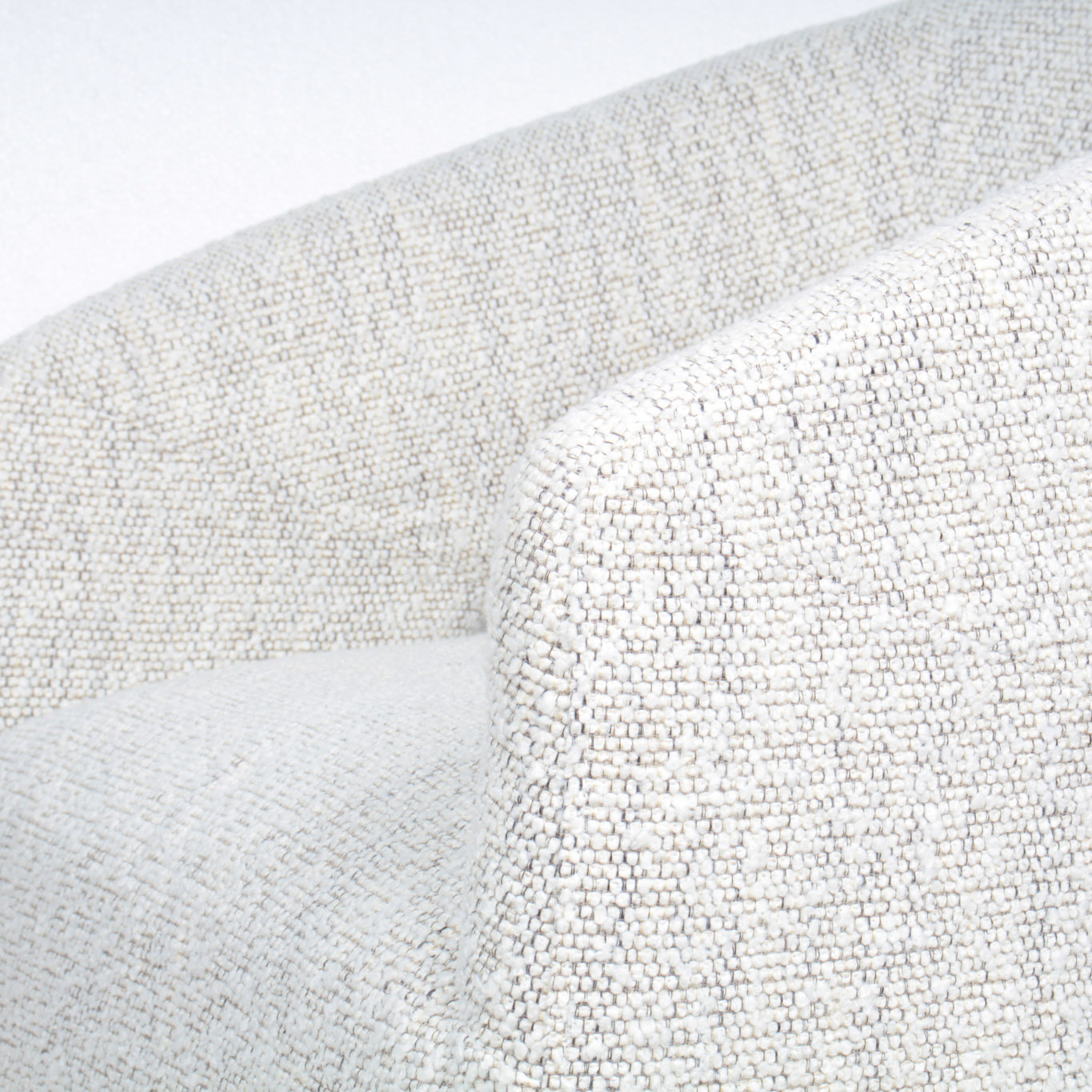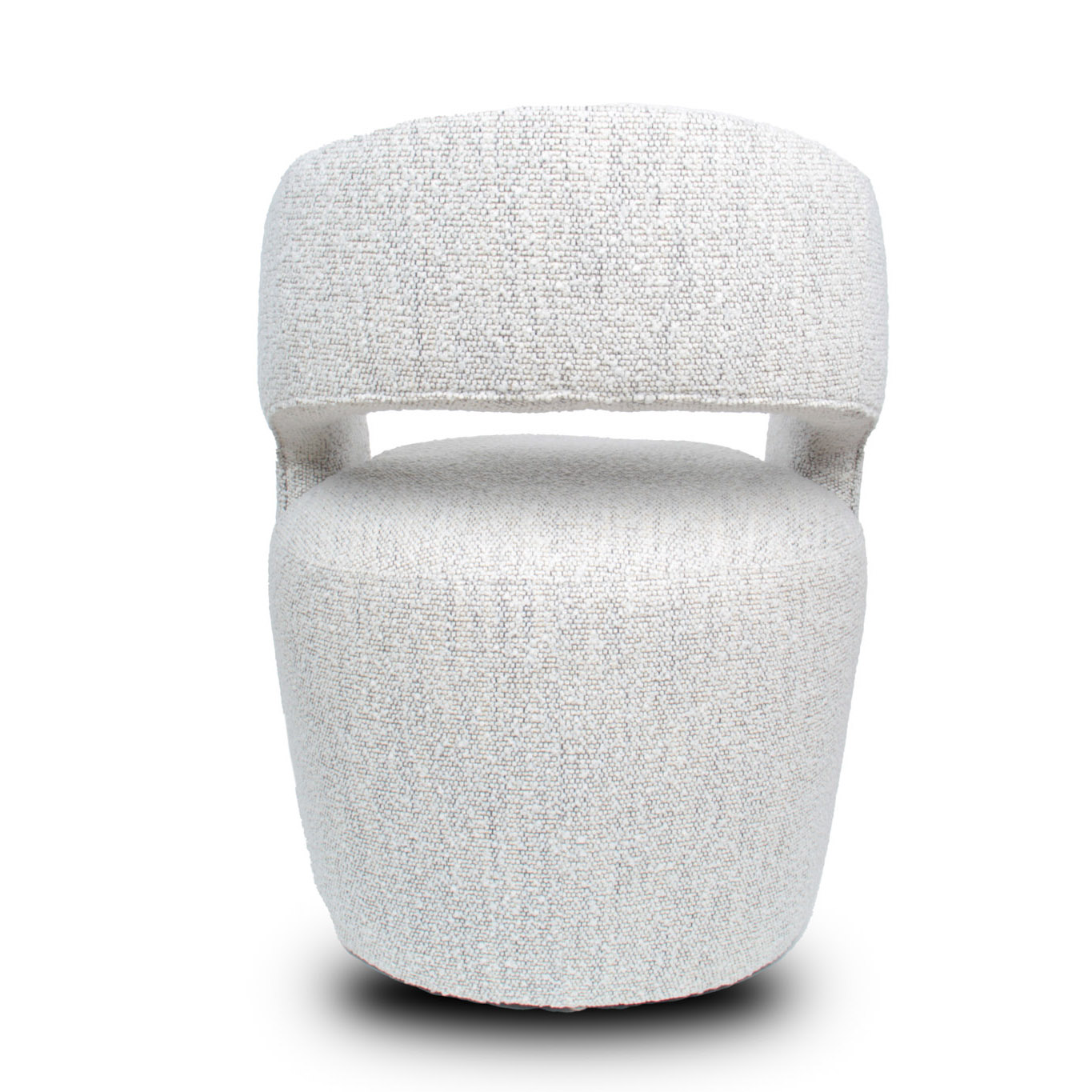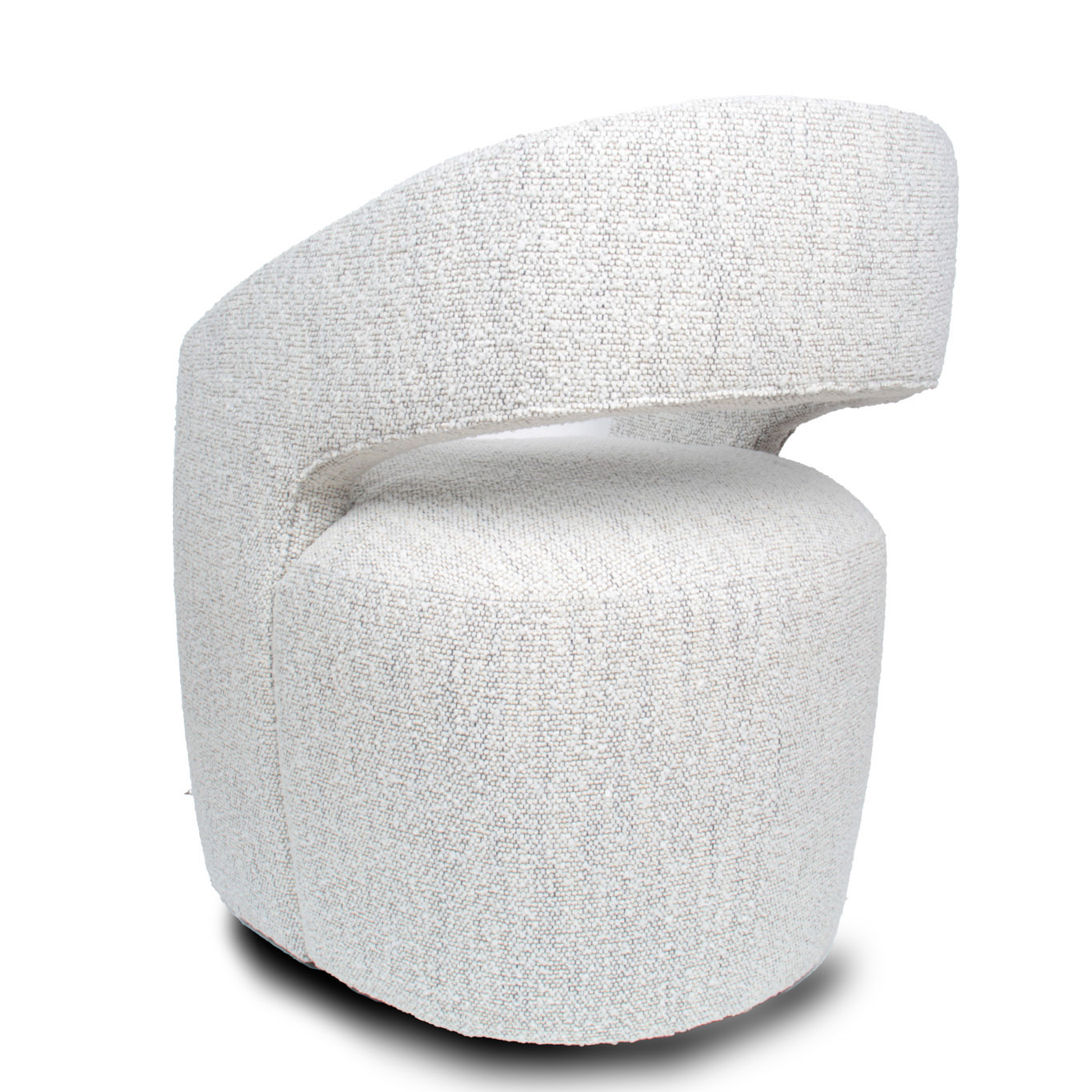 Silla de comedor con ruedas de tela en color blanco. Su diseño limpio y versátil se adapta a cualquier estilo de decoración. Perfecta para añadir comodidad y elegancia a tu espacio.