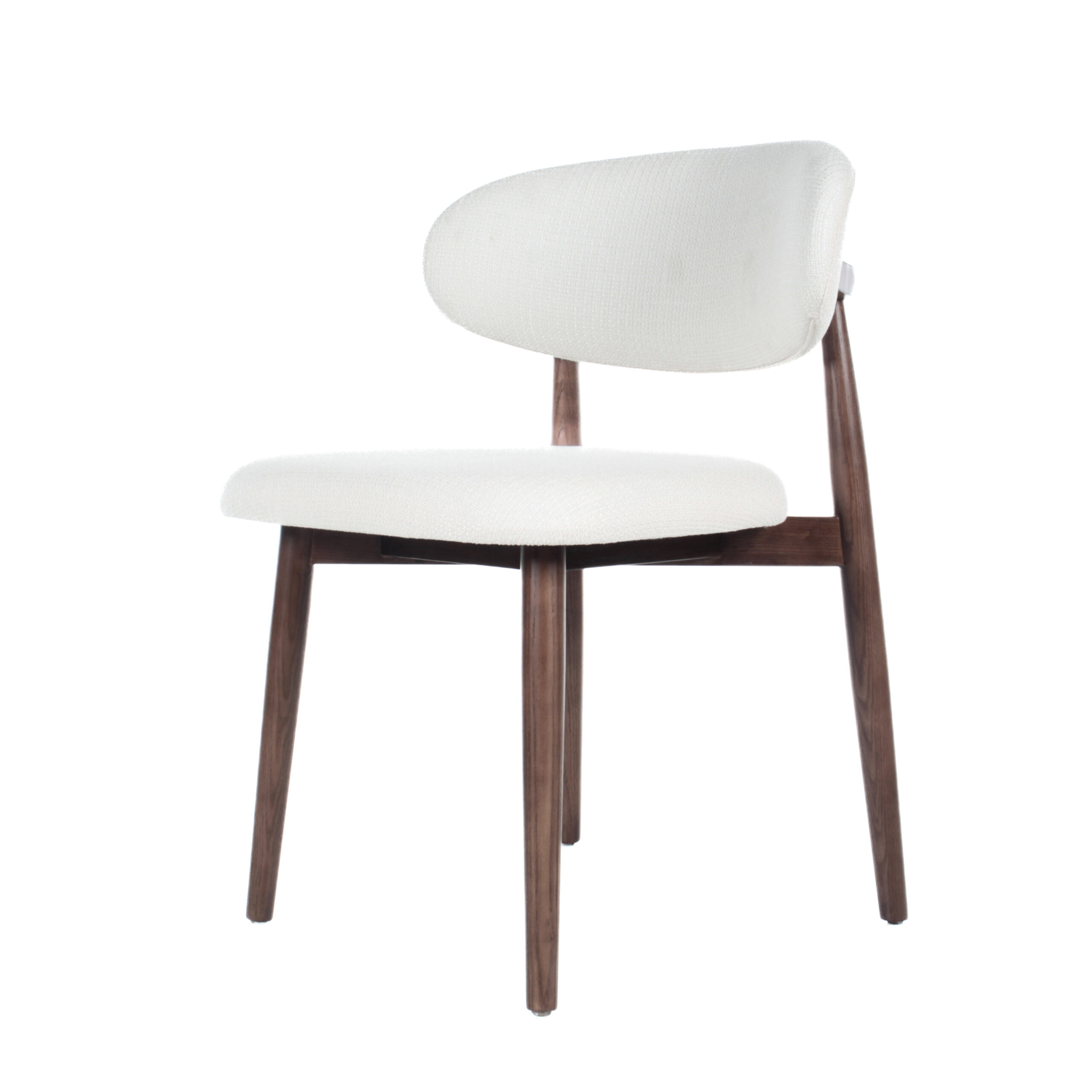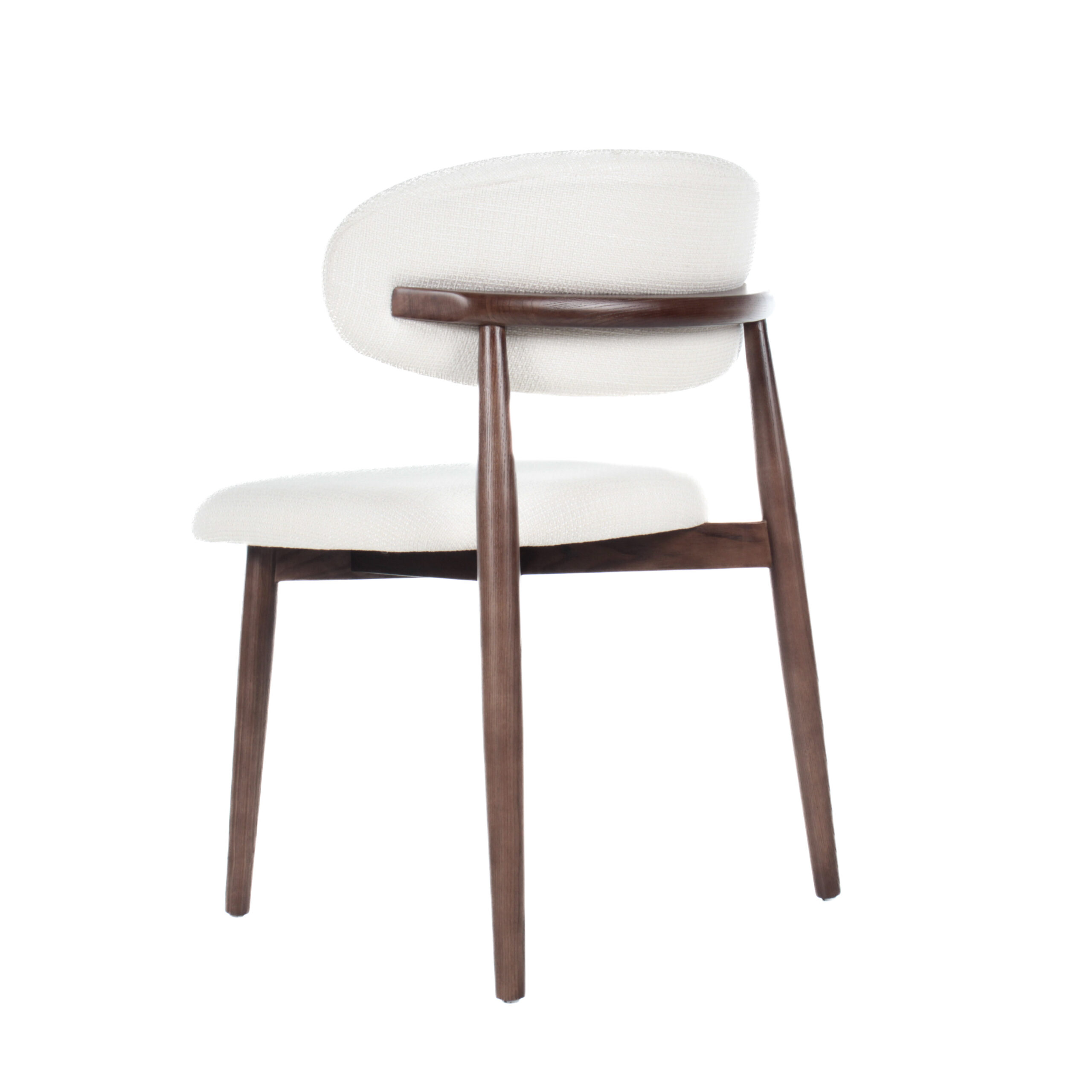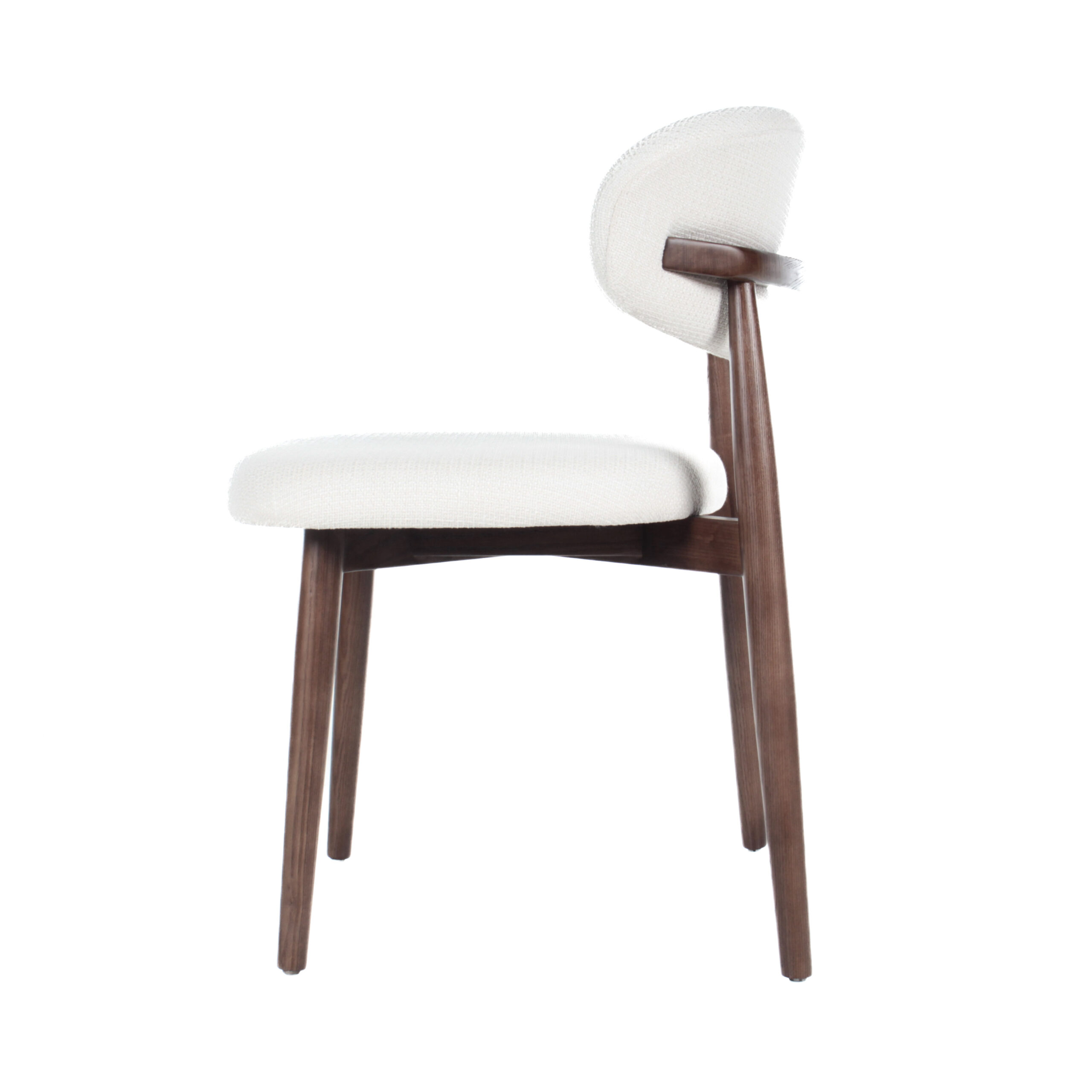 Con un diseño cálido y moderno, esta silla de comedor combina un tapizado en tela blanca que brinda elegancia y confort con patas de madera chocolate oscuro que aportan estabilidad y un toque orgánico. Ideal para comedores contemporáneos y acogedores.