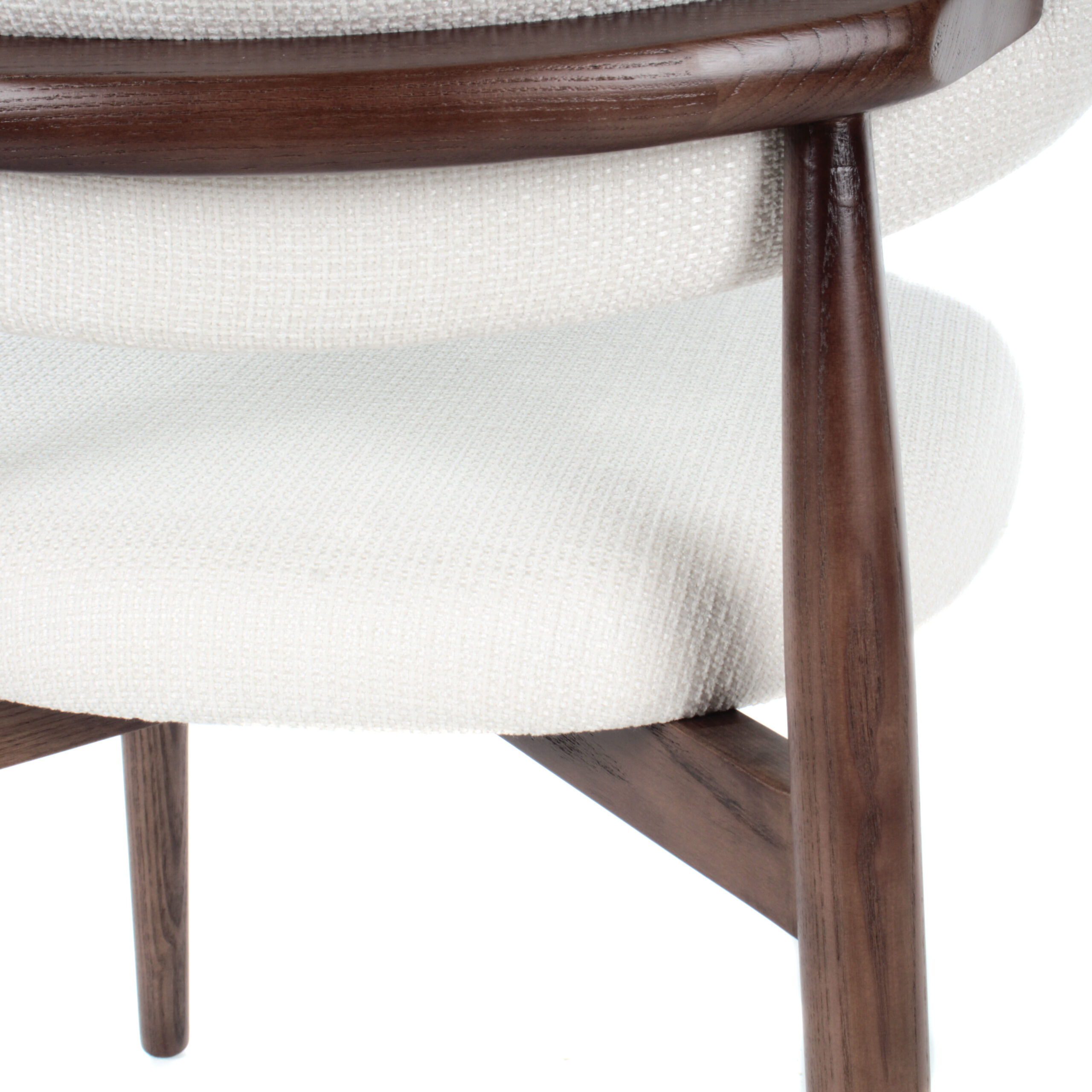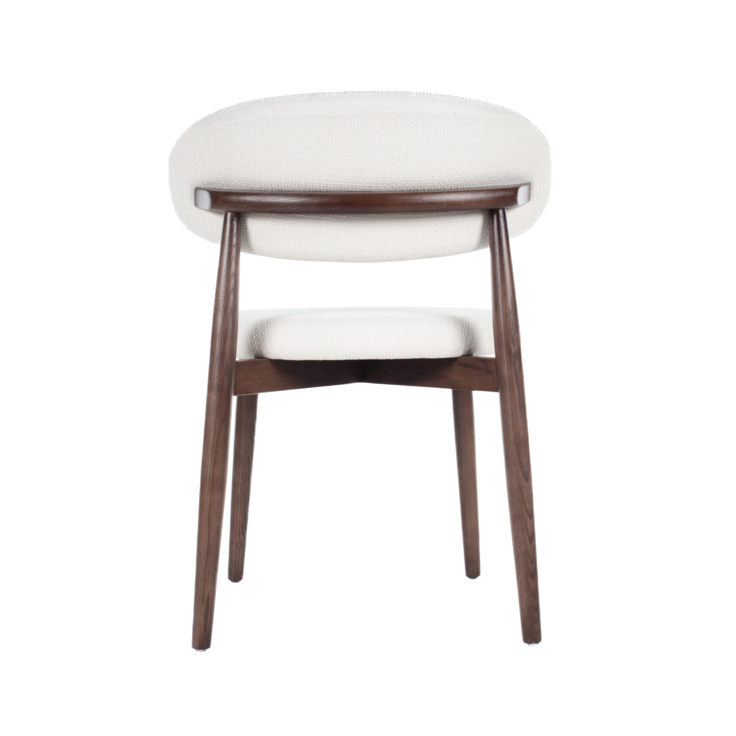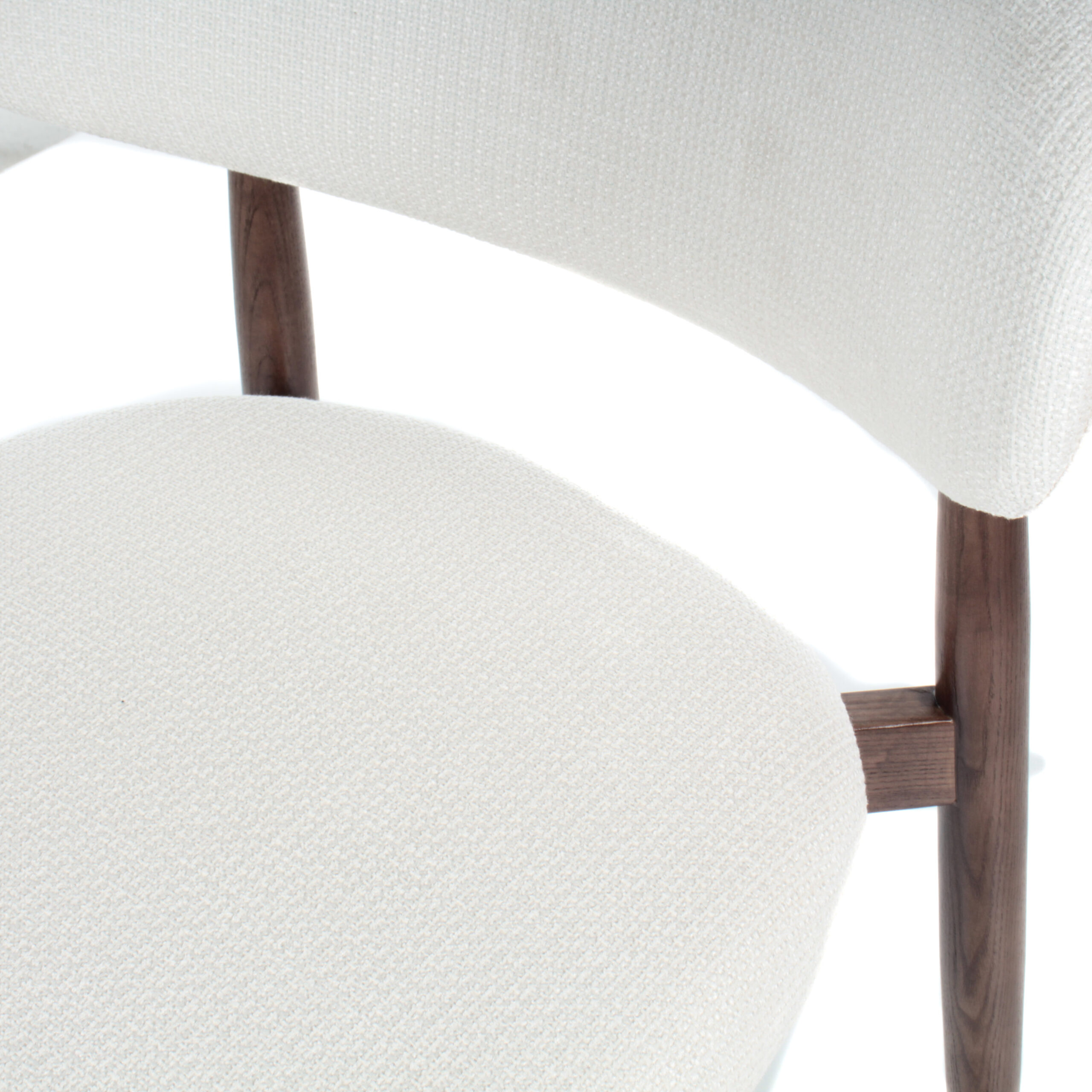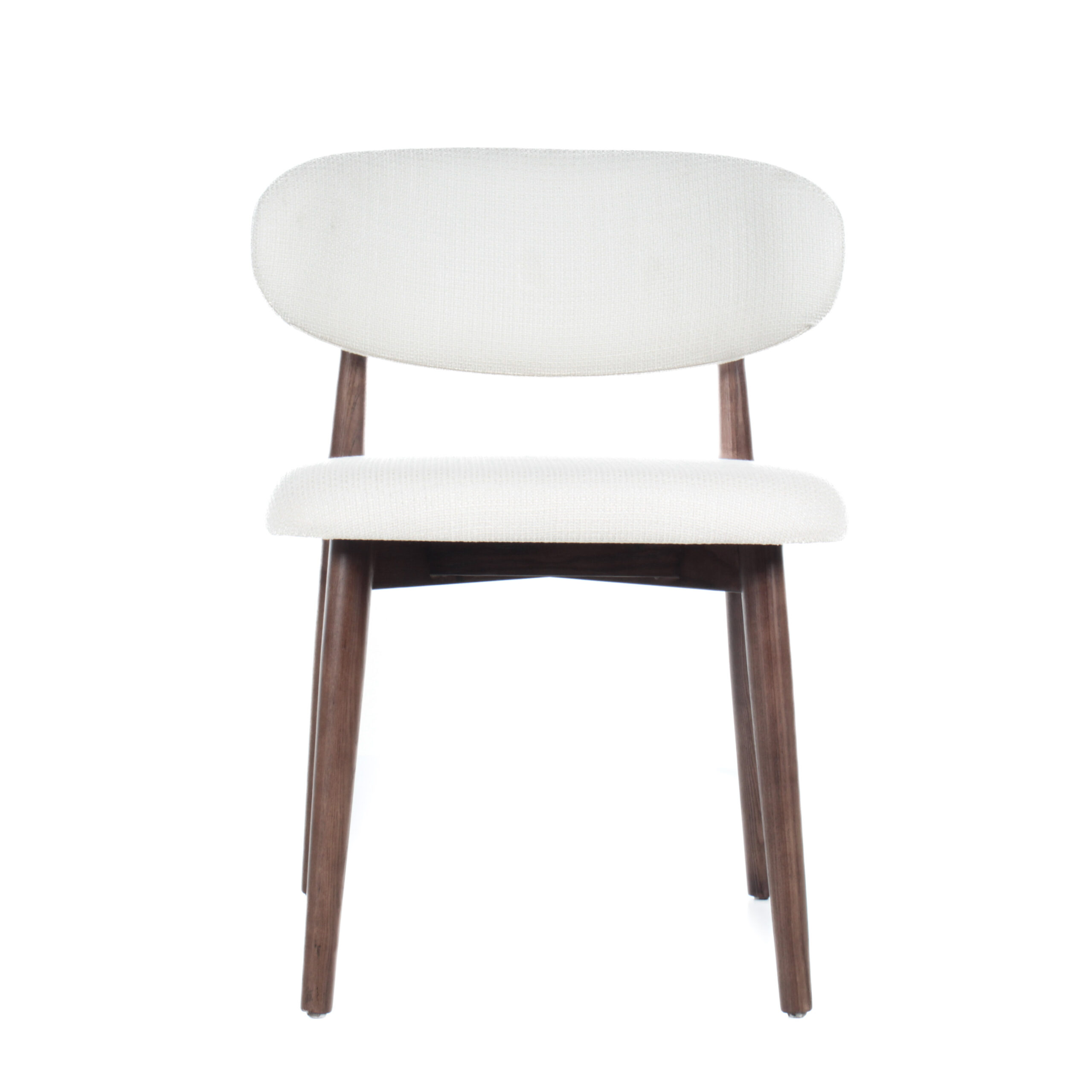 Con un diseño cálido y moderno, esta silla de comedor combina un tapizado en tela blanca que brinda elegancia y confort con patas de madera chocolate oscuro que aportan estabilidad y un toque orgánico. Ideal para comedores contemporáneos y acogedores.