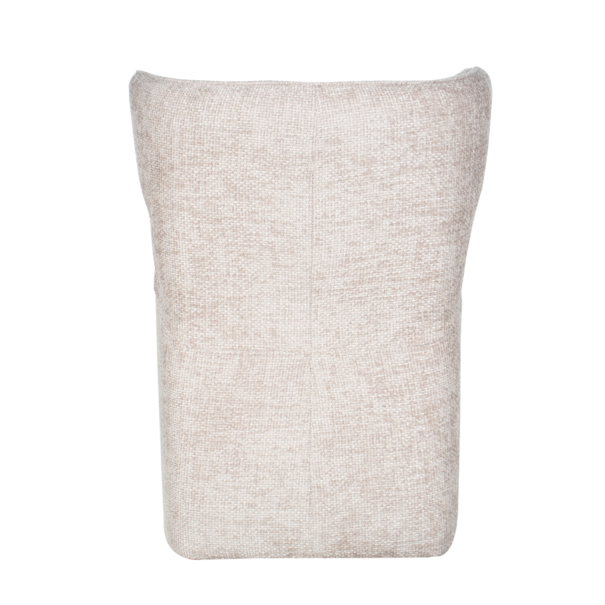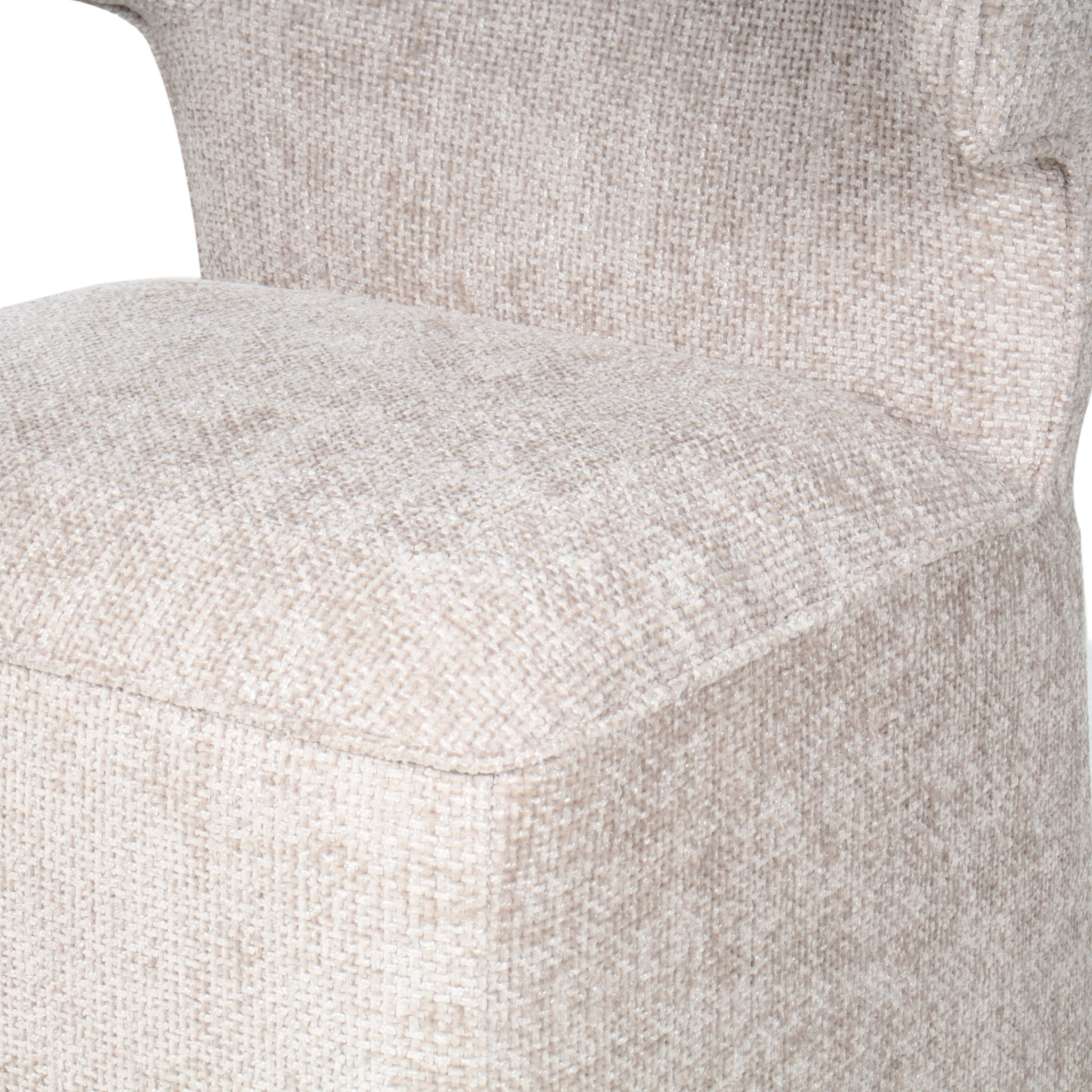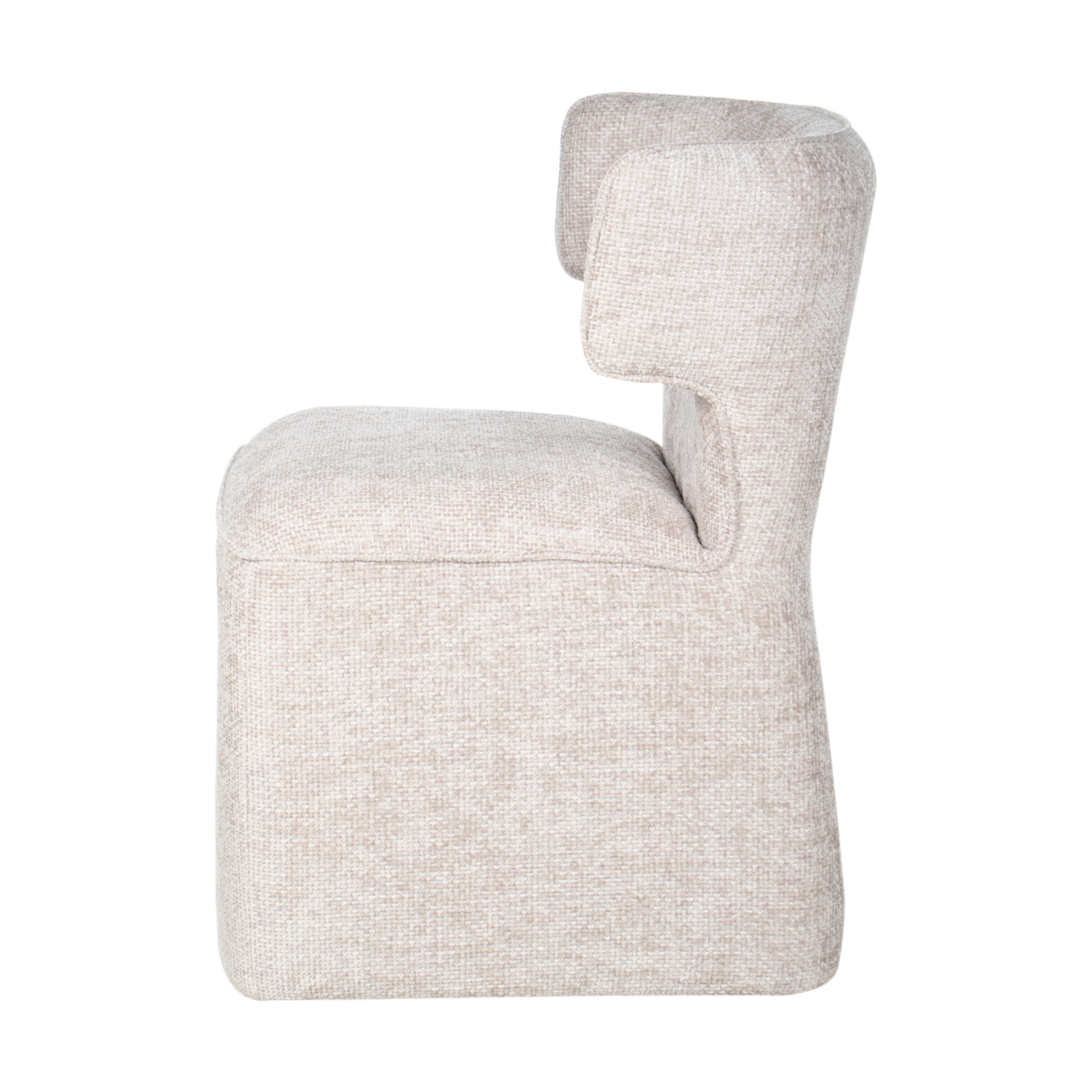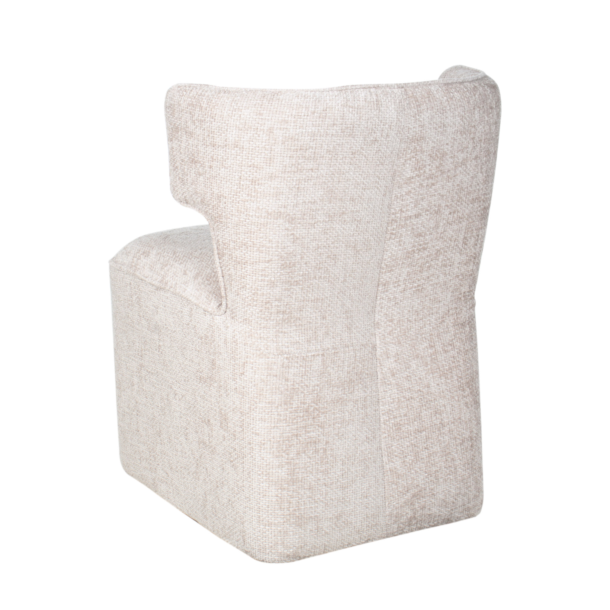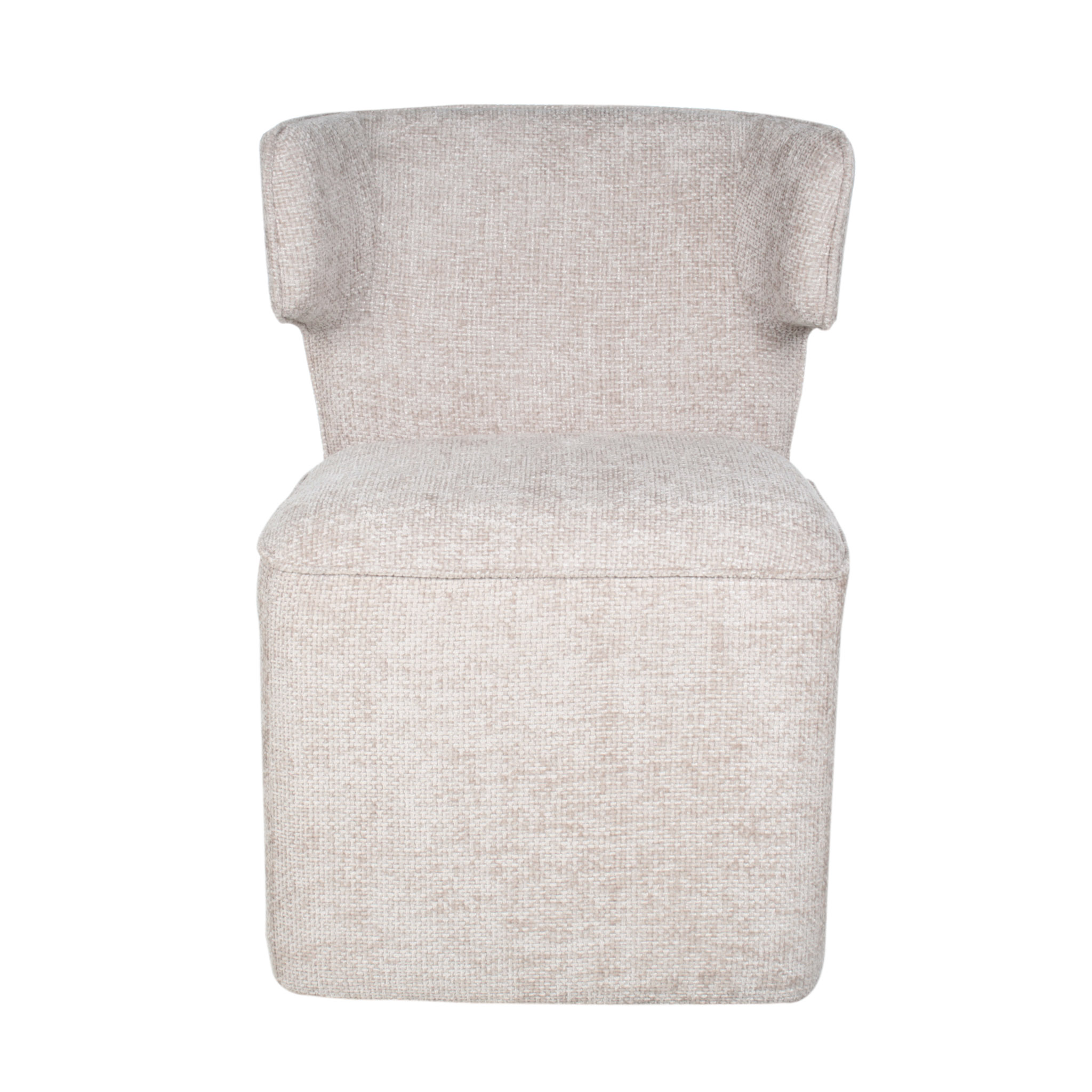 Silla de comedor de tela en tono champaña con ruedas, de diseño moderno. Su estilo limpio y sofisticado aporta frescura y comodidad a cualquier comedor, ideal para un ambiente elegante y contemporáneo.