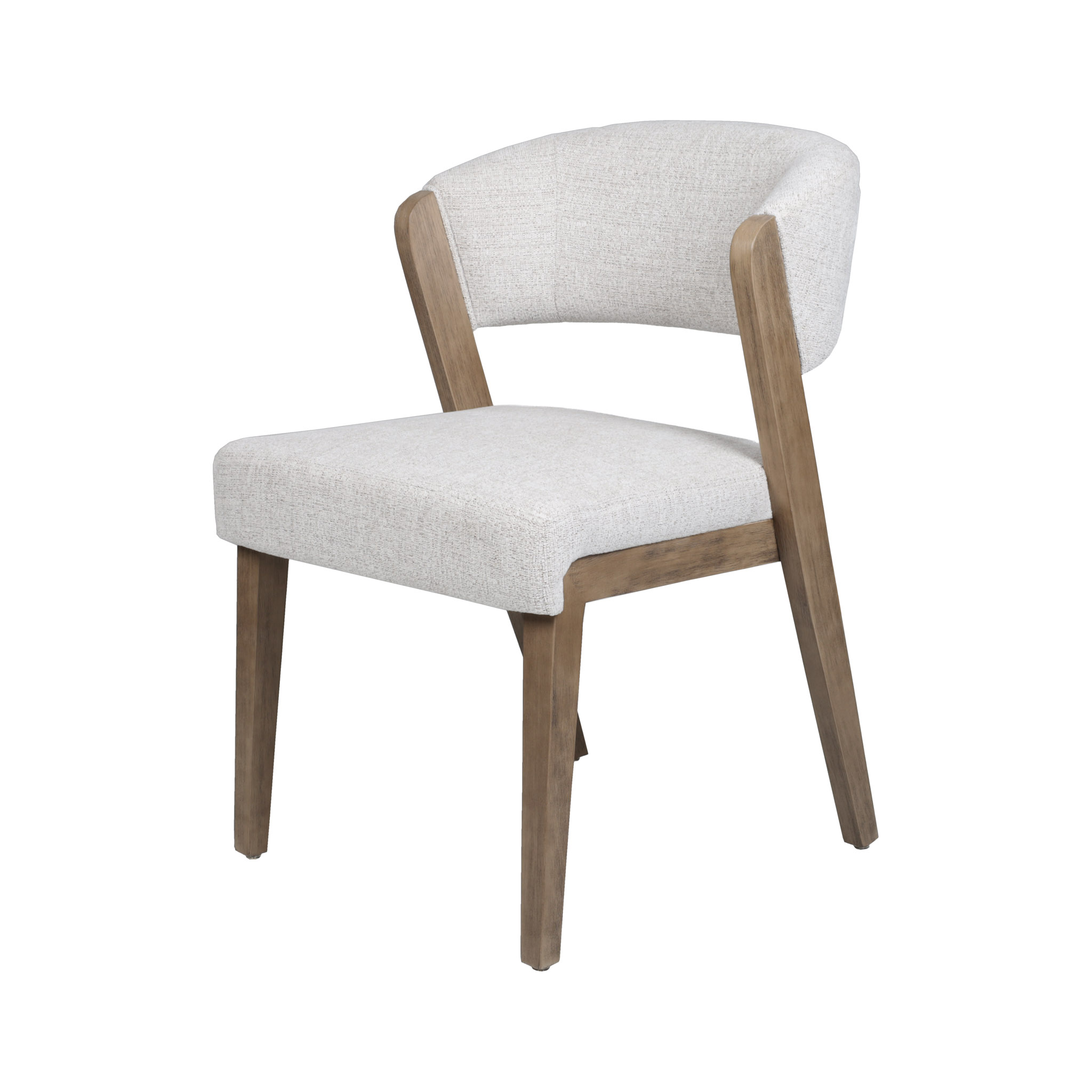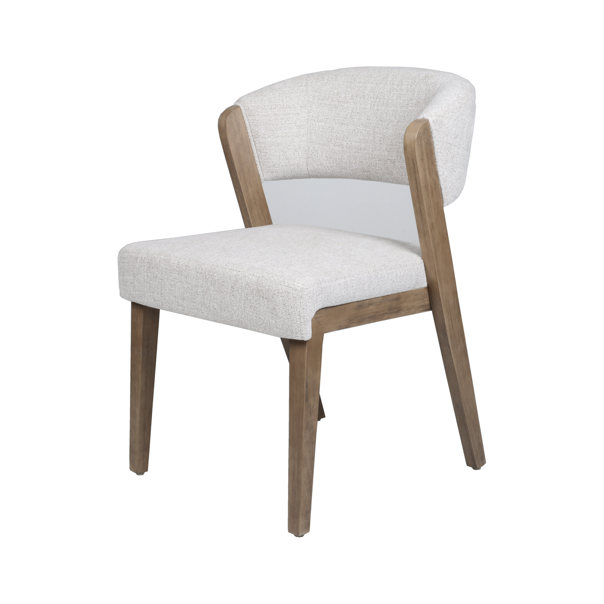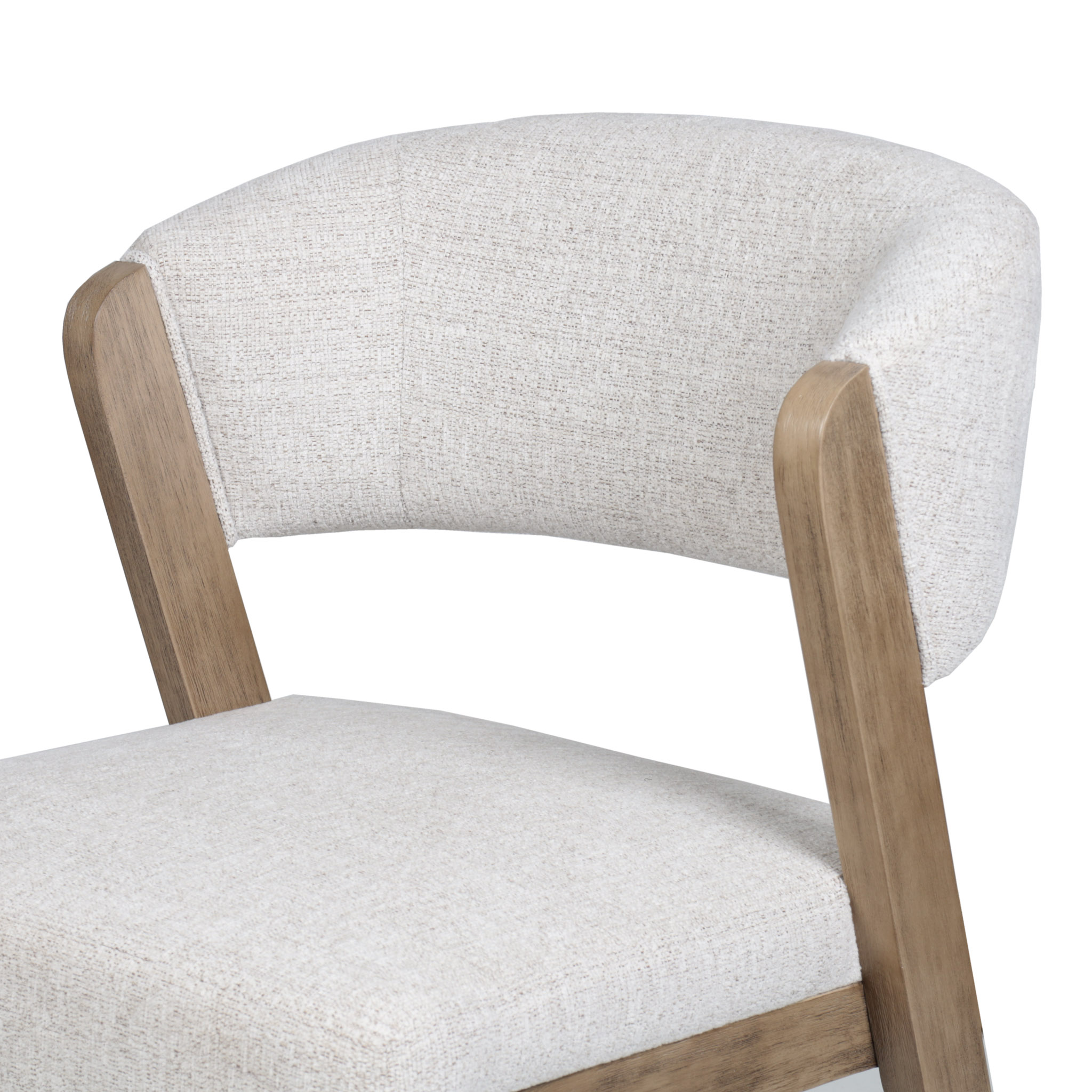 Moderna silla con tapiz en tono ivory con delicados hilos crema, y patas de madera natural.