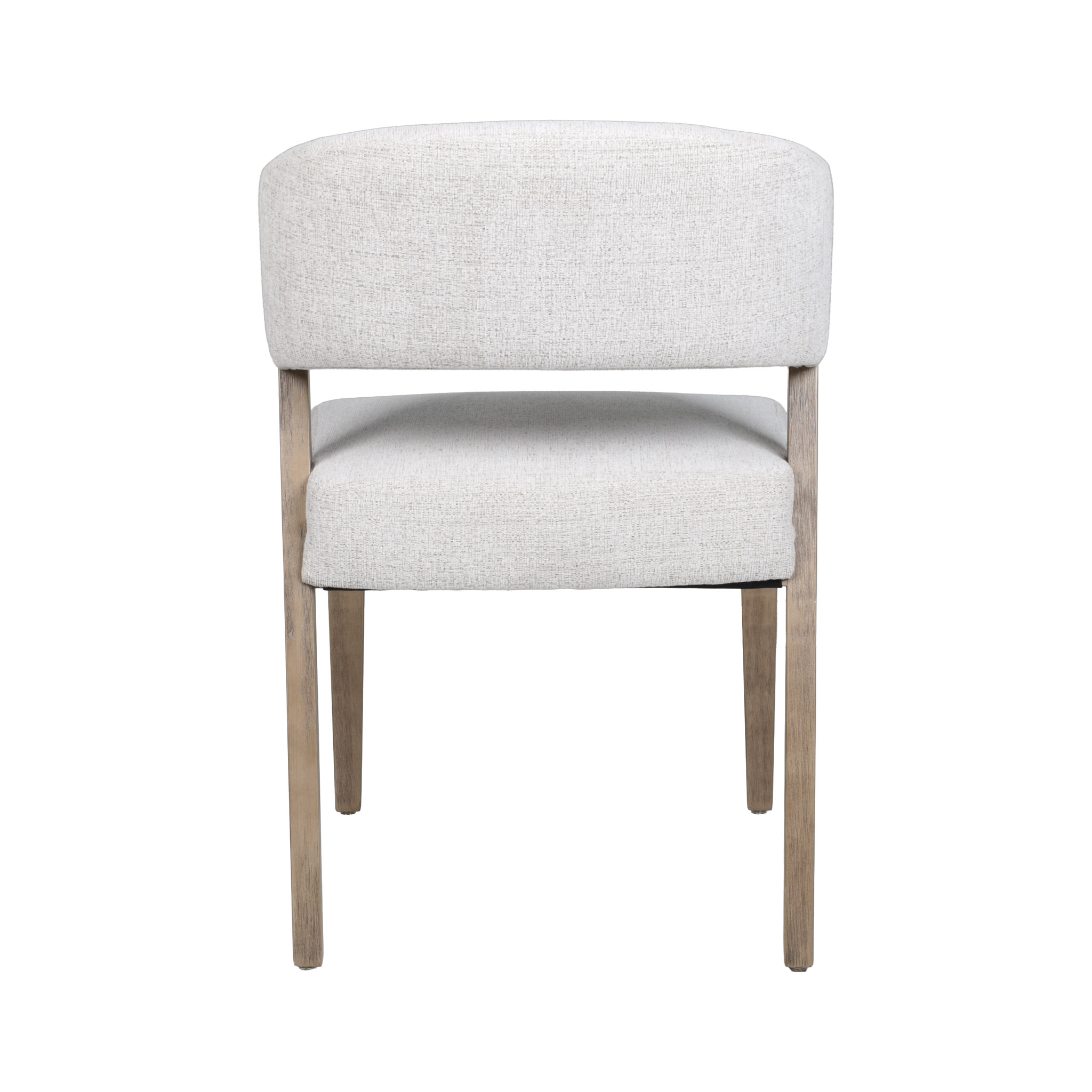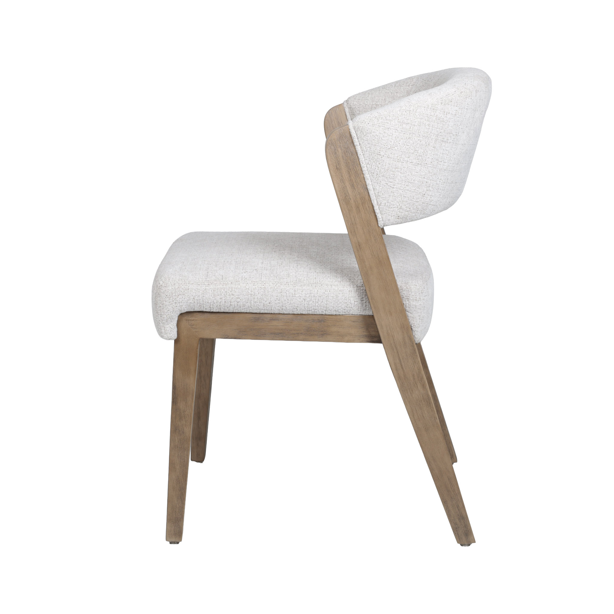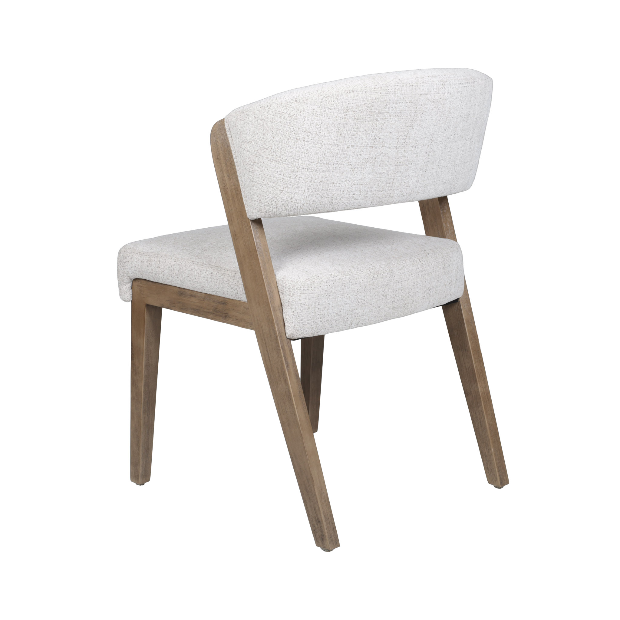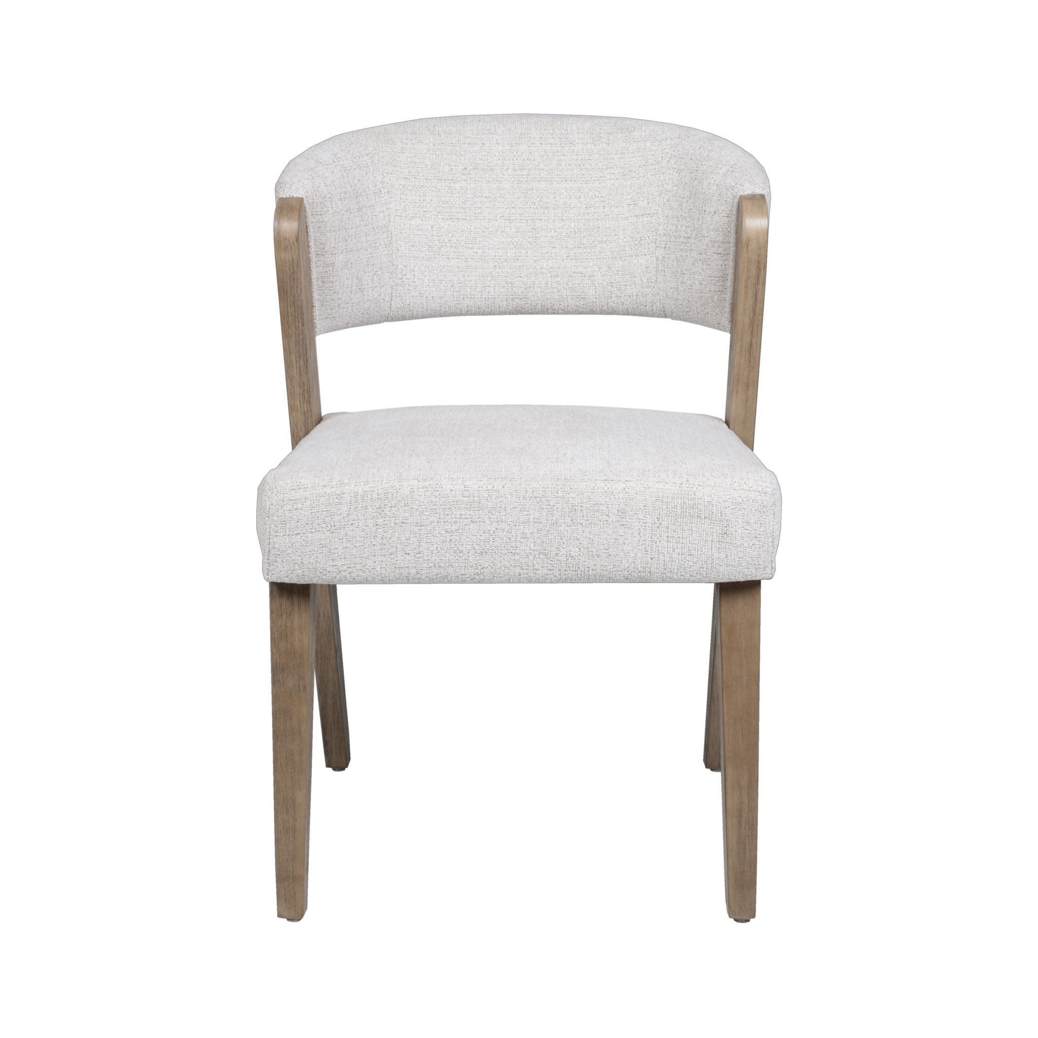 Moderna silla con tapiz en tono ivory con delicados hilos crema, y patas de madera natural.