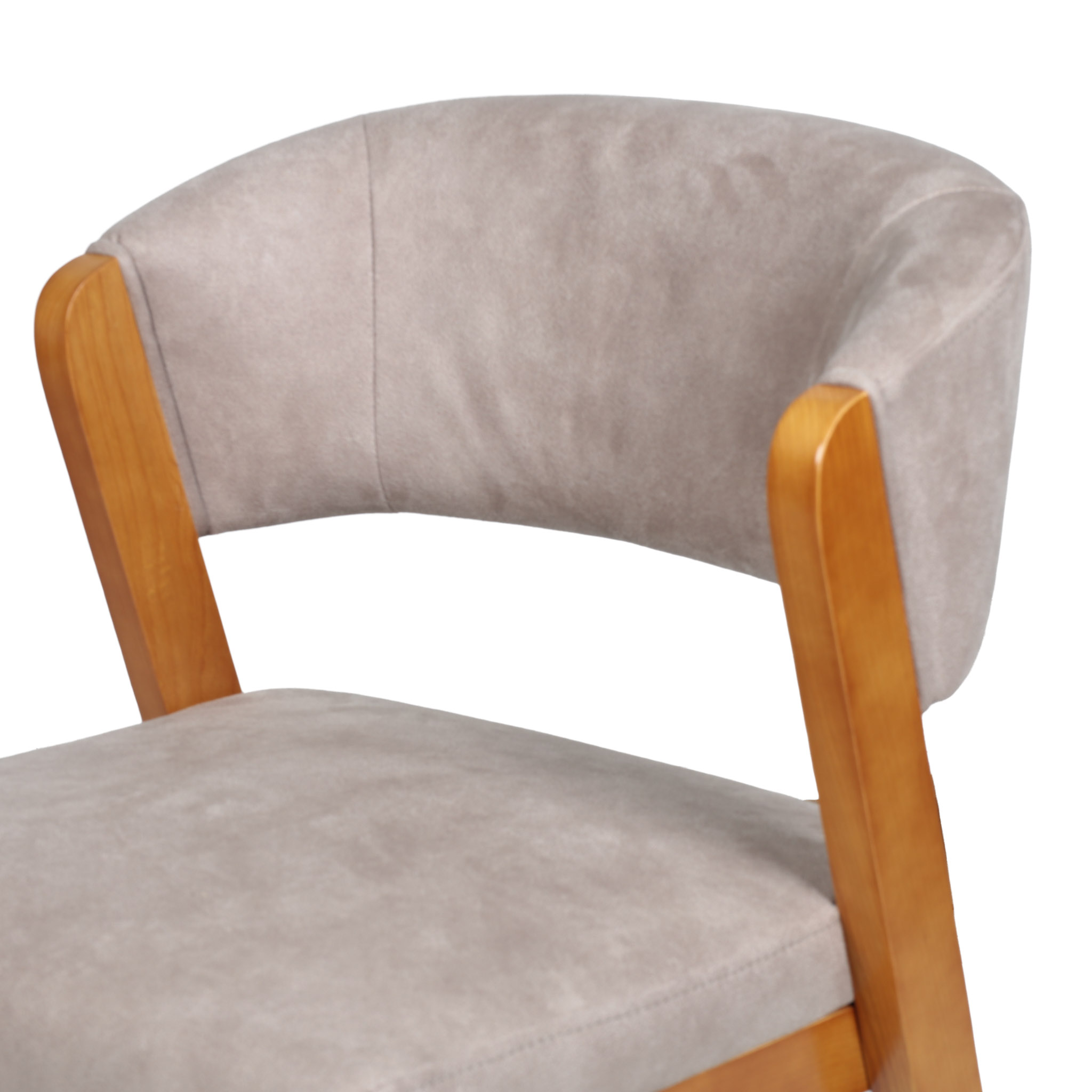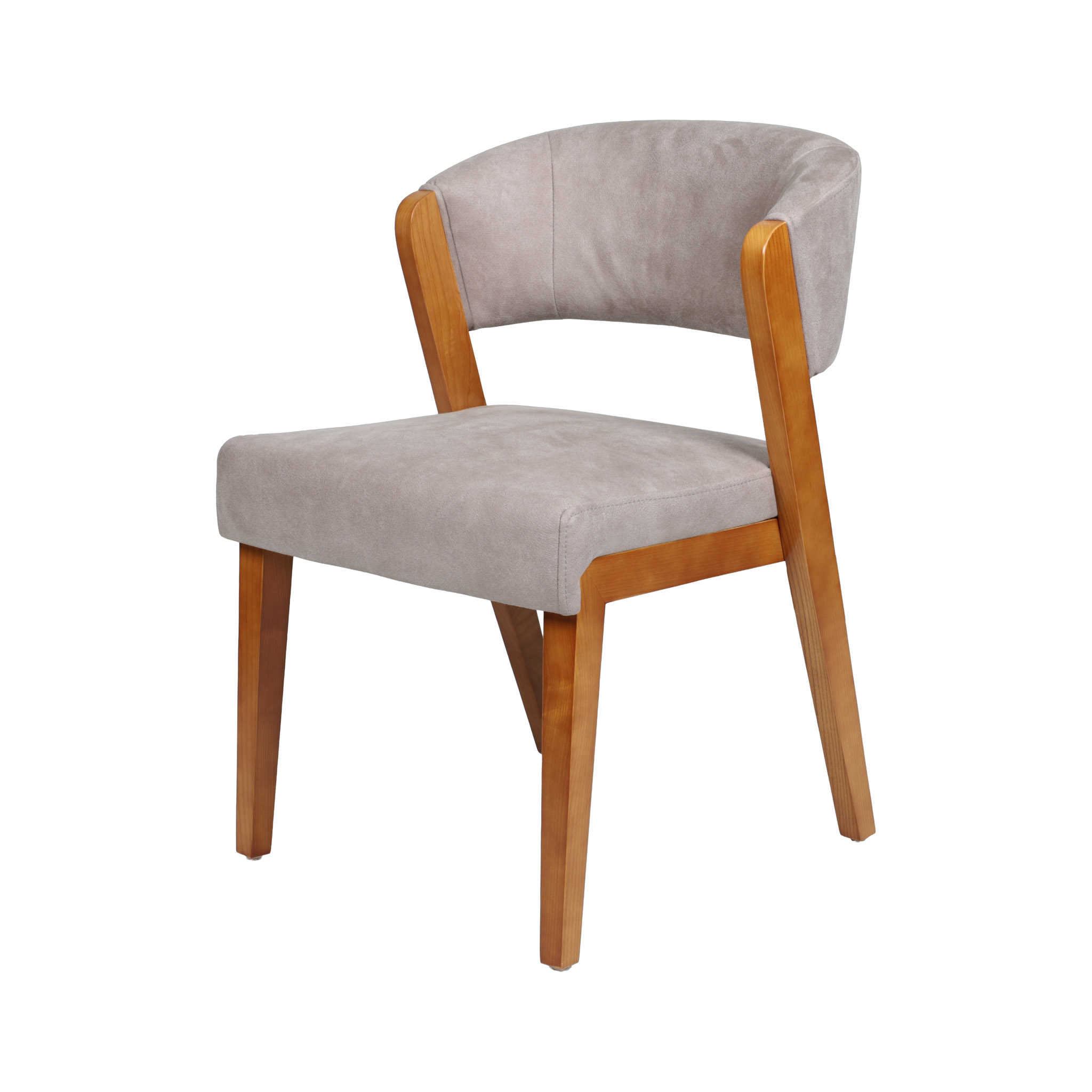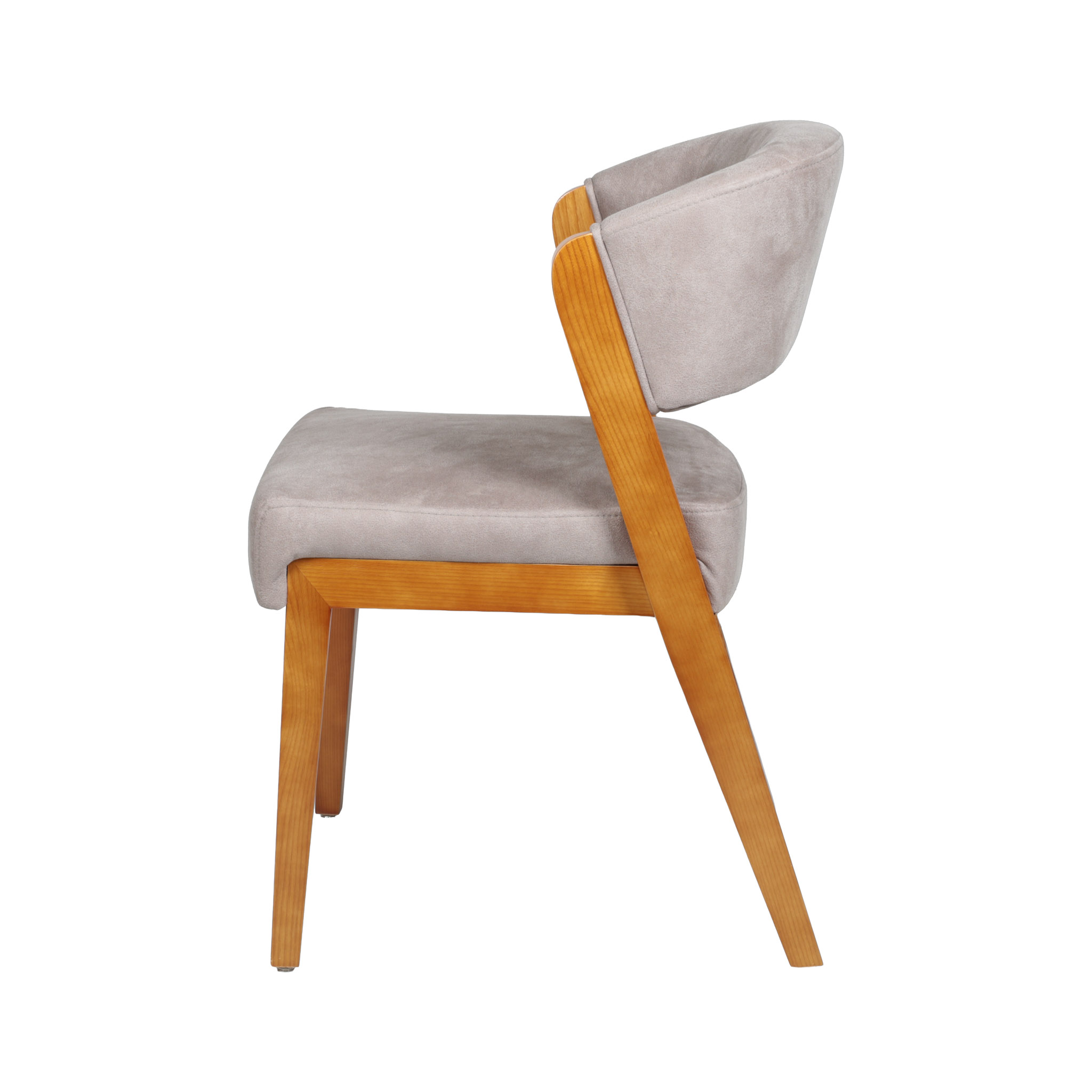 Moderna silla con tapiz en tono gris, y patas de madera con acabado almendra.
