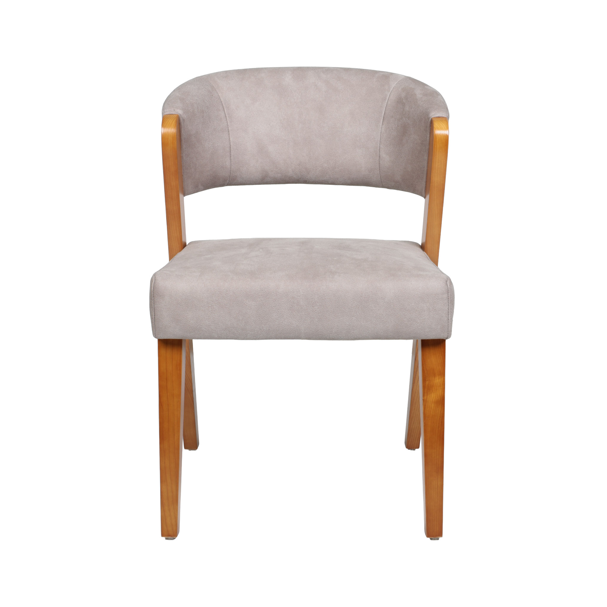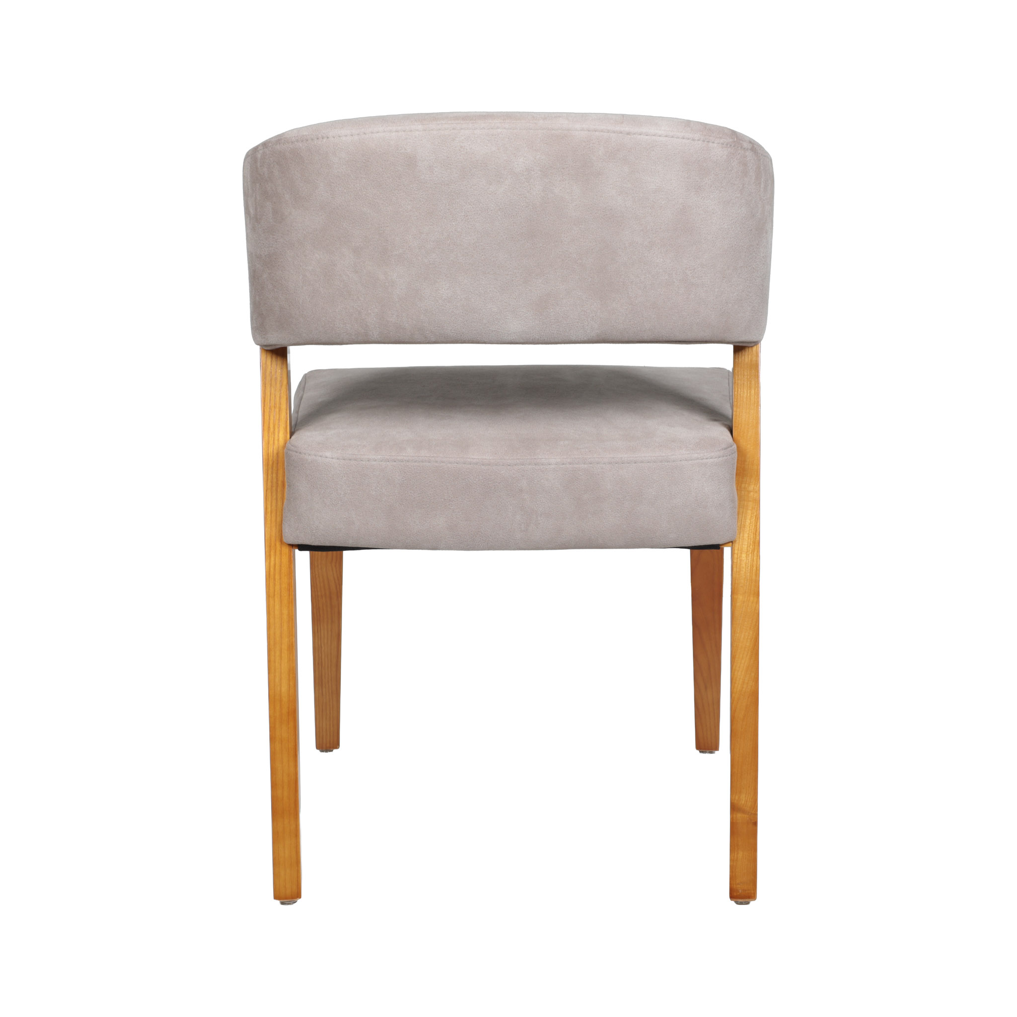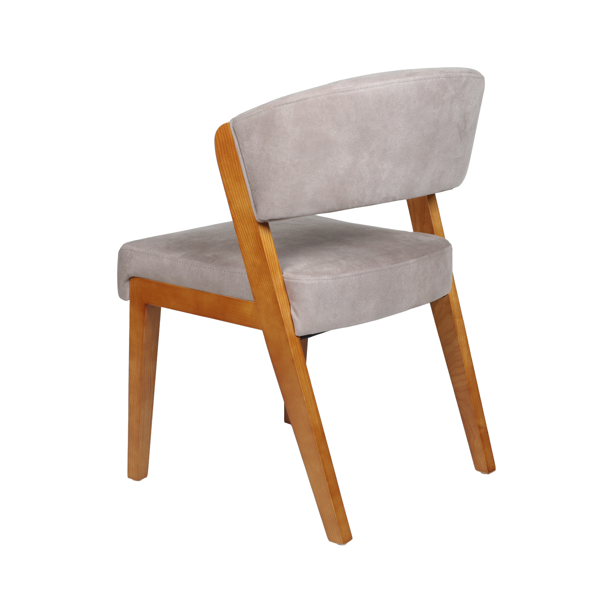 Moderna silla con tapiz en tono gris, y patas de madera con acabado almendra.