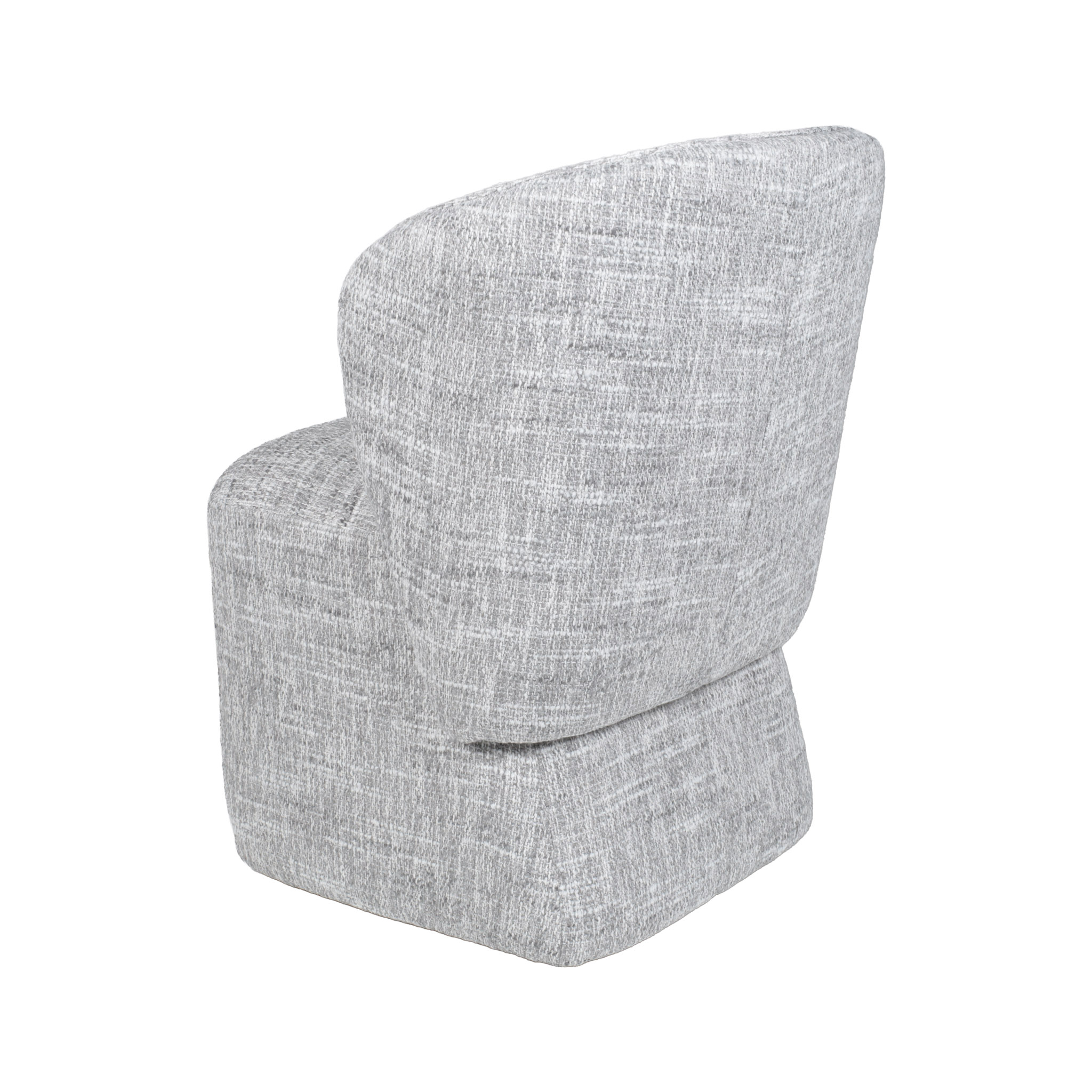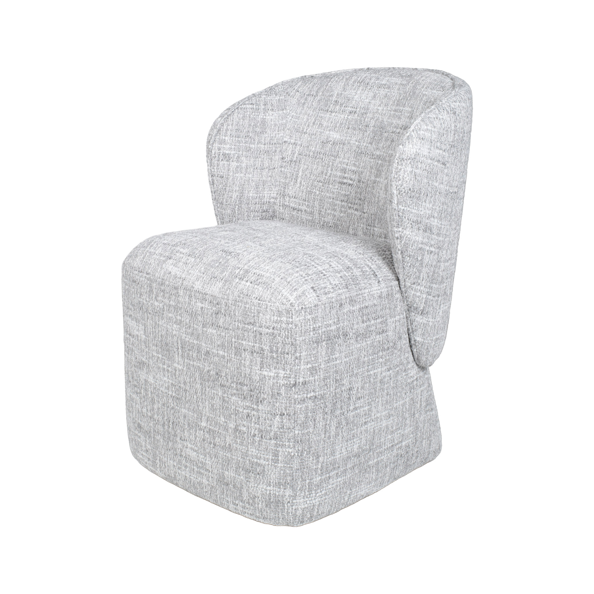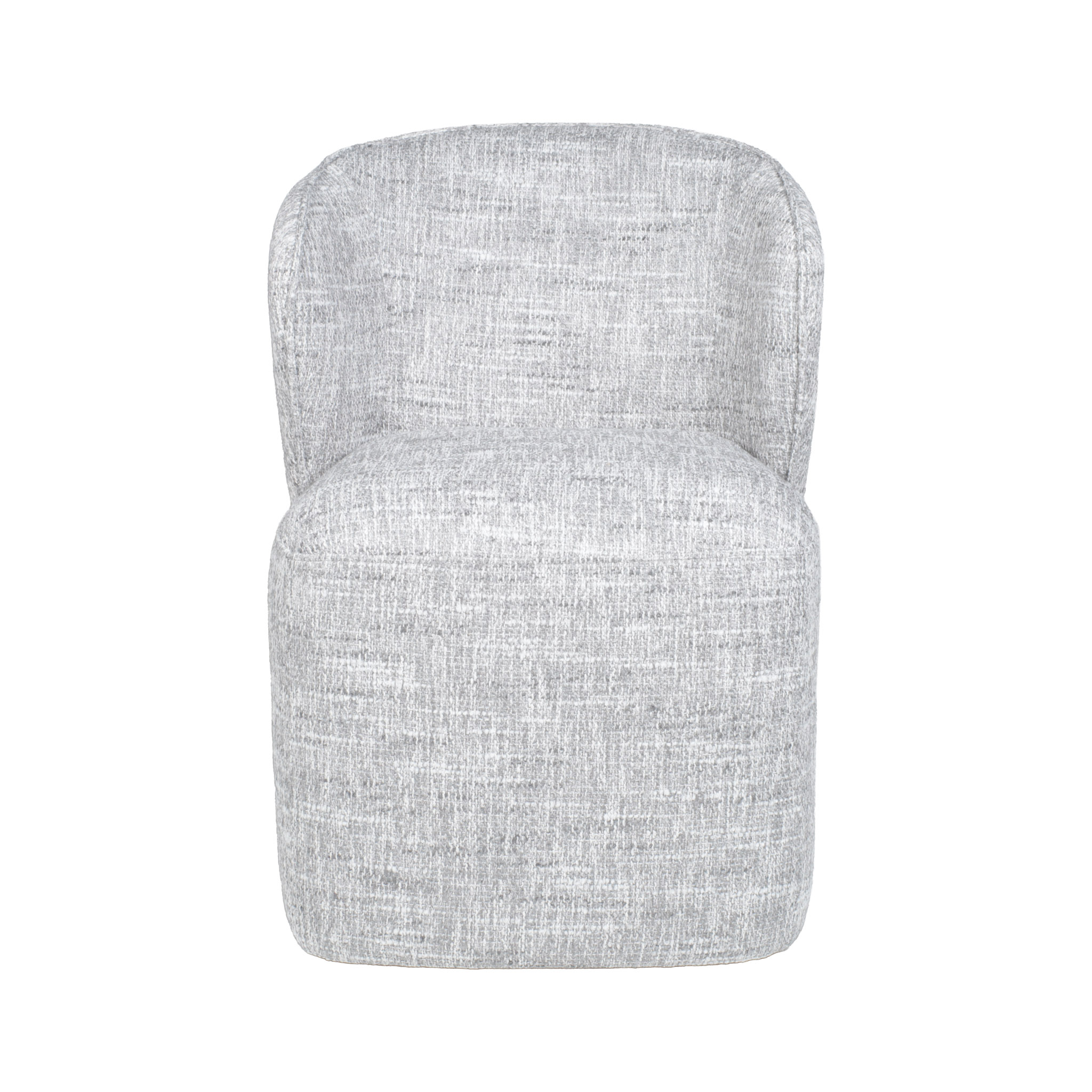 Funcional silla de comedor de tela texturizada en tono gris con blanco, y ruedas.