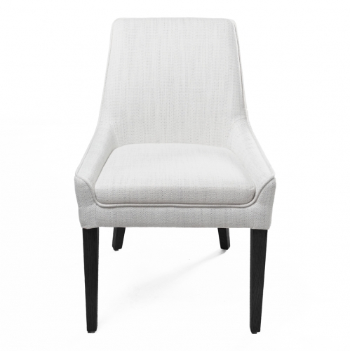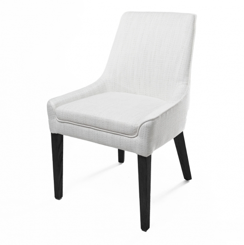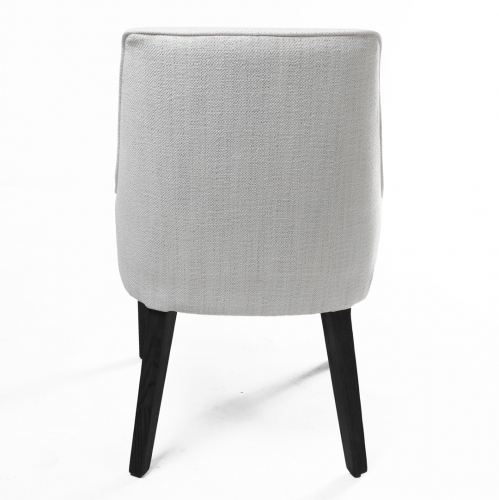 Silla de comedor de tela en color blanco con hilos en color gris y patas de madera en color negro.