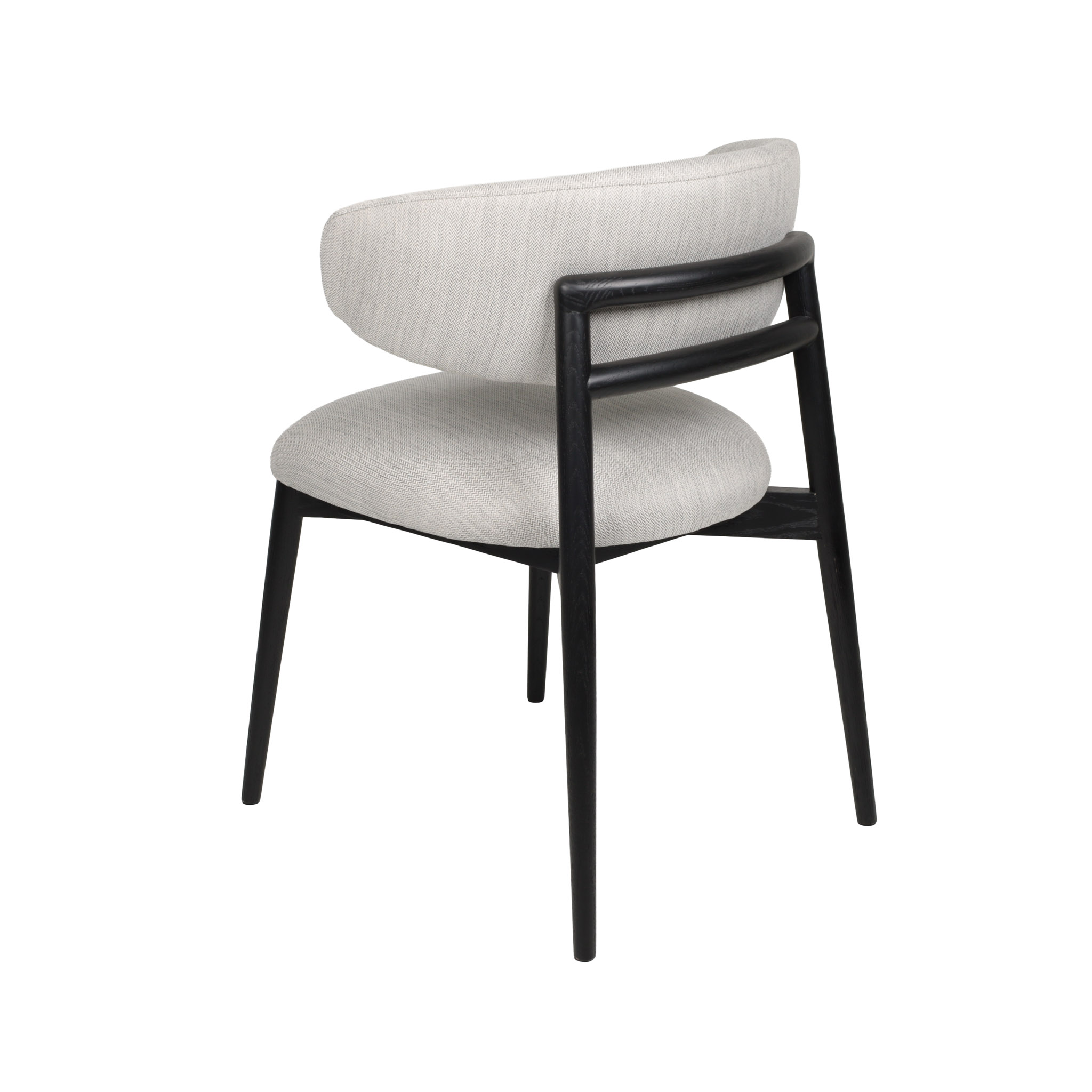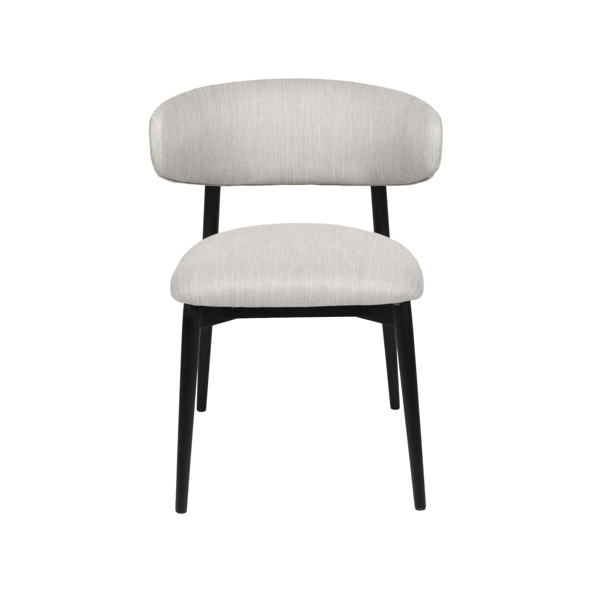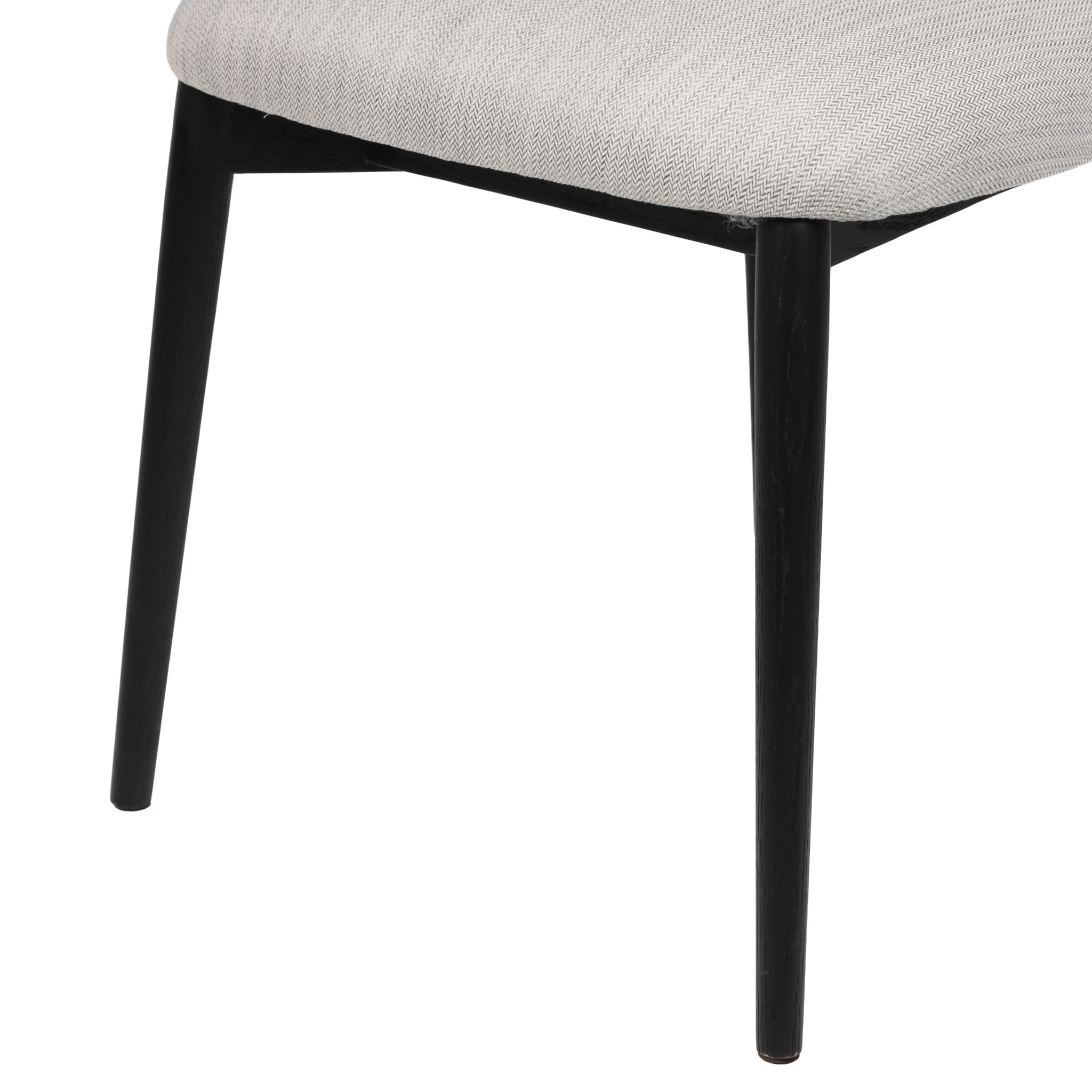 Silla de comedor con asiento y respaldo de tela en color gris claro, y patas de madera en color negro.